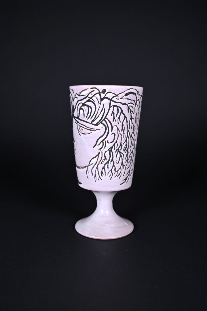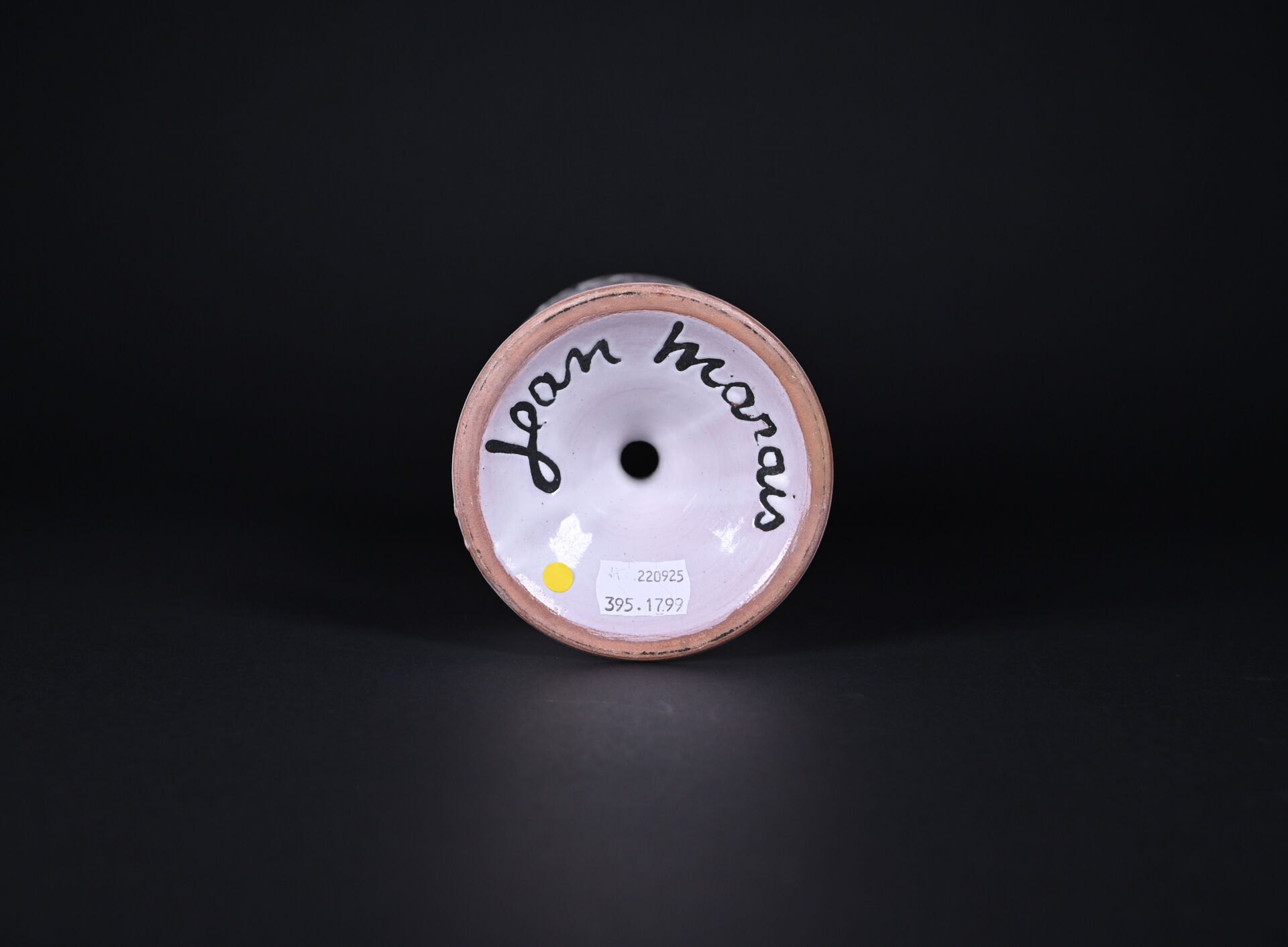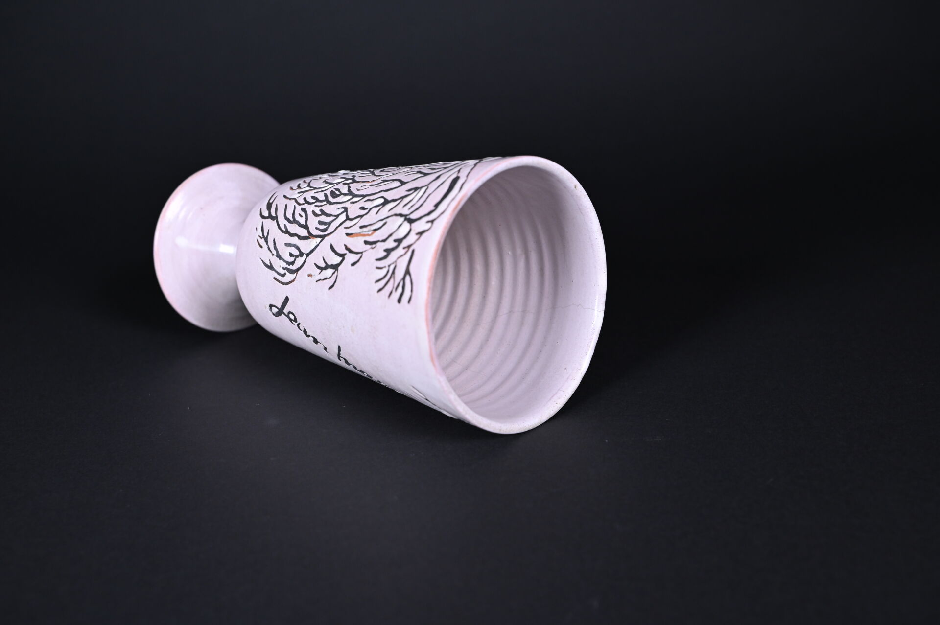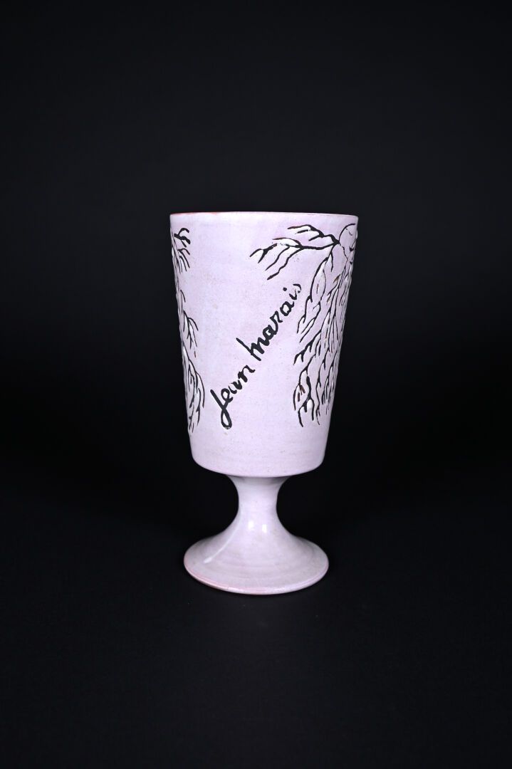 Jean MARAIS (1913-1998). Vase tronconique sur piédouche en céramique émaillée crème à décor de visage d’homme et arbre, signé sur le décor et au dessous (fèle et cheveux). Haut. : 23,5 cm.