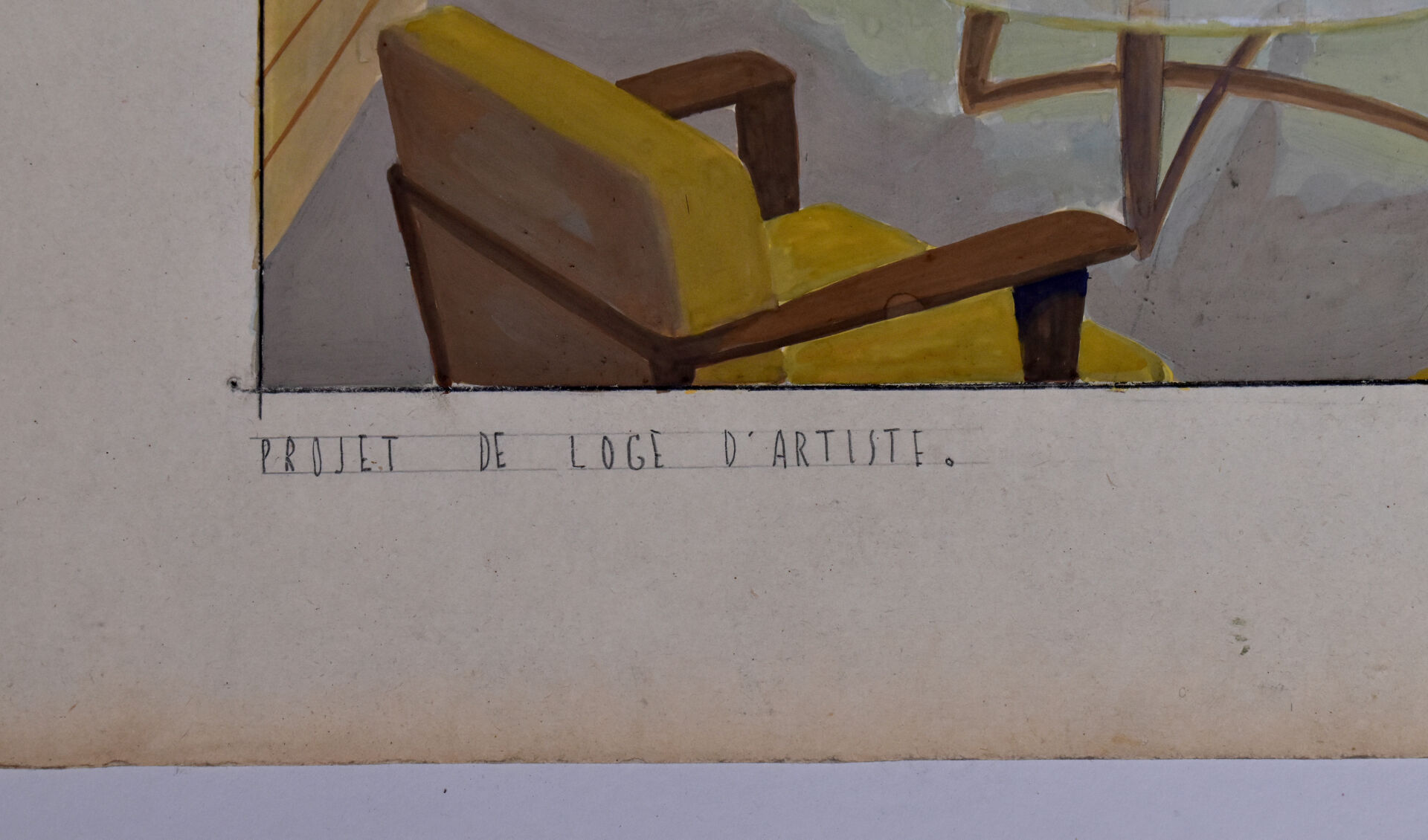 Jean-Marie LAFLEUR (1902-1985). « Projet de loge d’artiste ». Dessin d’architecte d’intérieur sur carton, signé et daté 1949 en bas à droite, titré en bas à gauche. Dim. de la feuille : 49 x 64 cm.