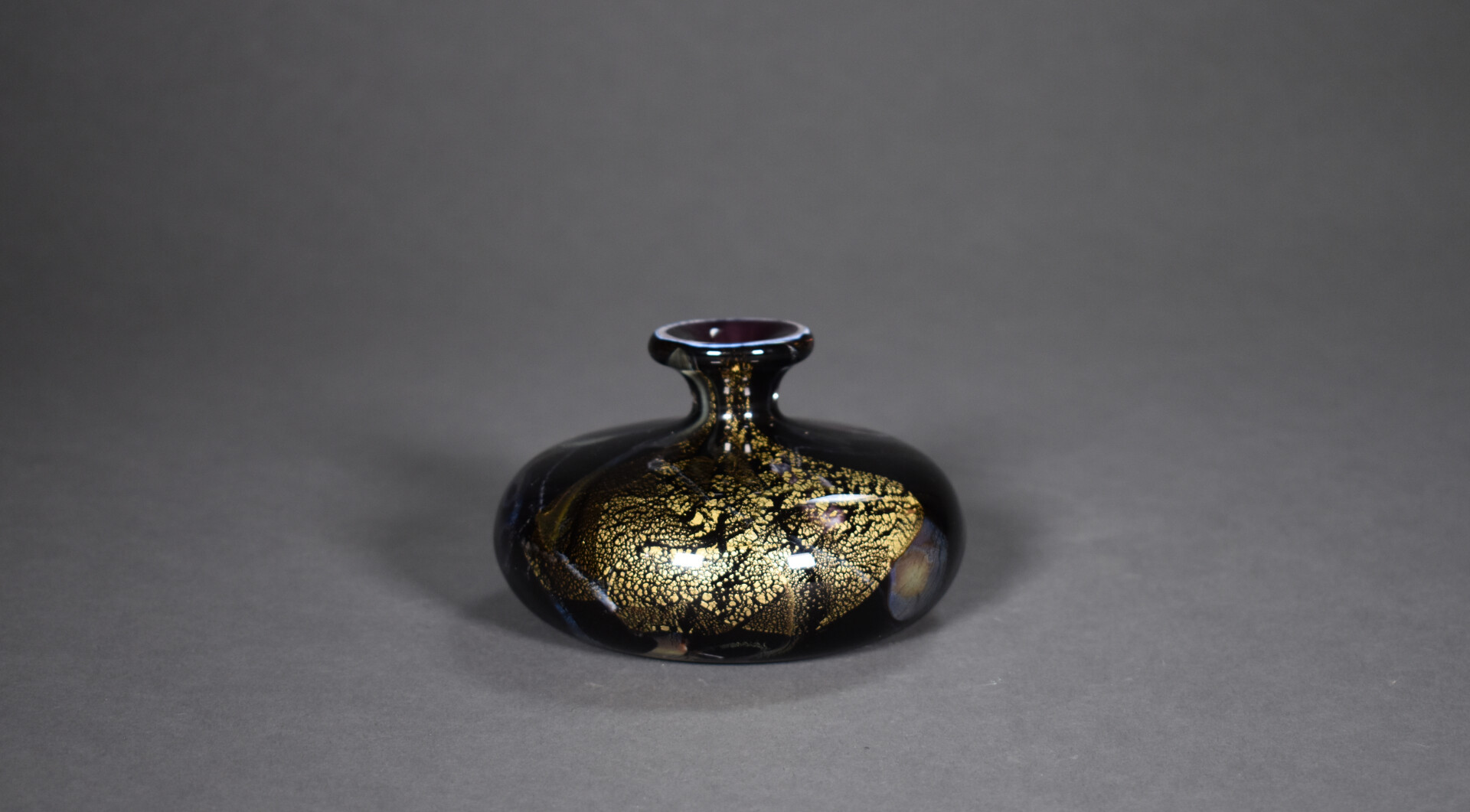 Jean-Michel OPERTO (Né en 1975). Vase à col étranglé en verre multicouches noir à paillons or. Signé sous la base. Haut. : 8,5 cm.