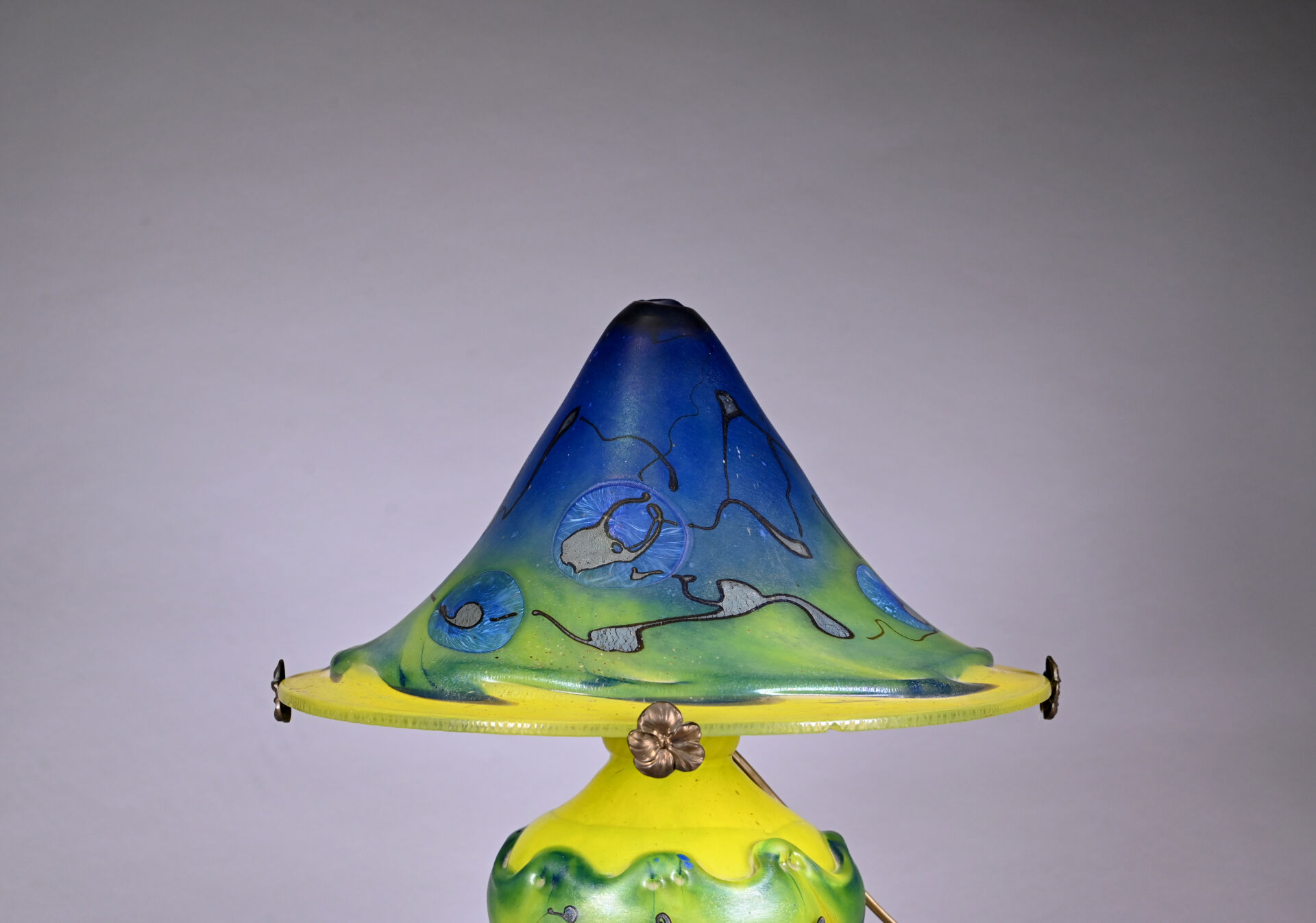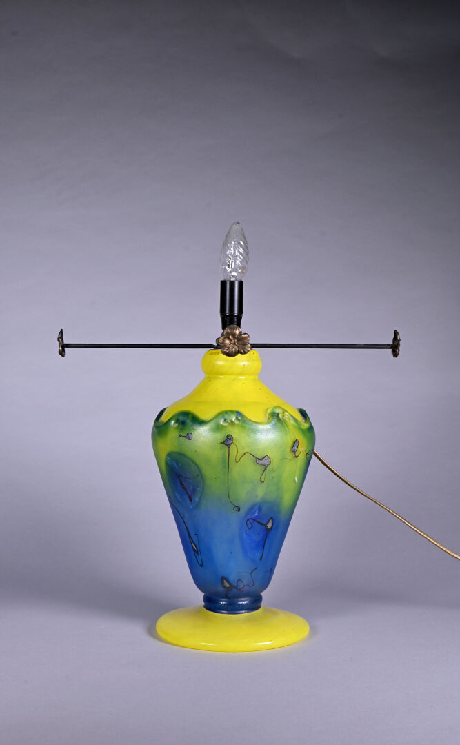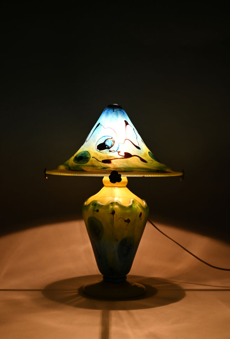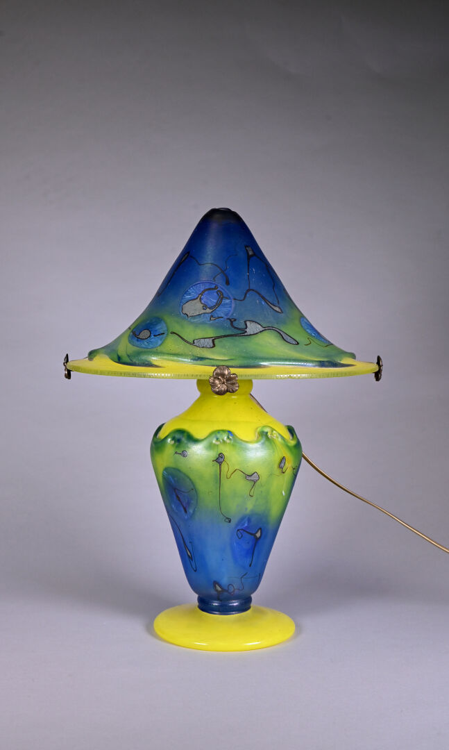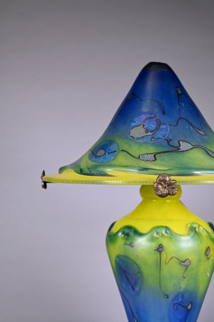 Jean-Pierre MATTEUS (XXe siècle). Lampe champignon en verre marmoréen jaune vert, bleu et multicouche. Signée et datée 2002 au dessous. Haut. : 53 cm.