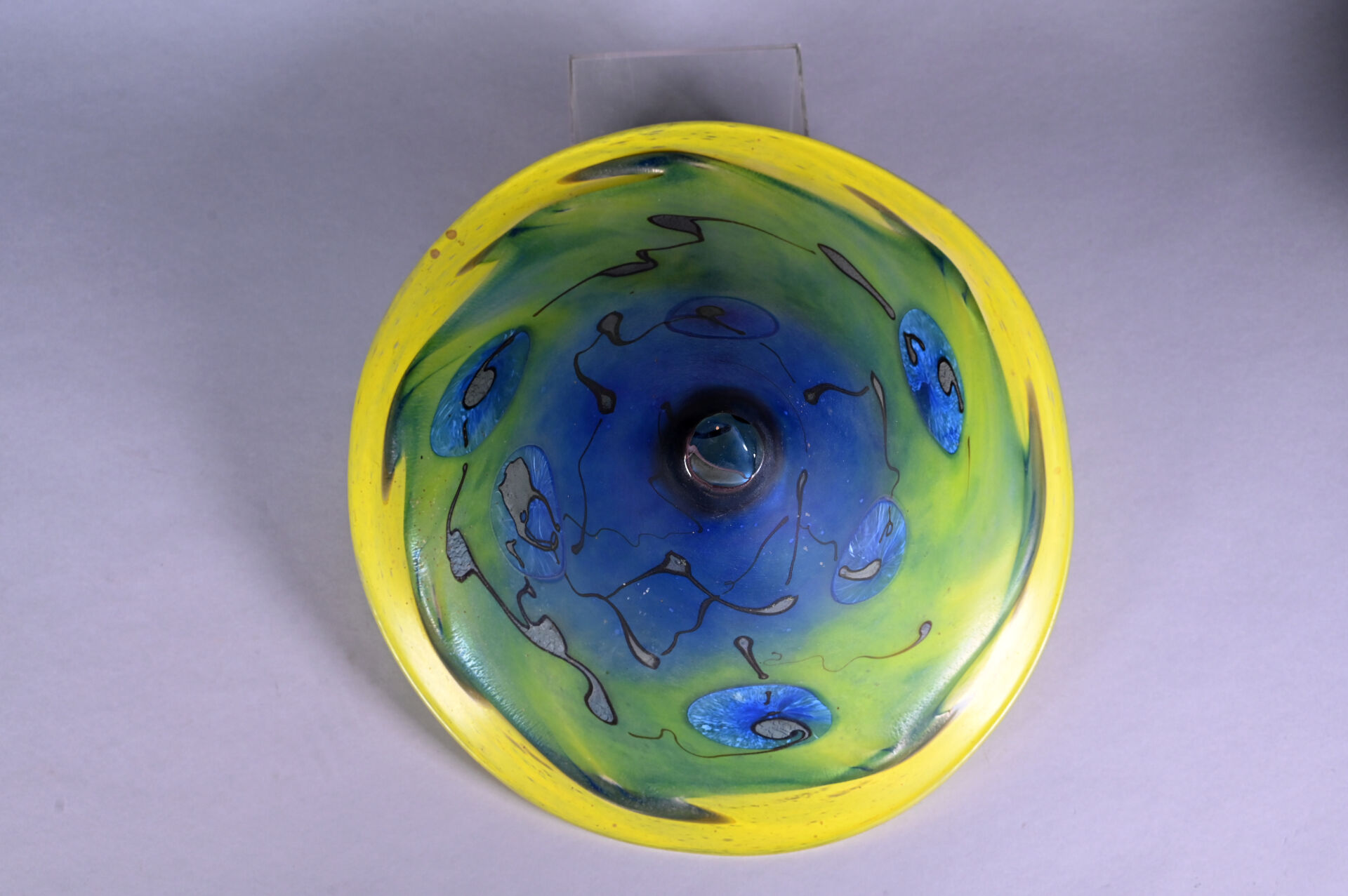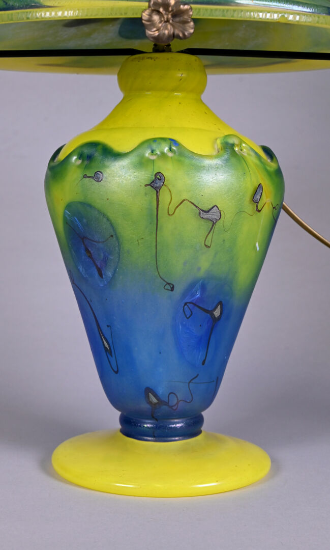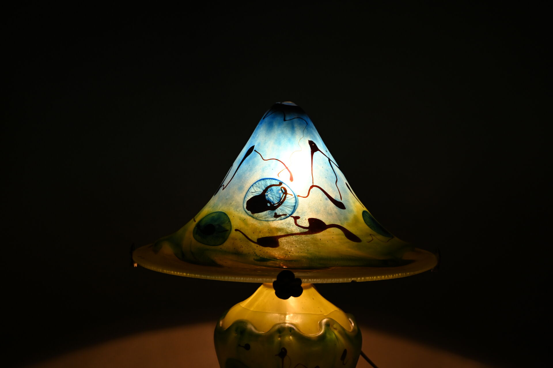 Jean-Pierre MATTEUS (XXe siècle). Lampe champignon en verre marmoréen jaune vert, bleu et multicouche. Signée et datée 2002 au dessous. Haut. : 53 cm.