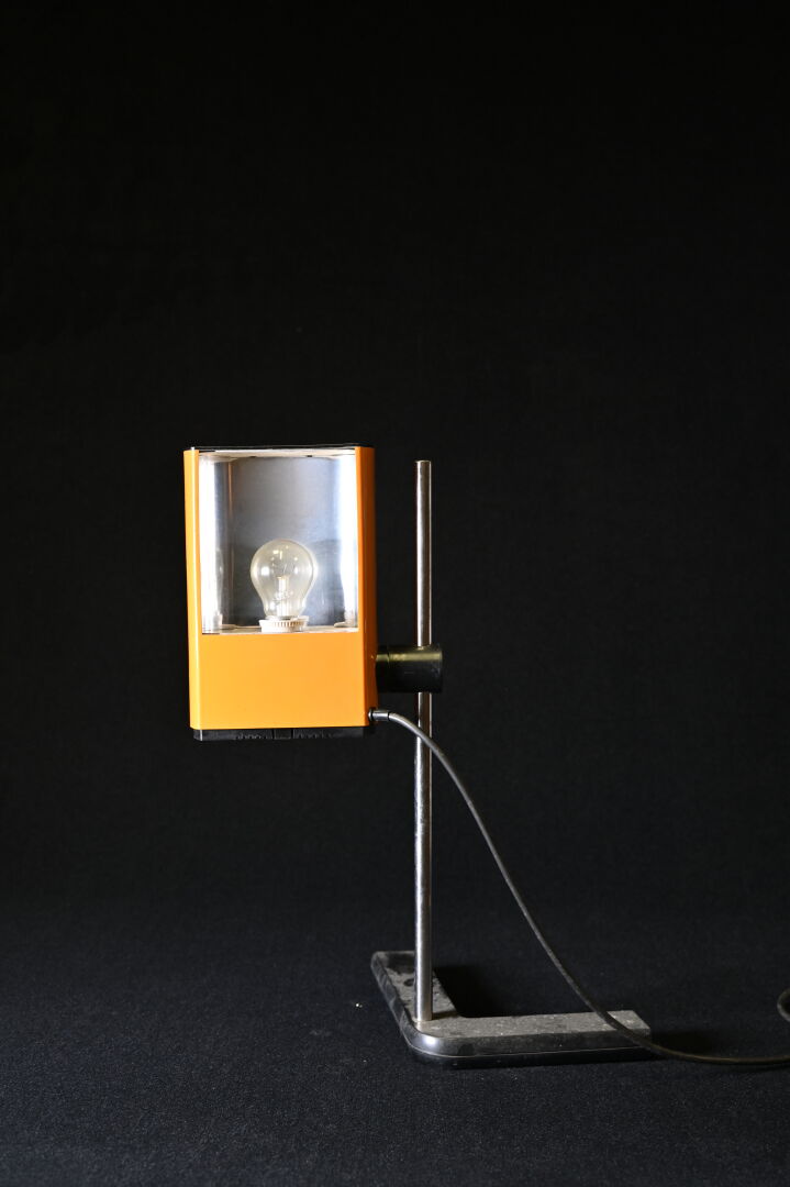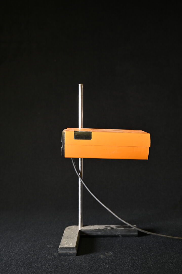 Jean-René TALOPP et Samp Design. Lampe de la collection Manade en plastique noir et orange. Hauteur ajustable. Haut. du fût : 52 cm.