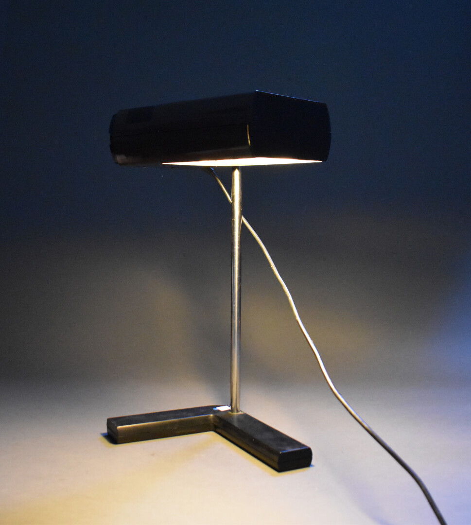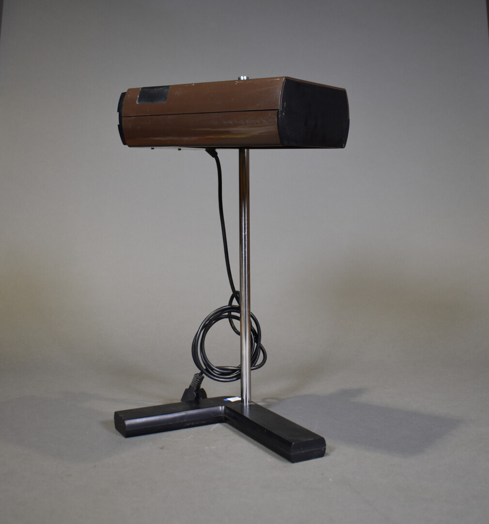Jean-René TALOPP (XXe siècle) pour SAMP LITE. Lampe à poser collection Manade en plastique brun et métal. Haut de l’éclairage ajustable. Haut. : 52 cm.