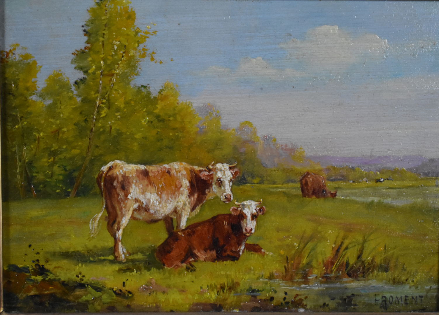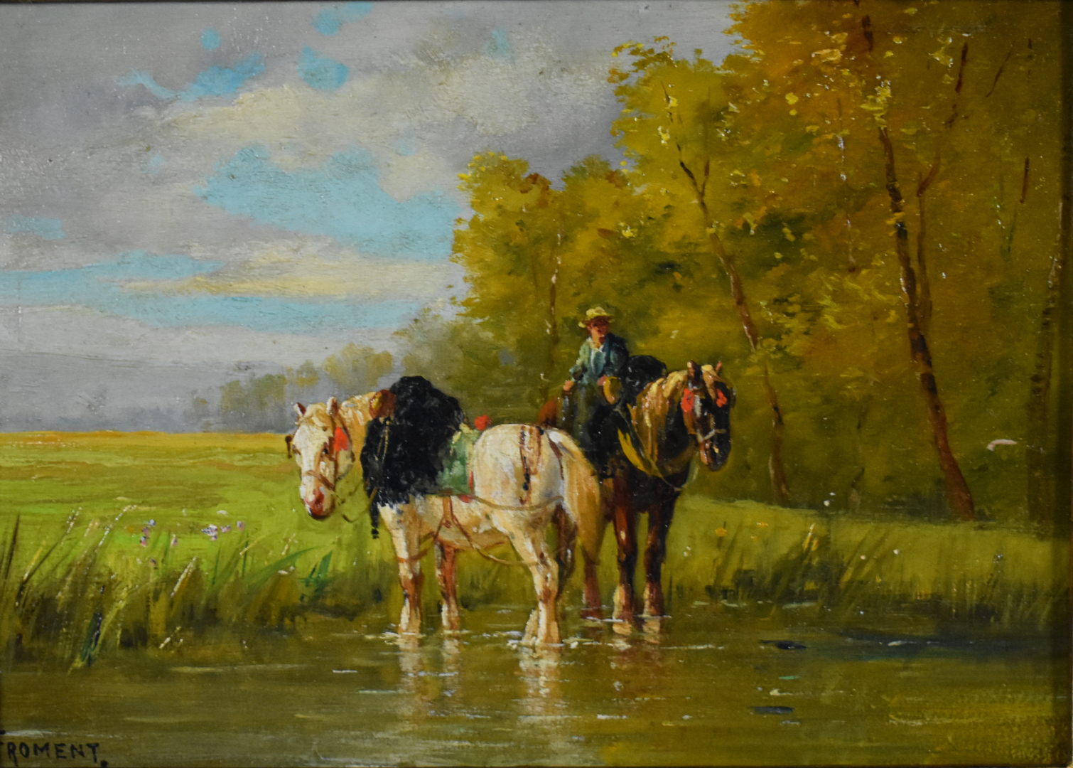 Jeanne FROMENT (XIXe-XXe siècle). Couple de vaches et Cavalier avec chevaux à la rivière. Deux huiles sur panneau formant pendant, l’une signée en bas à droite et l’autre en bas à gauche. 16 x 21,5 cm.