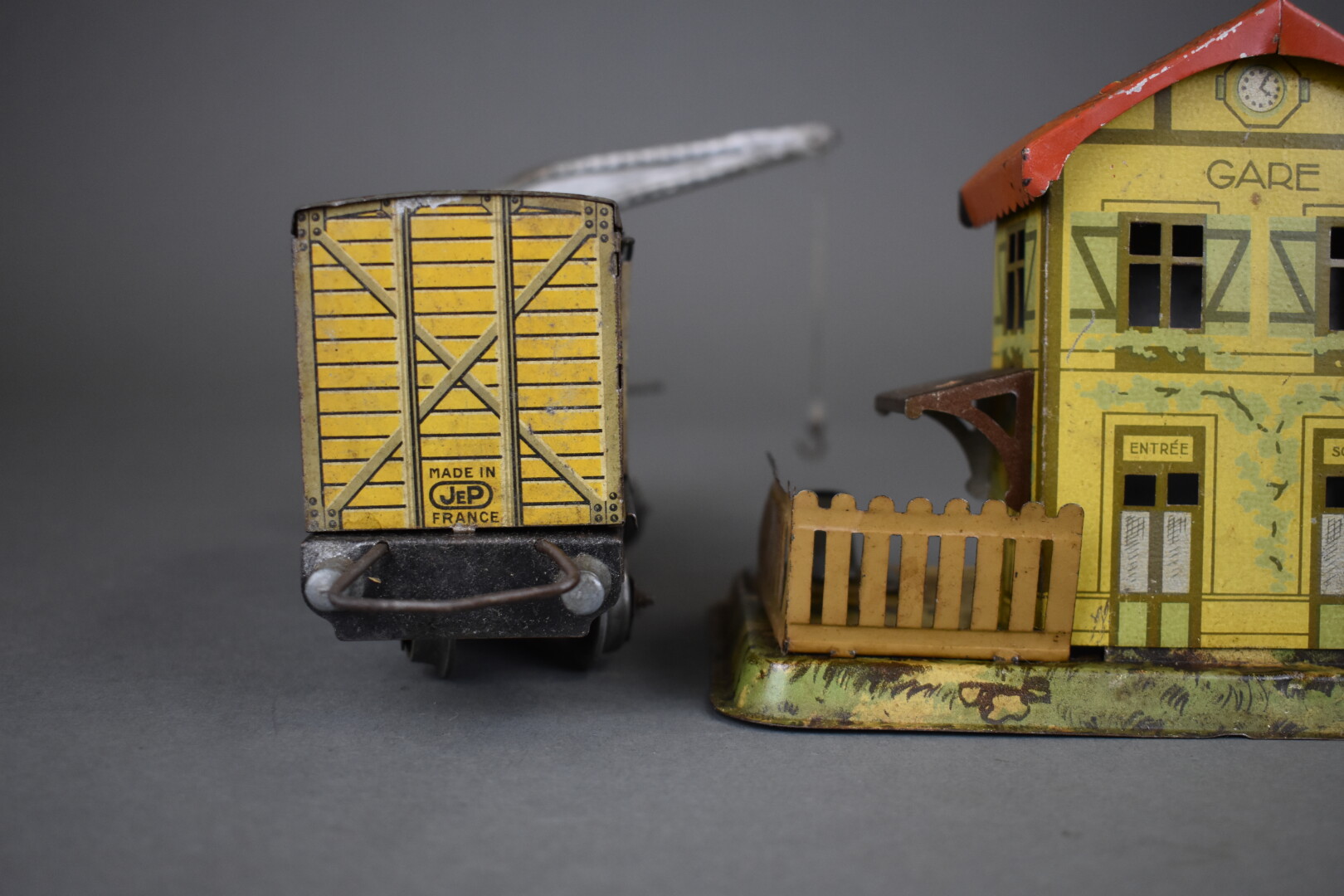 JEP. Wagon grue en tôle lithographiée et gare (usures). (écartement HO).
