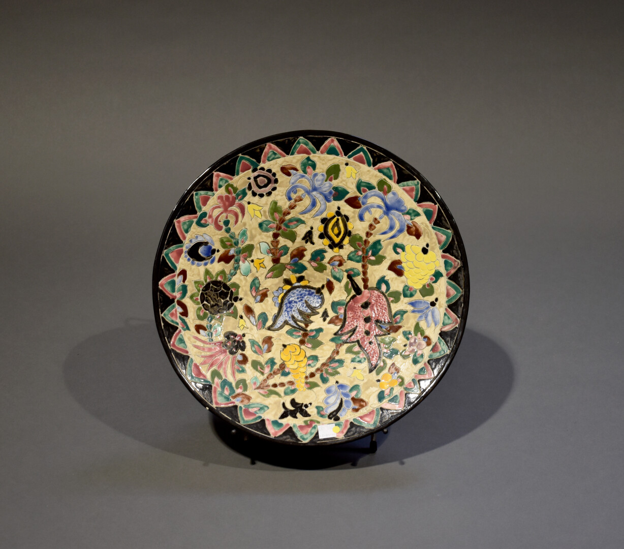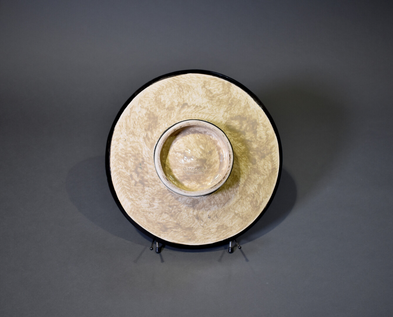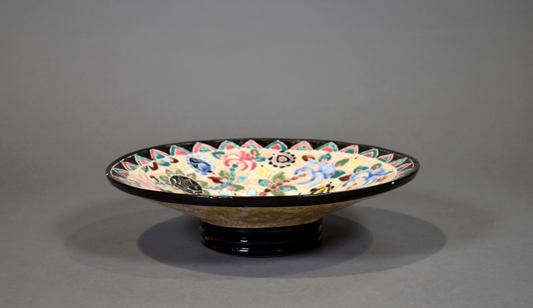 Jérôme MASSIER à Vallauris. Coupe sur piédouche en céramique émaillée à décor polychrome de fleurs sur fond beige. La bordure noire (éclats). Signée dans le décor et au dessous. Haut. : 10 cm – Diam. : 38 cm.