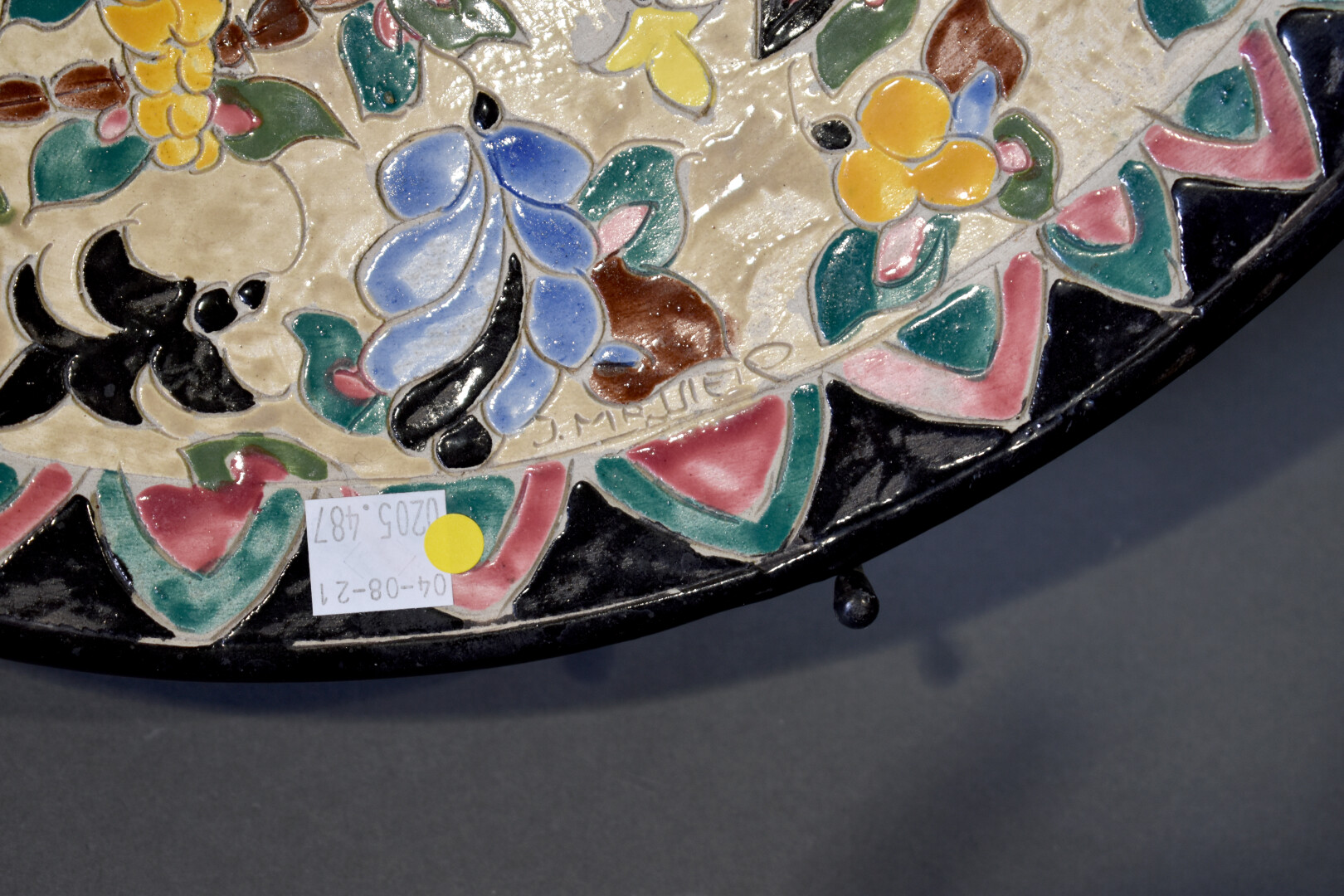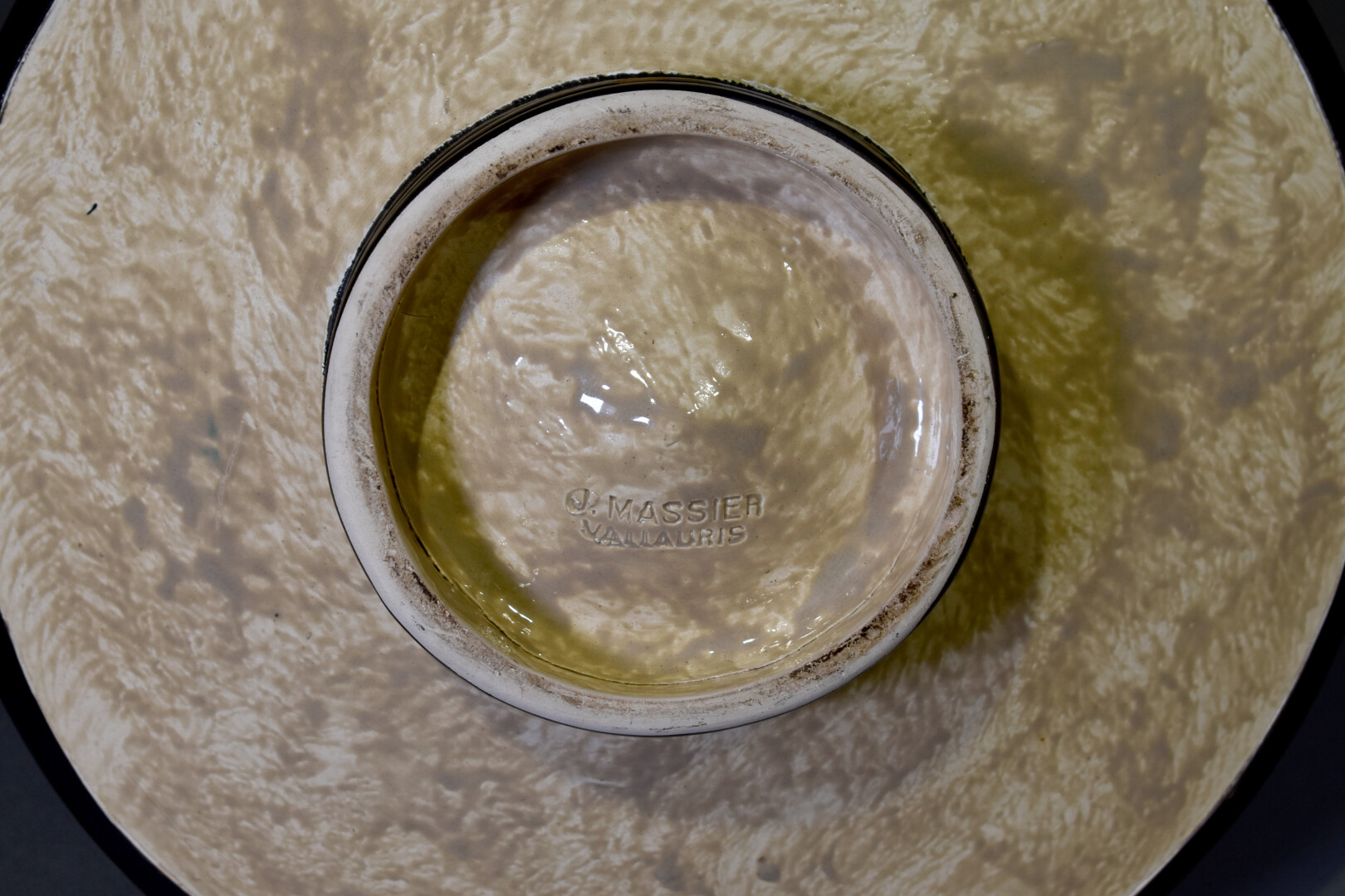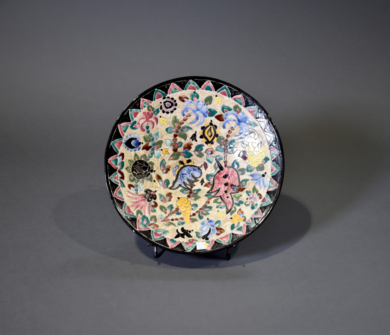 Jérôme MASSIER à Vallauris. Coupe sur piédouche en céramique émaillée à décor polychrome de fleurs sur fond beige. La bordure noire (éclats). Signée dans le décor et au dessous. Haut. : 10 cm – Diam. : 38 cm.