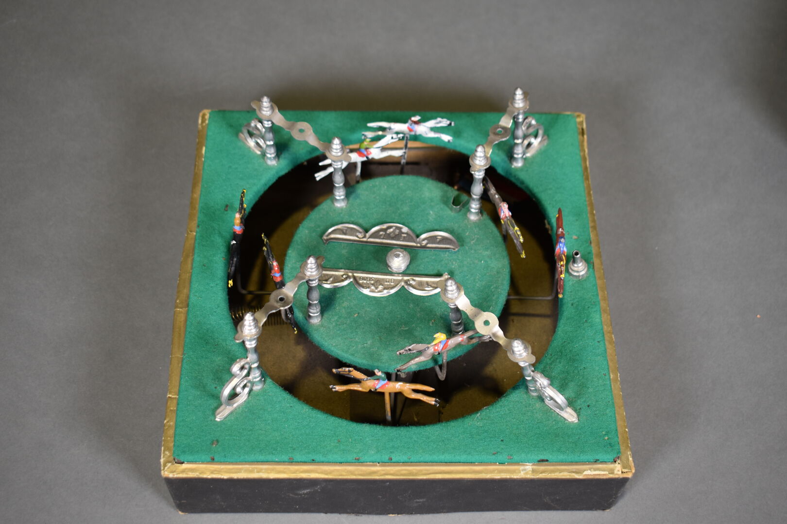 Jeu de course de chevaux à impulsion et huit chevaux. Fabrication française, vers 1890/1900. Dans une boîte Haut. : 16 cm – Larg. : 26 cm – Prof. : 26 cm. État d’usage avec manques.