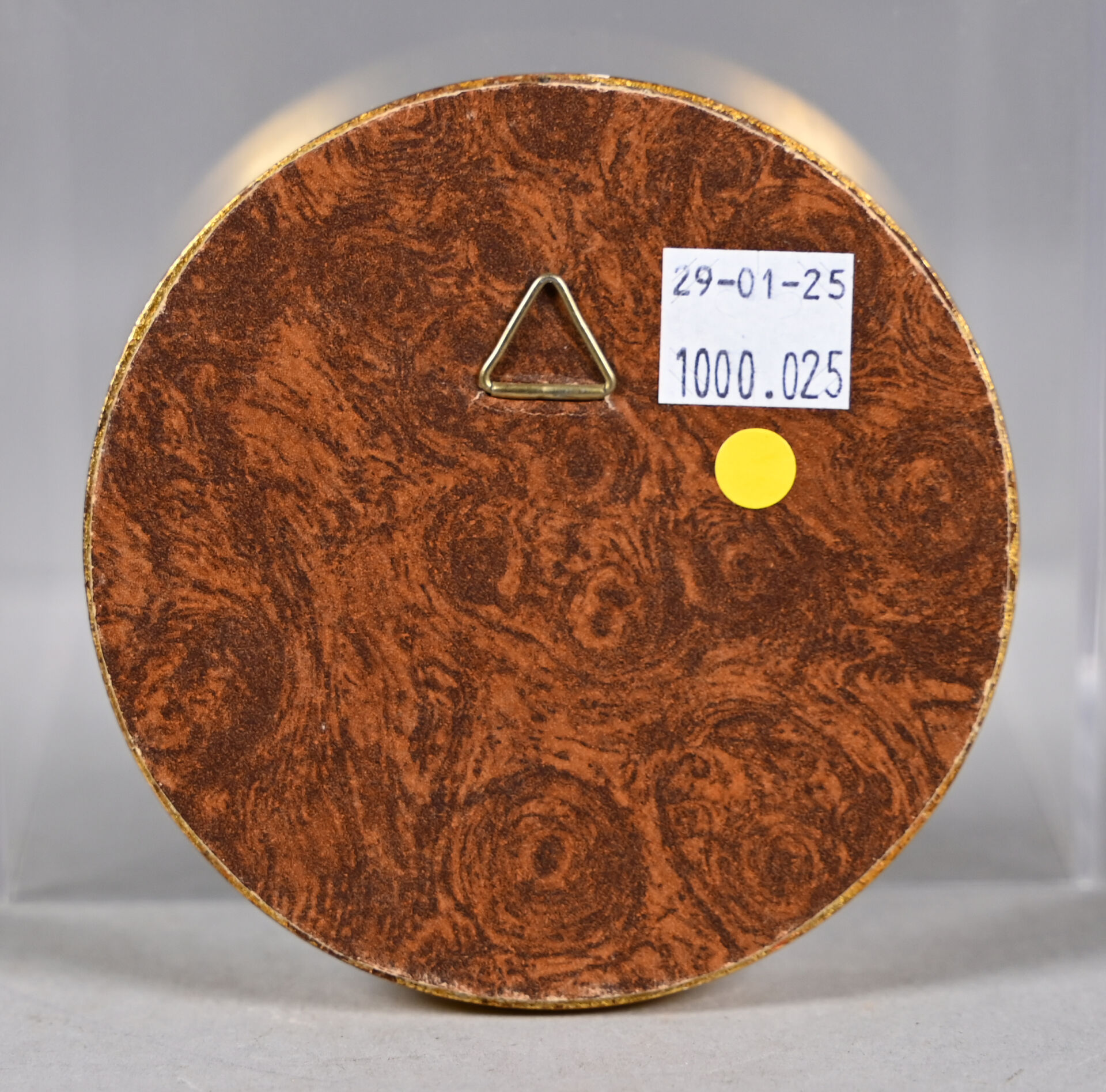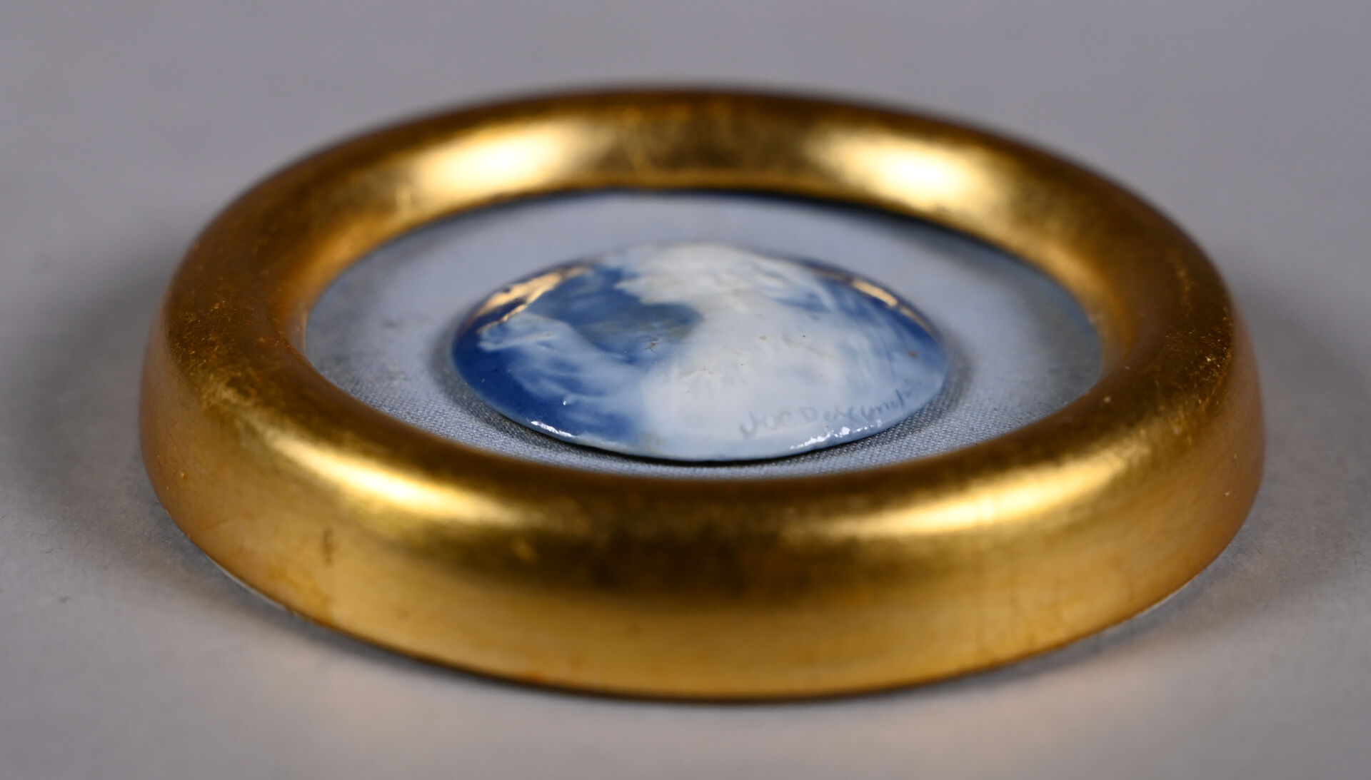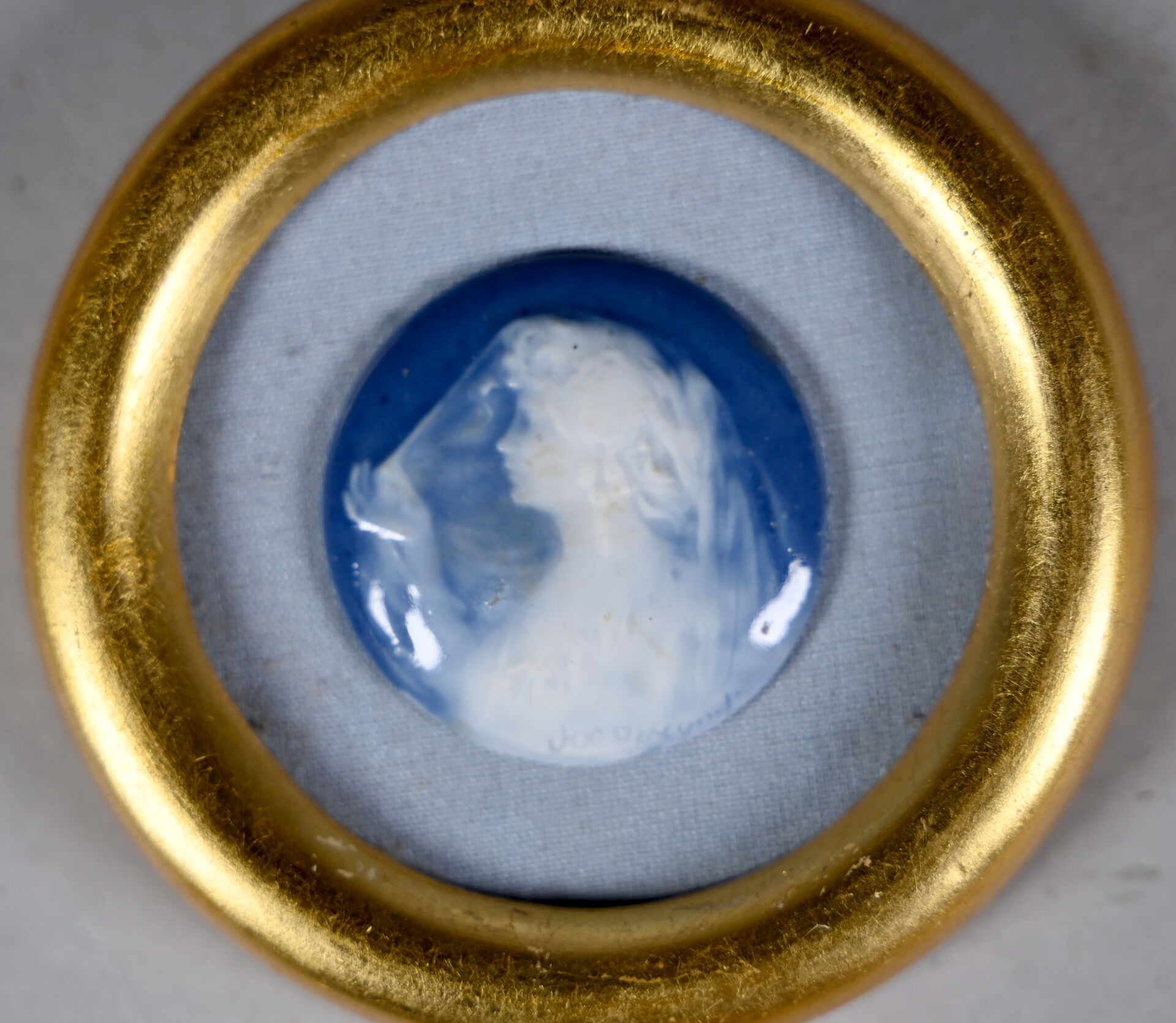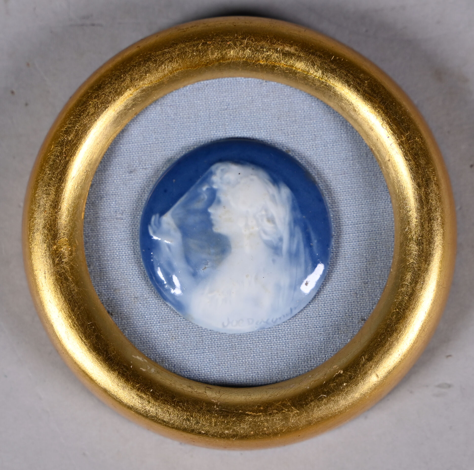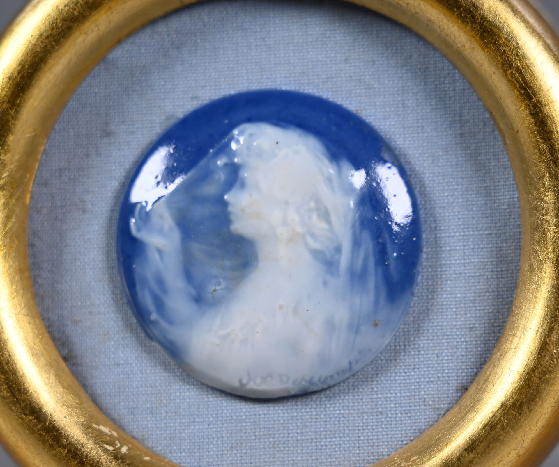 Joe DESCOMPS (1869-1950). Médaillon de porcelaine en bleu blanc à l’imitation du camée représentant un profil de femme. Signé. Diam. : 4,5 cm. Encadré.