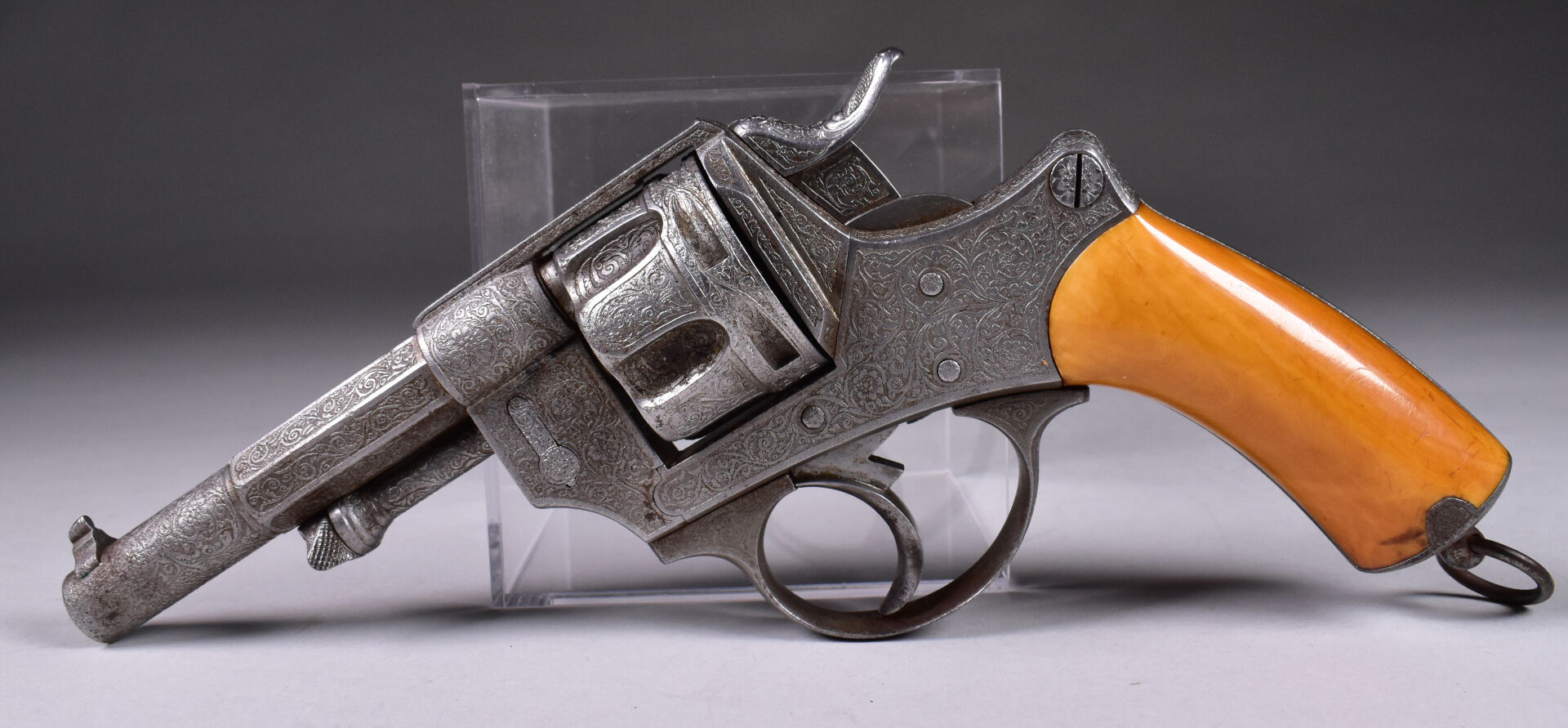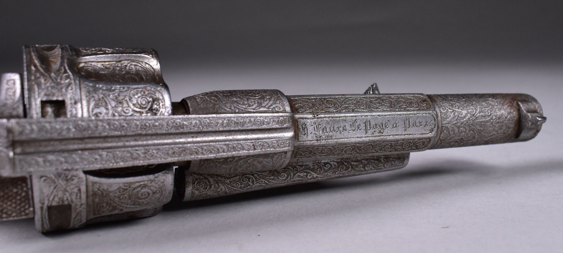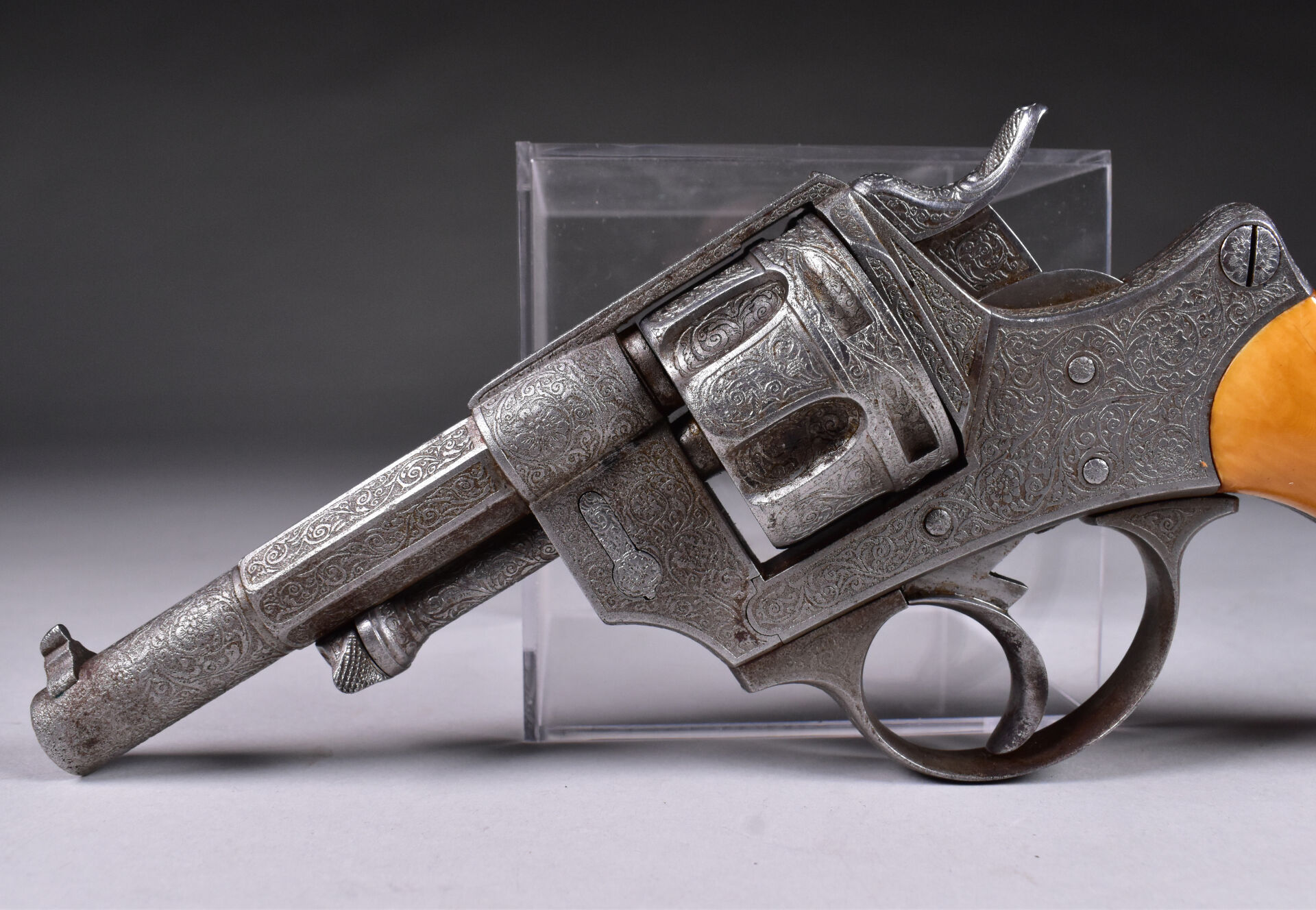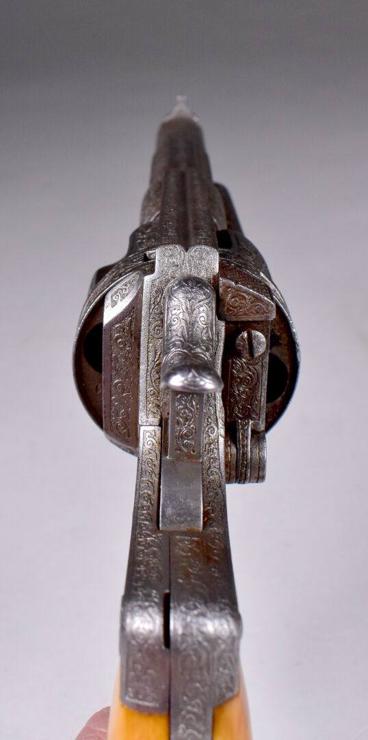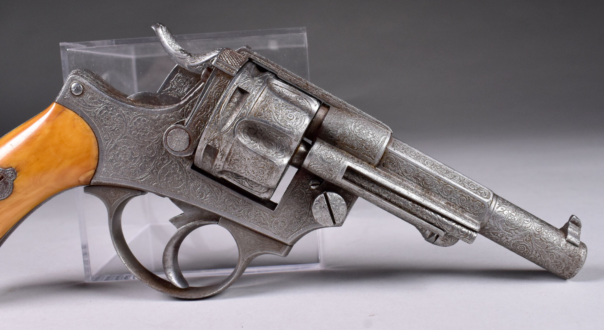 Joli revolver modèle 1874 civil, calibre 11 mm. 1873. Vendu par Fauré-Lepage à Paris comme en atteste le marquage en gothique sur le plat du canon. Arme entièrement gravée de volutes de feuillages. Mécanisme fonctionnel, bonne indexation. Très bon canon pour le tir. Plaquette en bakélite imitant l’ivoire. Dans son étui civil en cuir noir grénéllé doublé de cuir lisse. Manque passant à l’arrière. État 2+. Cat. D.