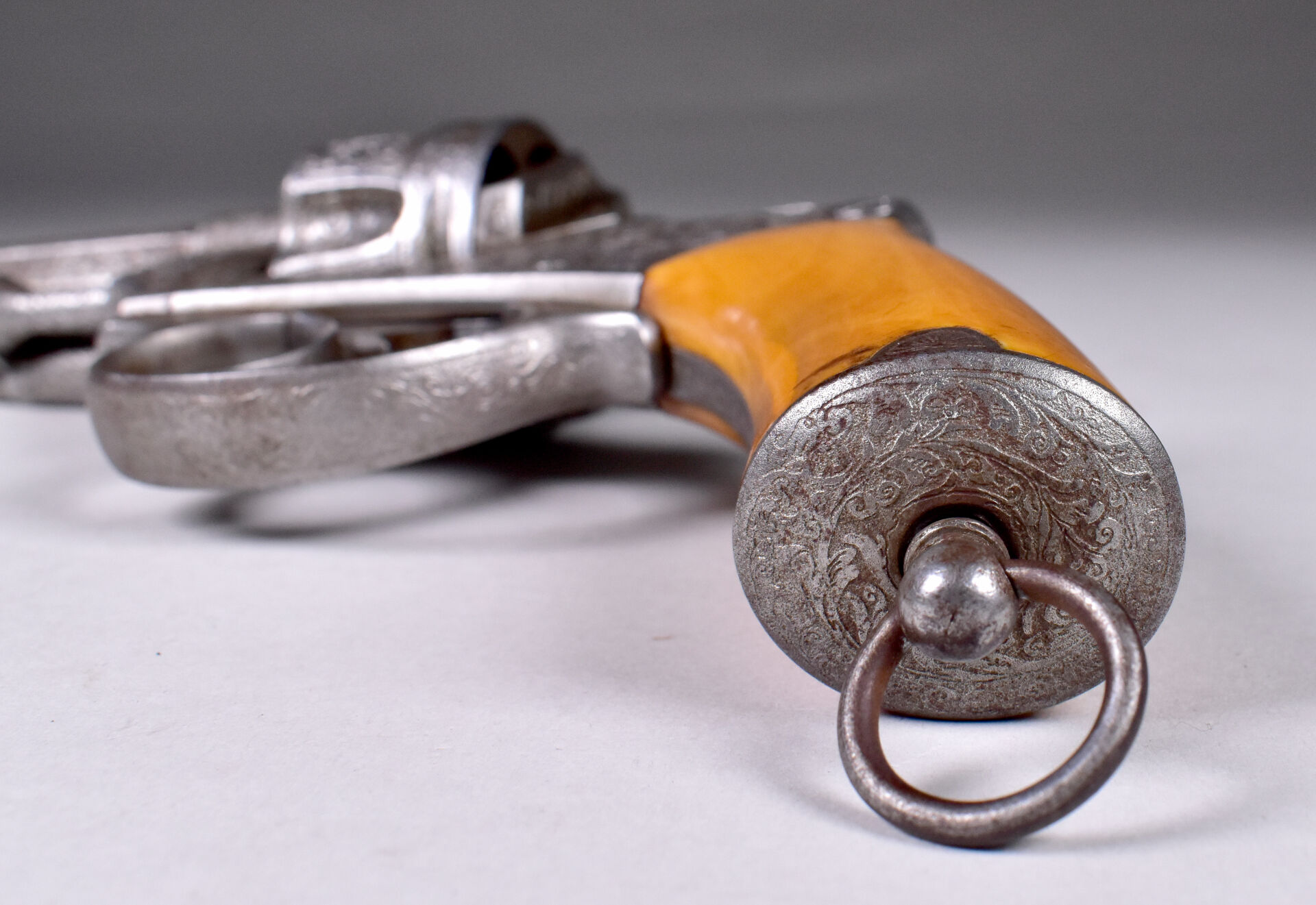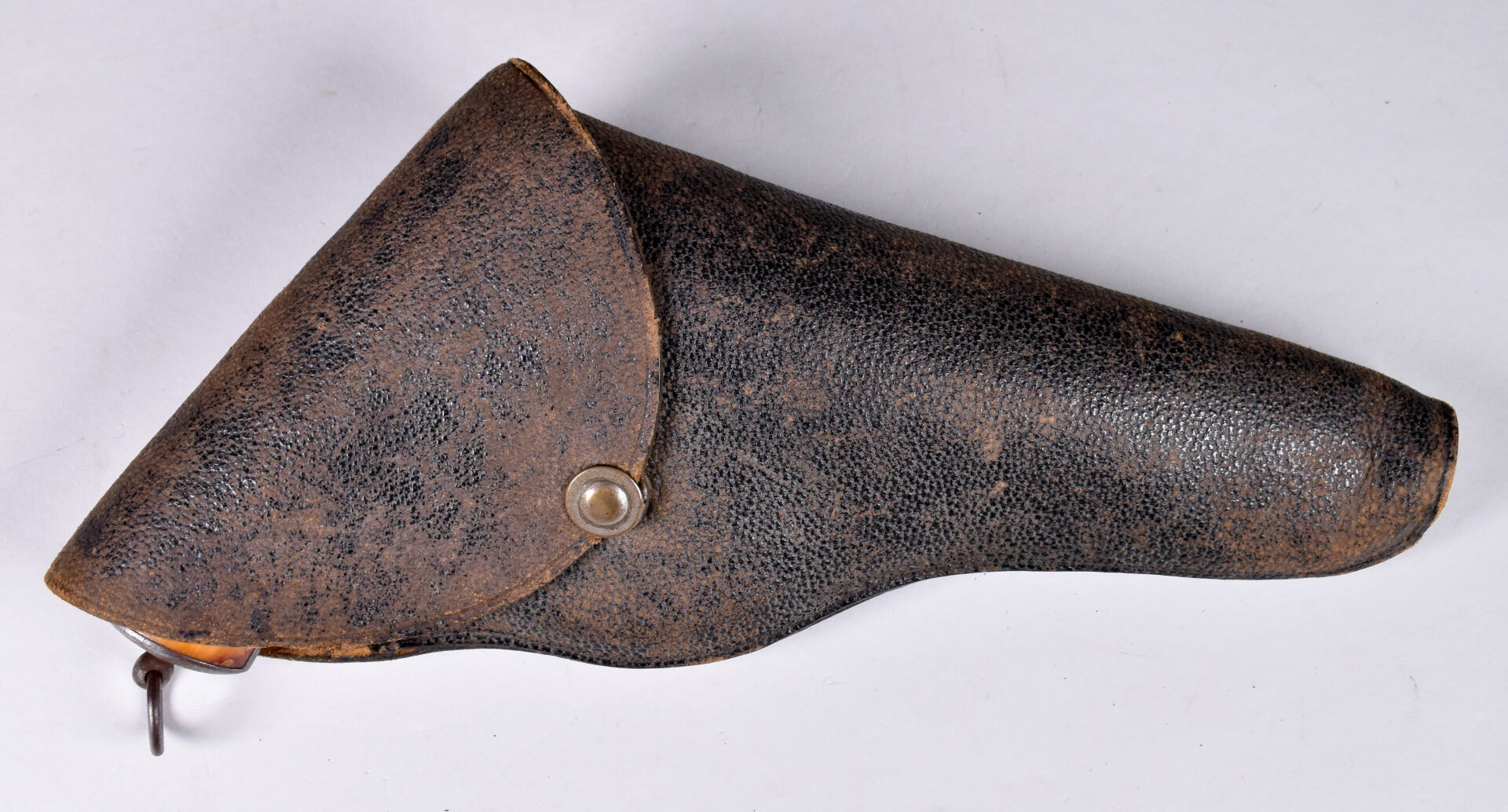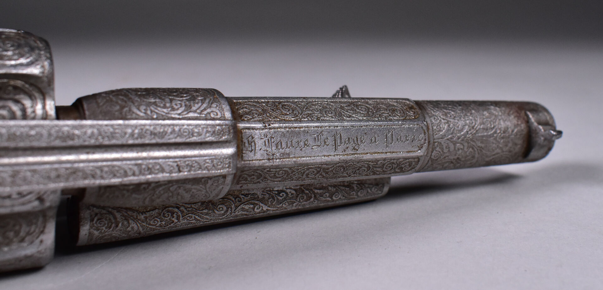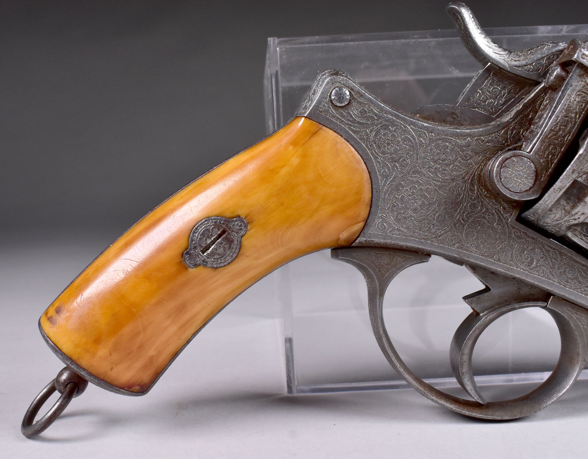 Joli revolver modèle 1874 civil, calibre 11 mm. 1873. Vendu par Fauré-Lepage à Paris comme en atteste le marquage en gothique sur le plat du canon. Arme entièrement gravée de volutes de feuillages. Mécanisme fonctionnel, bonne indexation. Très bon canon pour le tir. Plaquette en bakélite imitant l’ivoire. Dans son étui civil en cuir noir grénéllé doublé de cuir lisse. Manque passant à l’arrière. État 2+. Cat. D.