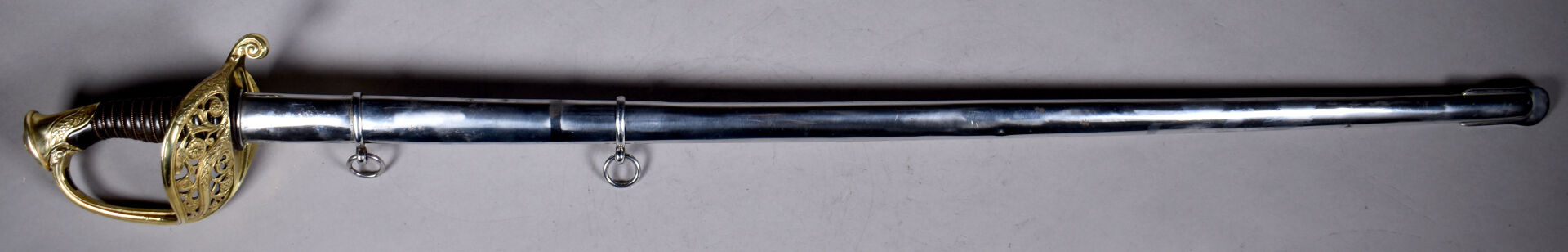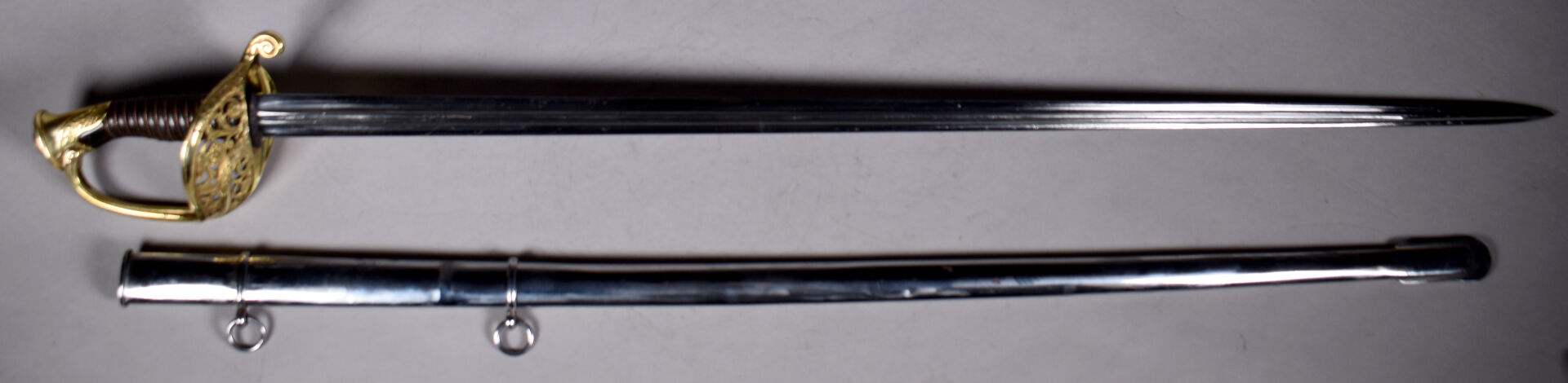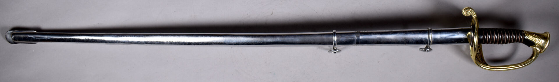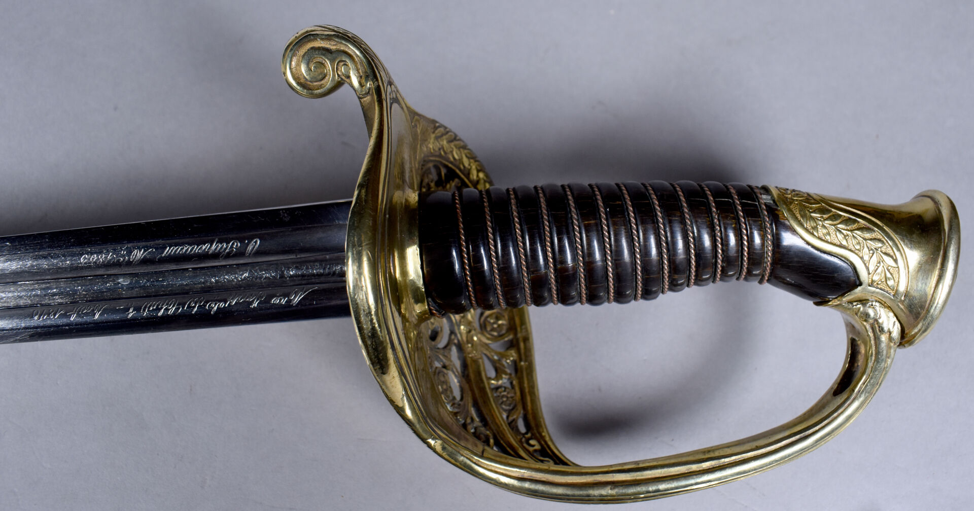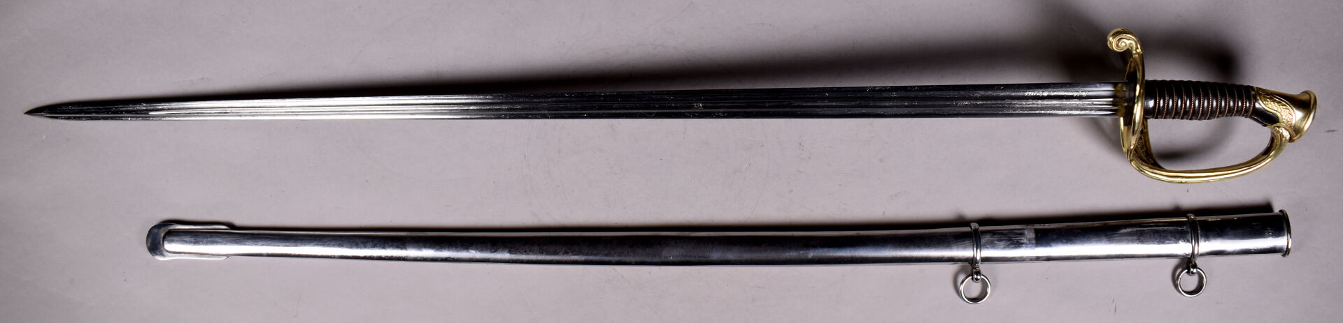 Joli sabre d’officier supérieur modèle 1855 de la manufacture impériale de Châtellerault. Août 1870. Lame droite symétrique à trois gorges et deux nervures portant la signature dans les pans creux. Monture en bronze doré ciselé. Fusée corne filigranées cuivre. Fourreau en tôle d’acier à deux bracelets. État 1.