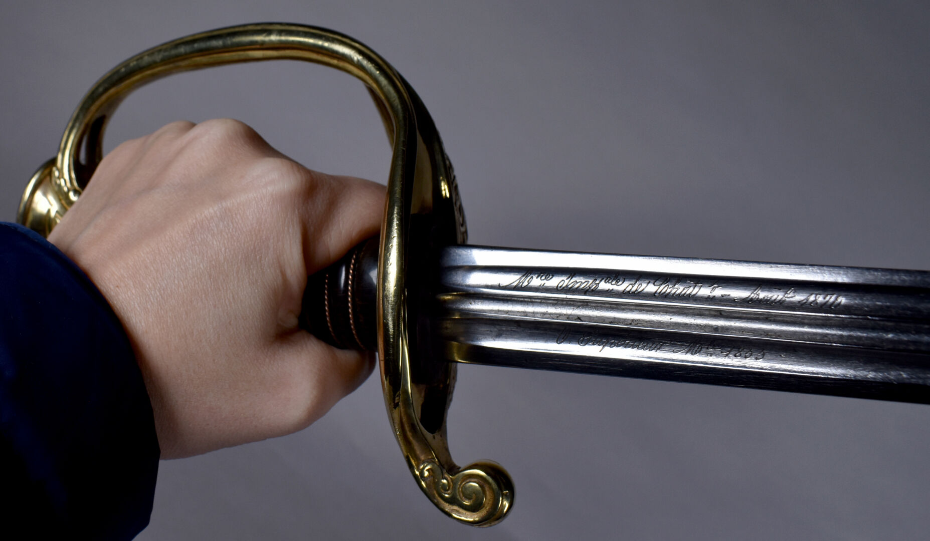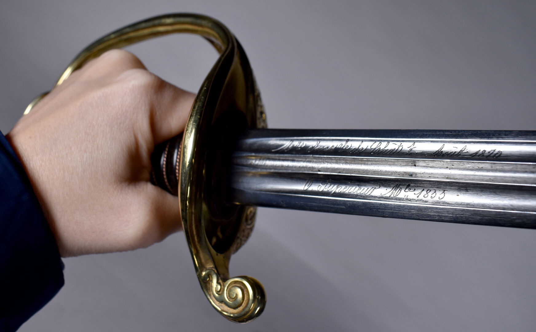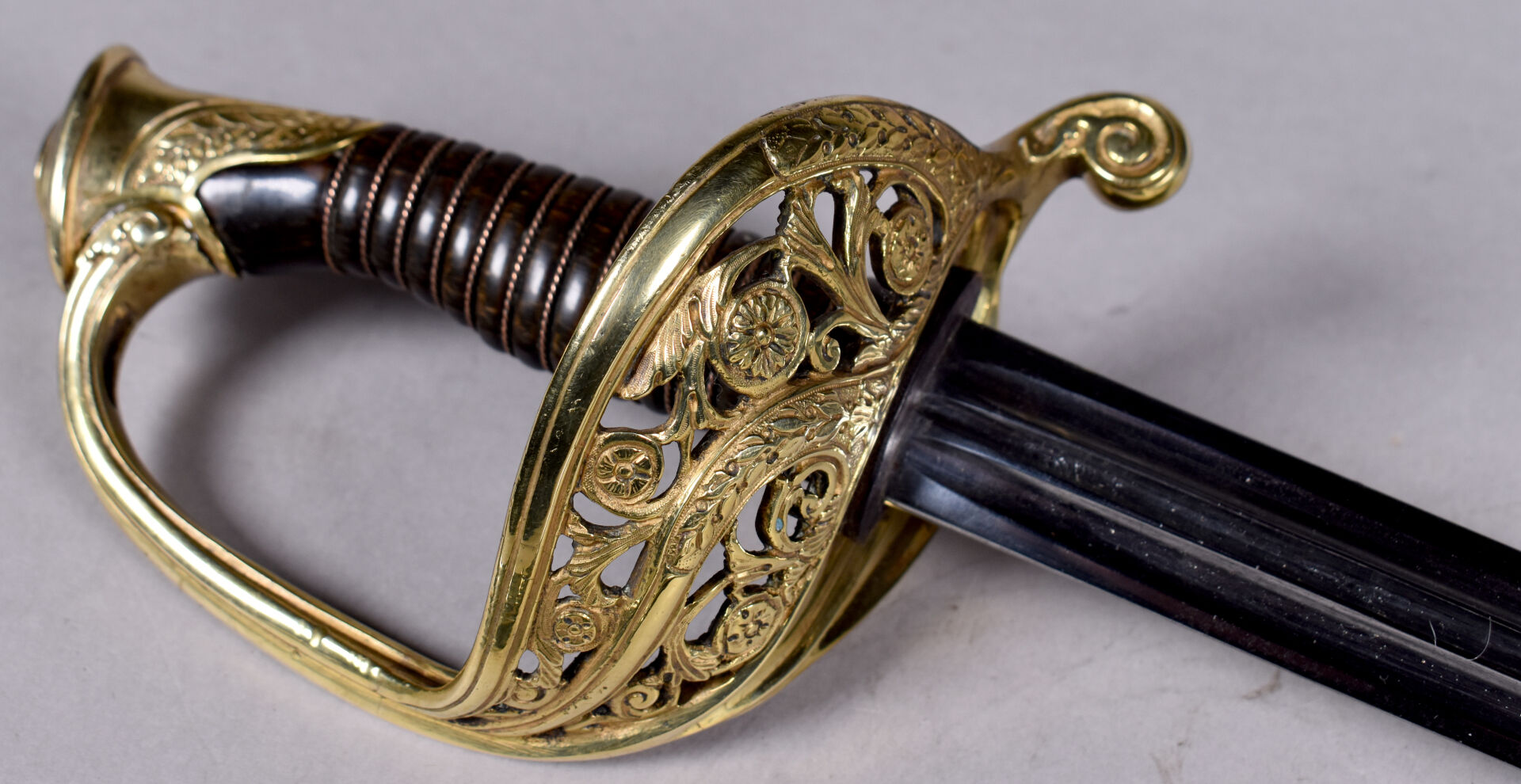Joli sabre d’officier supérieur modèle 1855 de la manufacture impériale de Châtellerault. Août 1870. Lame droite symétrique à trois gorges et deux nervures portant la signature dans les pans creux. Monture en bronze doré ciselé. Fusée corne filigranées cuivre. Fourreau en tôle d’acier à deux bracelets. État 1.