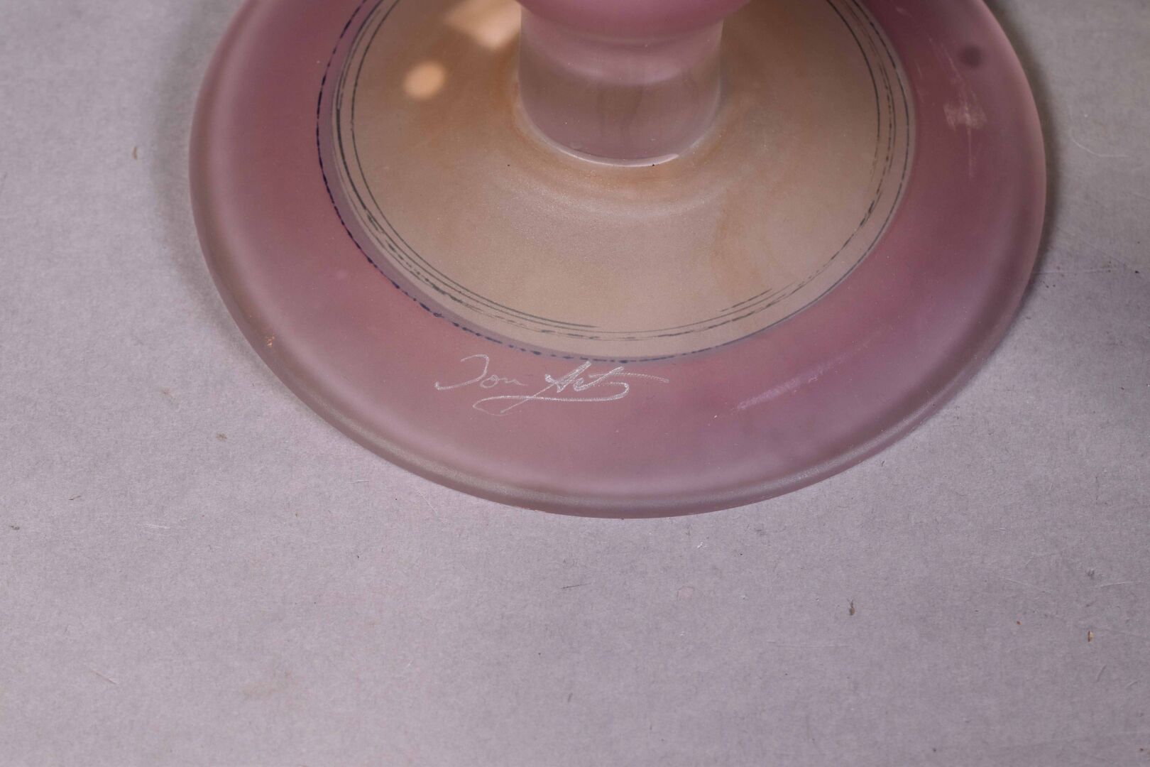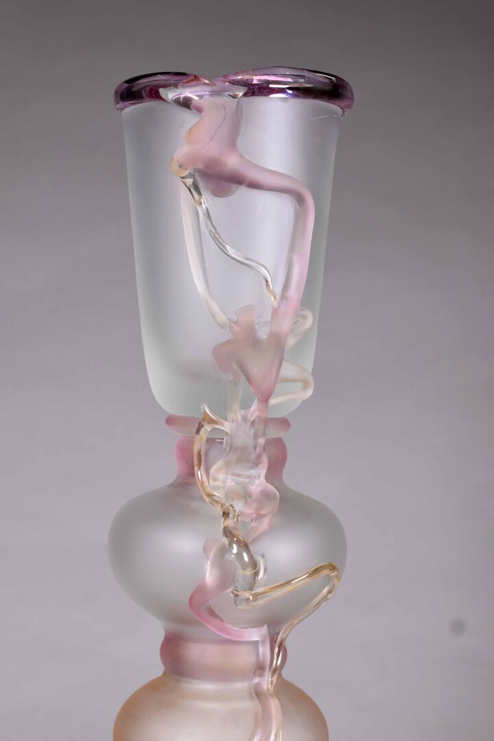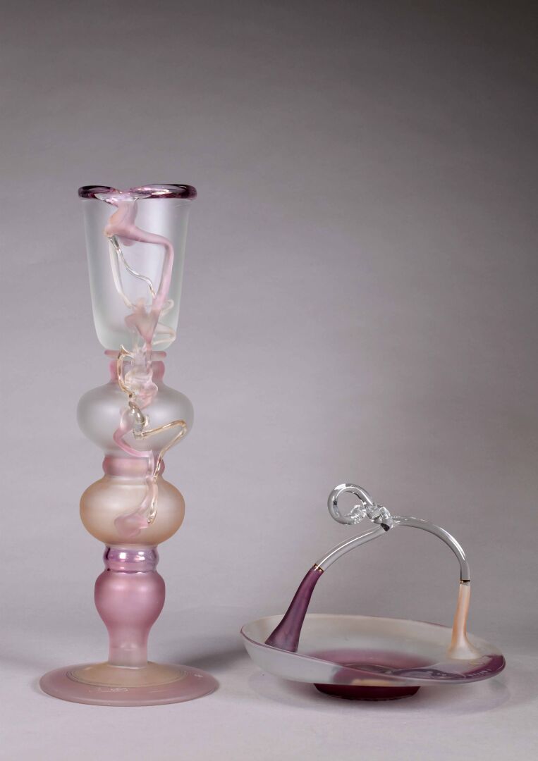 Jon ART. Ensemble en verre soufflé et étiré dépoli, rose et doré comprenant une coupe en forme de panier et un vase à plusieurs bulbes. Haut. du vase : 51 cm.