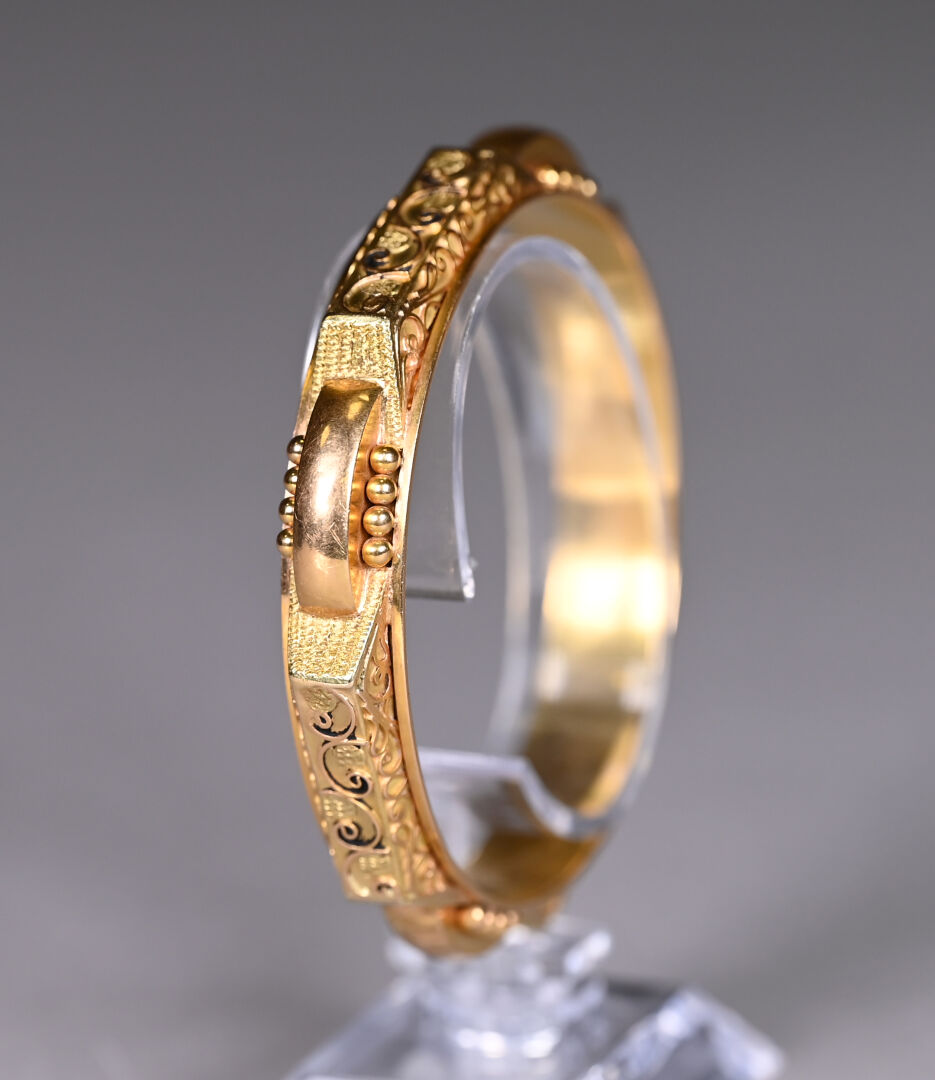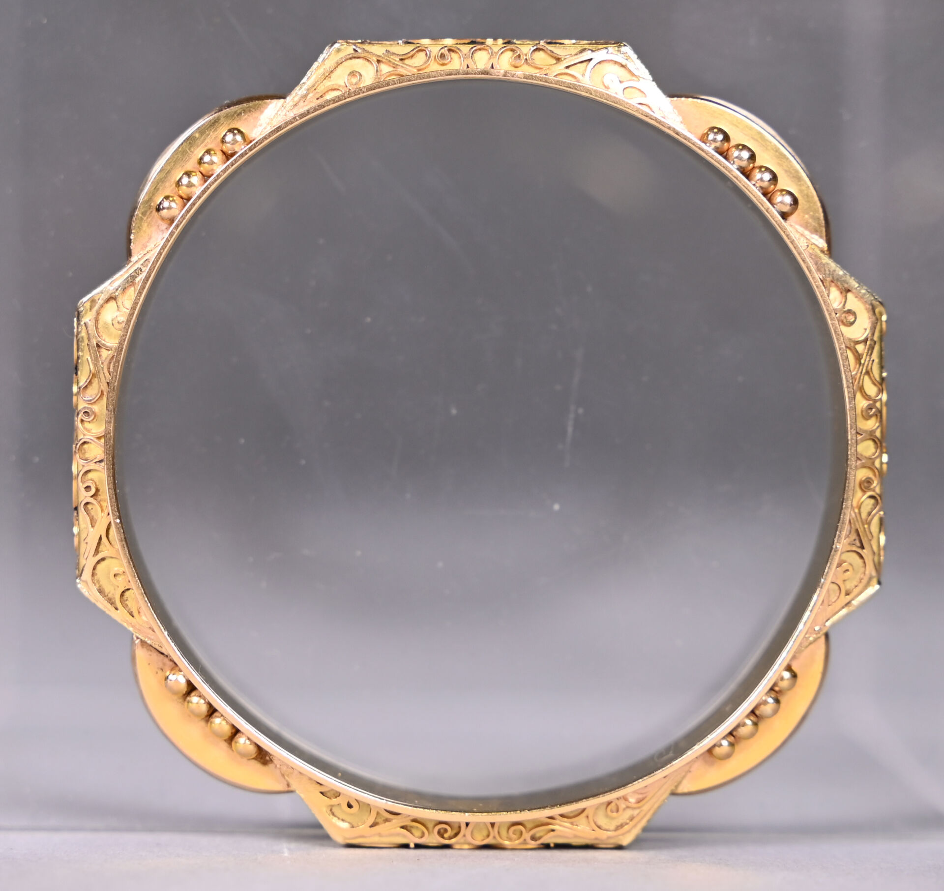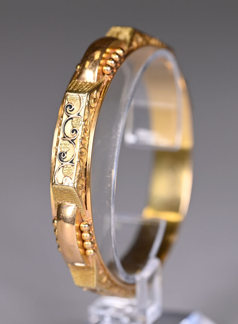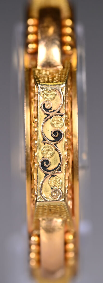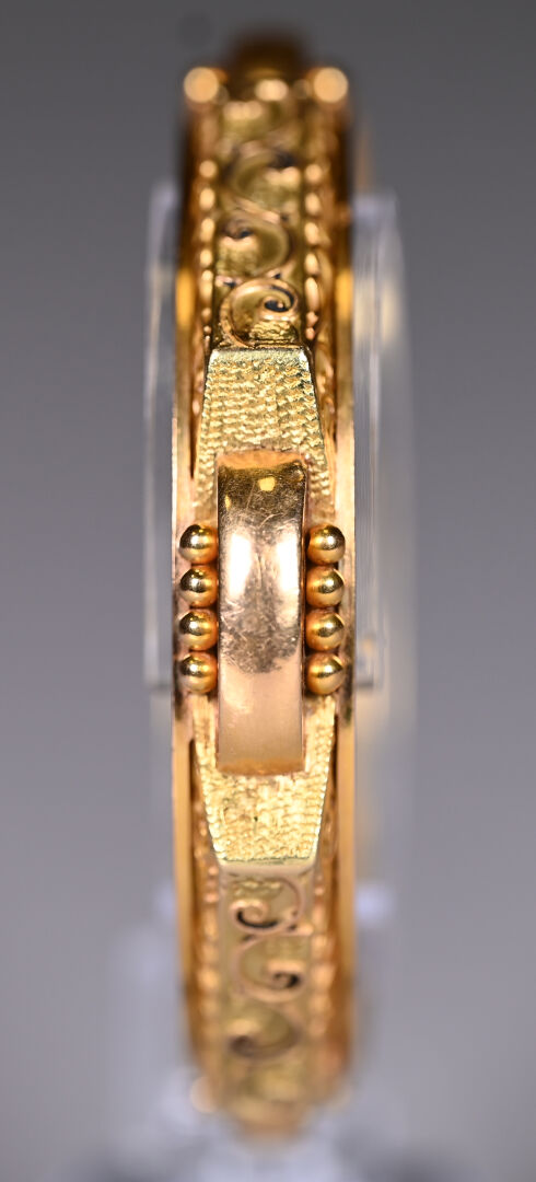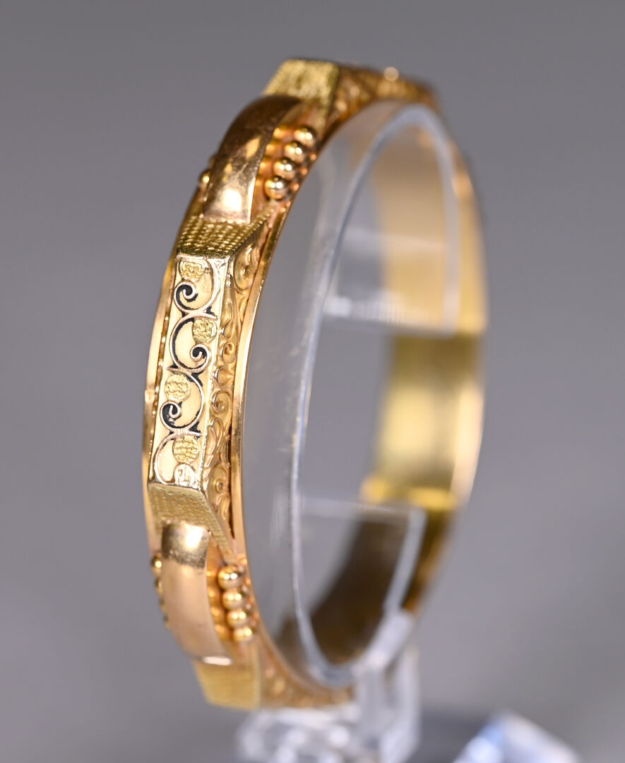 Jonc rigide en or jaune 18k 750/1000e à décor en relief (petit manque et anciennes traces d’émaillage). Travail du début du XXe siècle. Diam. : 6,4 cm. Poids. : 28,7 g.
