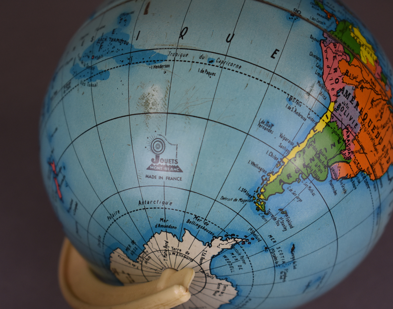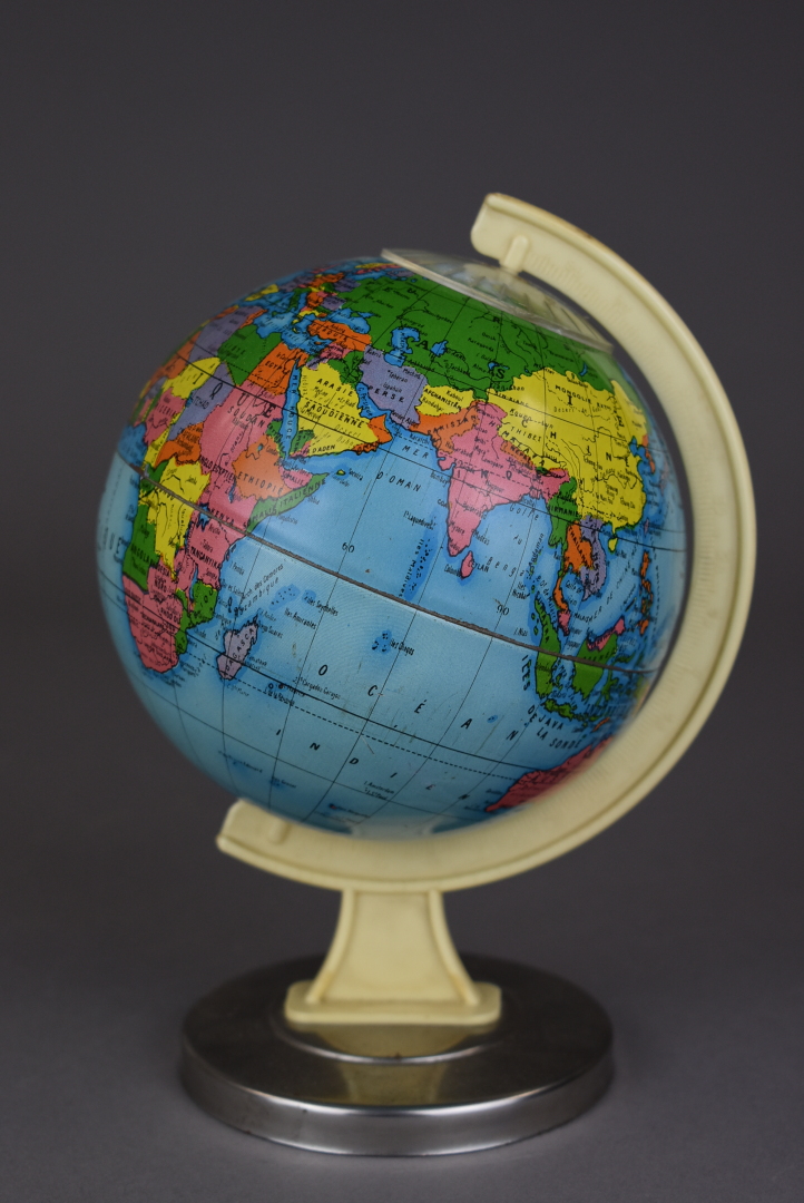 JOUETS MONT BLANC. Globe miniature en métal lithographié. La base en bakélite et métal. Vers 1970. Haut.: 18 cm.
