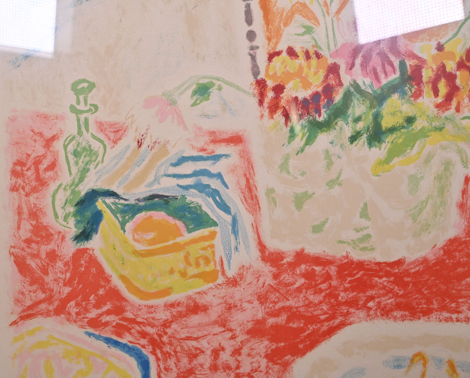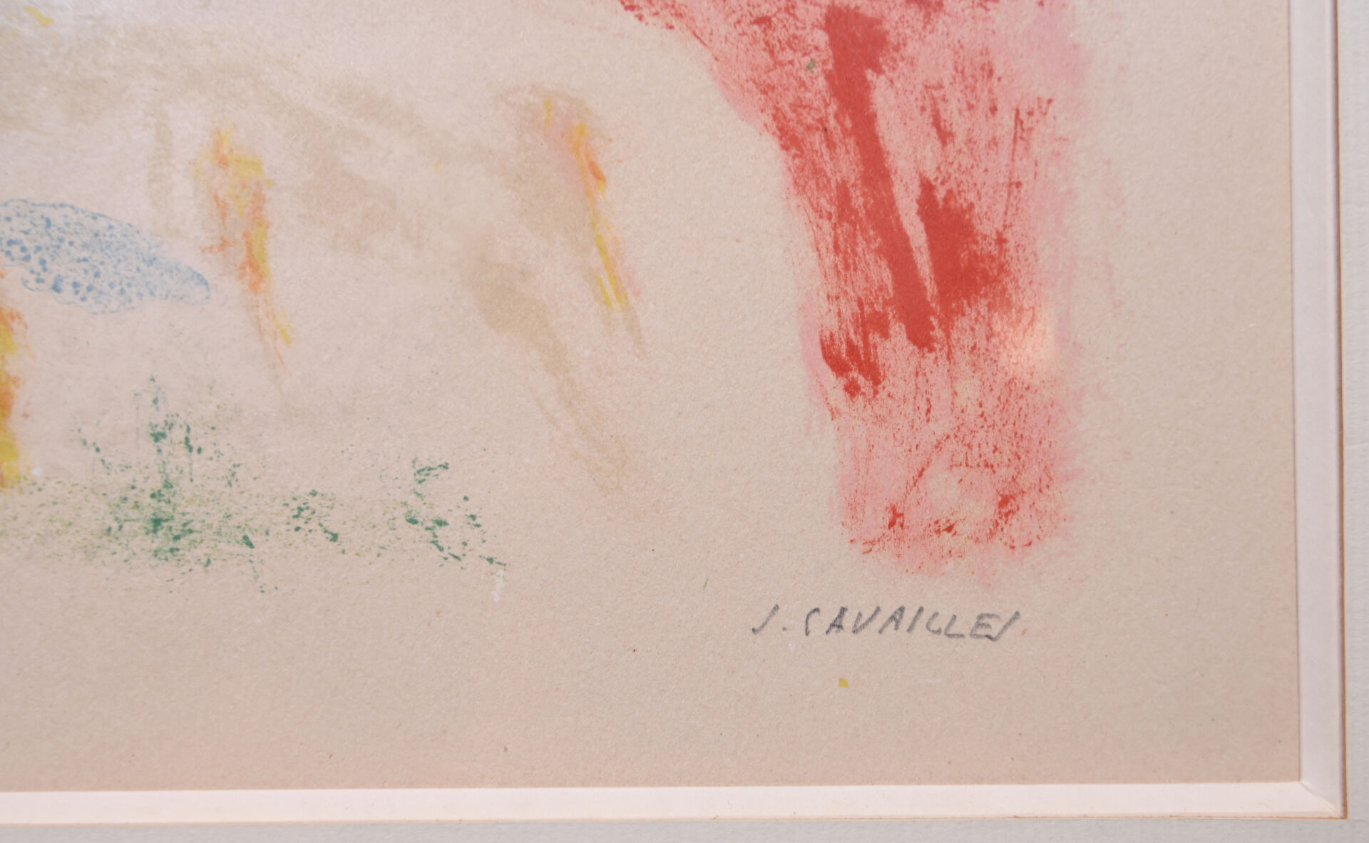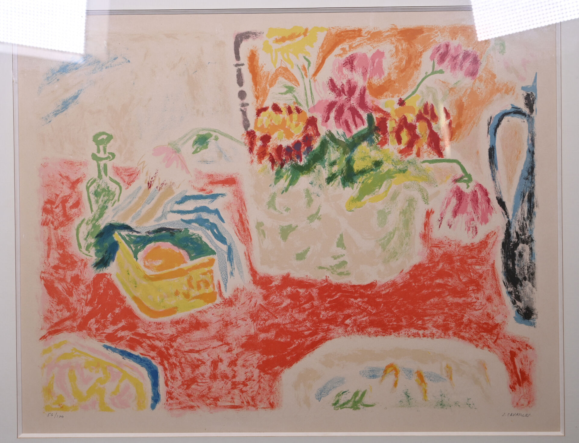 Jules CAVAILLES (1901-1977). Nature morte au flacon vert. Lithographie signée en bas à droite, numérotée 56/100 en bas à gauche. 46 x 58 cm à vue.