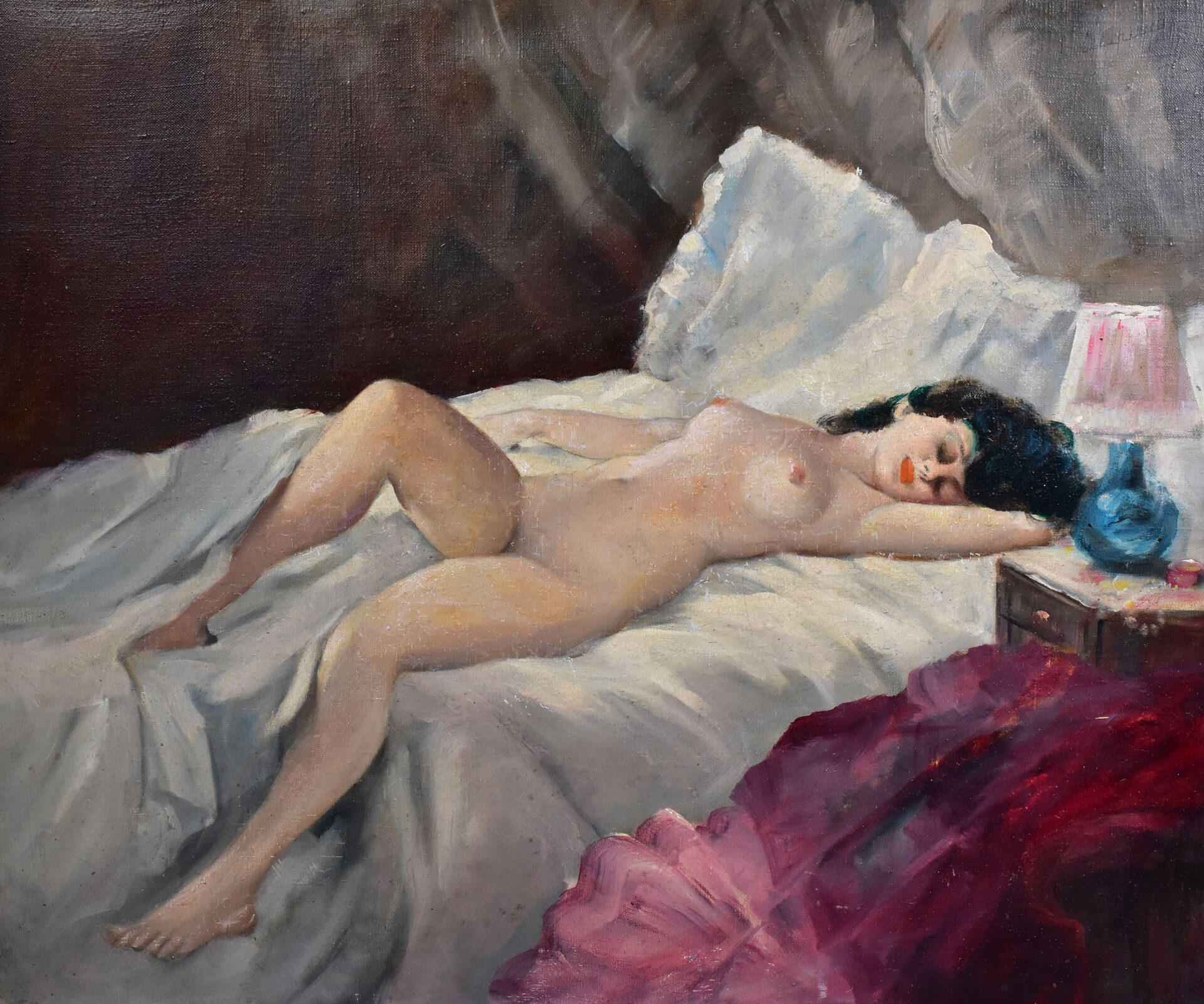 Jules-Gustave LEMPEREUR (1902-1985). Nu féminin alangui. Huile sur toile signée en haut à droite. 46 x 56 cm.
