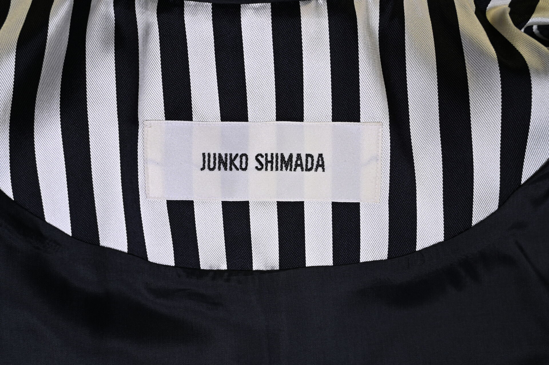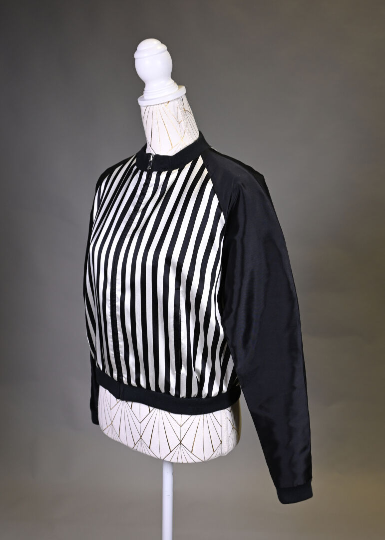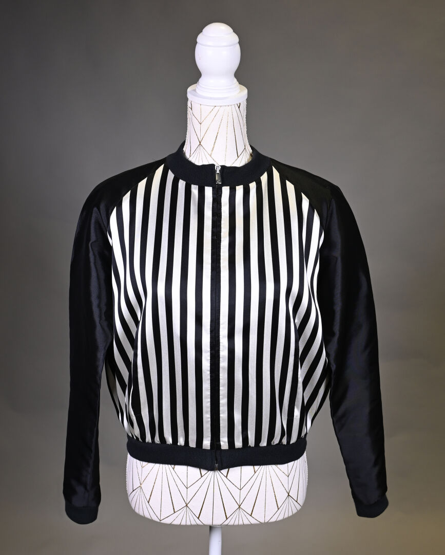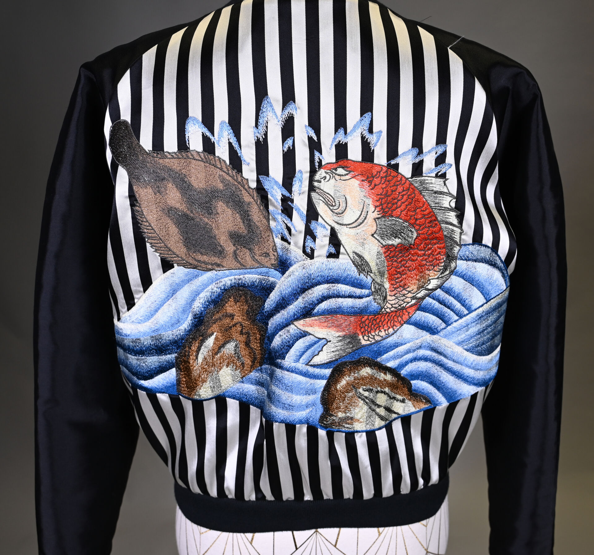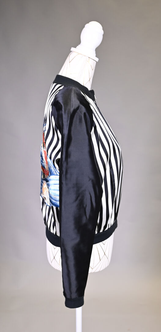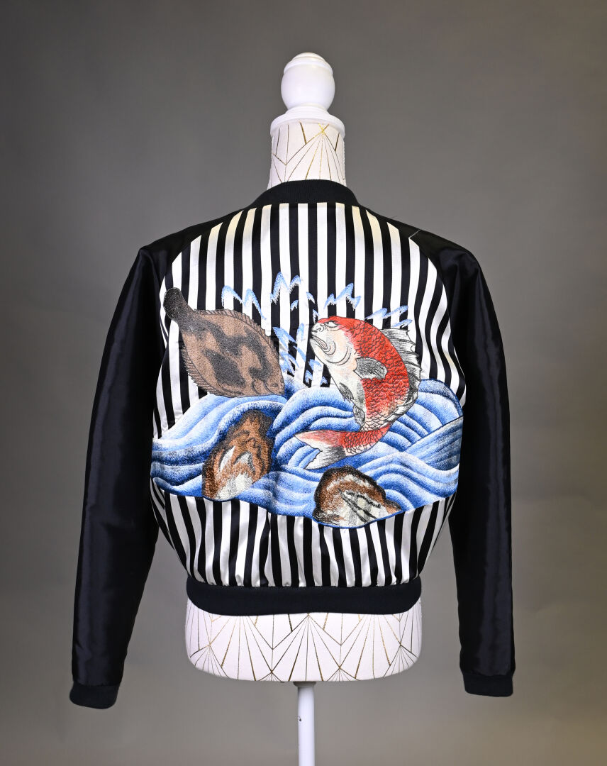 JUNKO SHIMADA. Blouson type « bombers » en polyester noir et blanc, le dos brodé d’une carpe koï et sole sur fond de vague et rochers. Taille 36. Long. : 52,5 cm.
