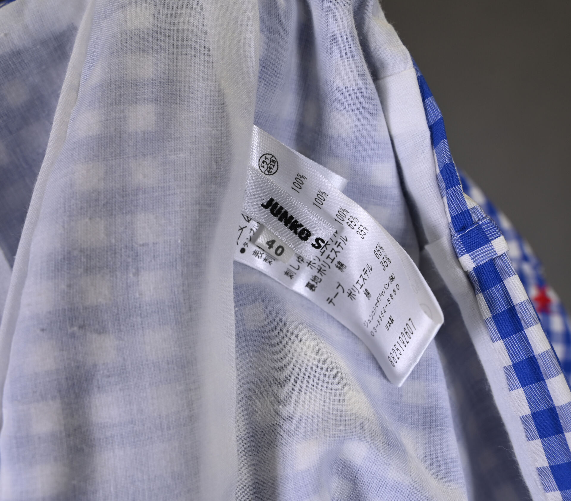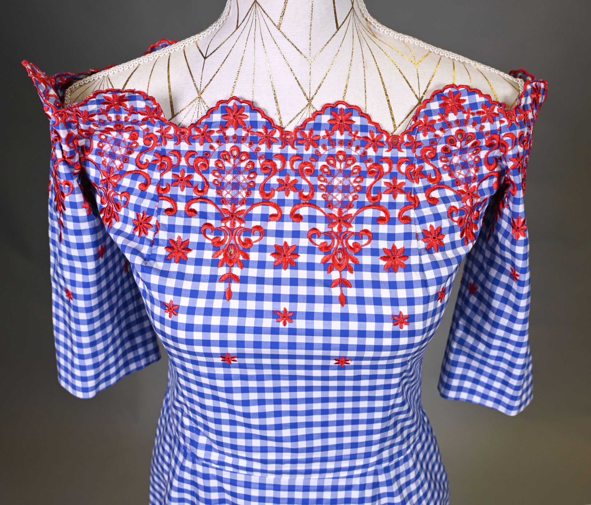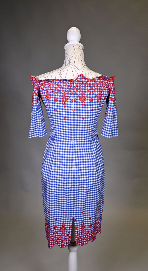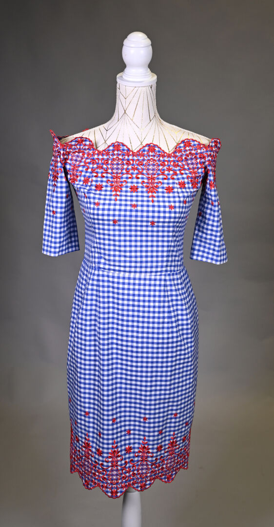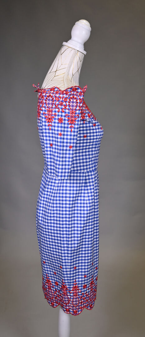 JUNKO SHIMADA. Robe en coton imprimé vichy bleu/blanc à décor de broderies anglaises en rouge, col bateau, manches courtes. Taille 40 (petit) Long. : 87 cm.