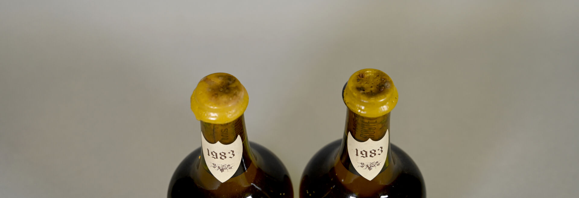 JURA – 2 clavelins, Château-Chalon, Marius Perron, 1983. Niveaux très légèrement bas. Capsules en cires sales et abimées. Quelques très légères traces sur les étiquettes dont une présente une petite déchirure dans son angle gauche supérieur.