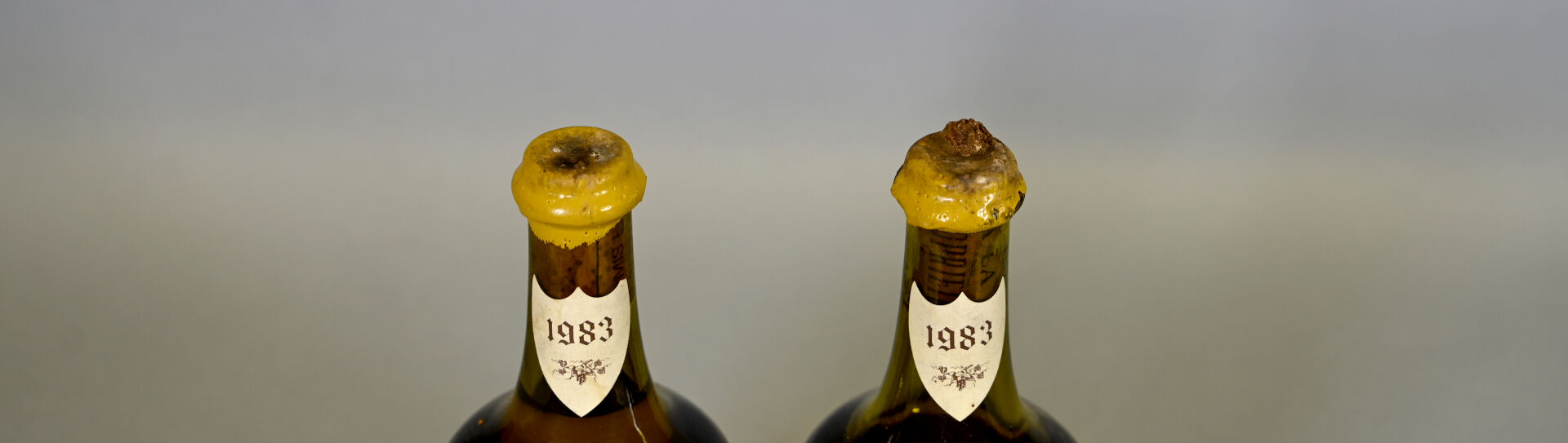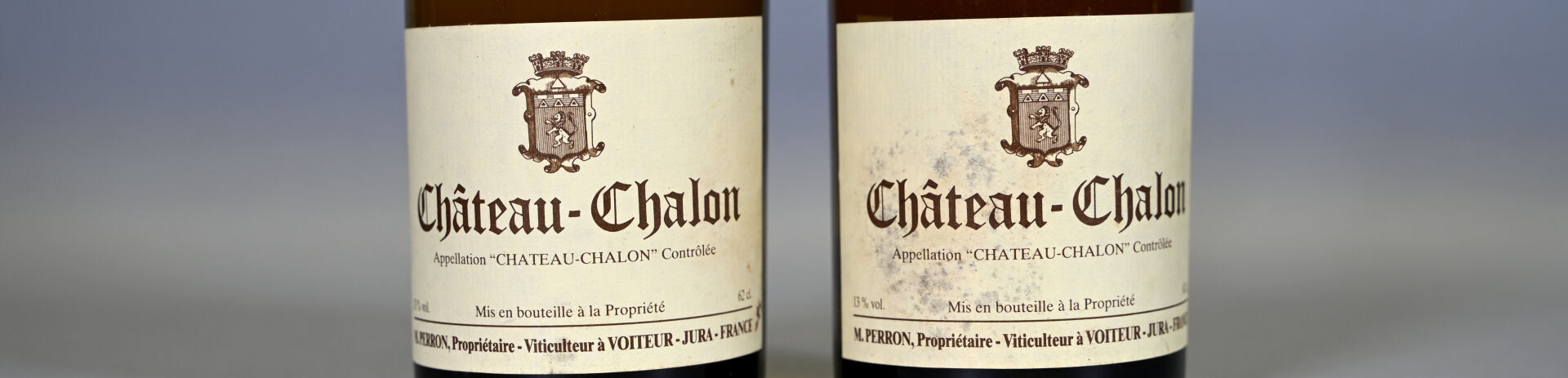 JURA – 2 clavelins, Château-Chalon, Marius Perron, 1983. Un niveau très légèrement bas et un niveau bas (8 cm sous la bague). Capsules en cires sales à très sales et abimées. Etiquettes légèrement sales dont une présente des traces d’humidité.
