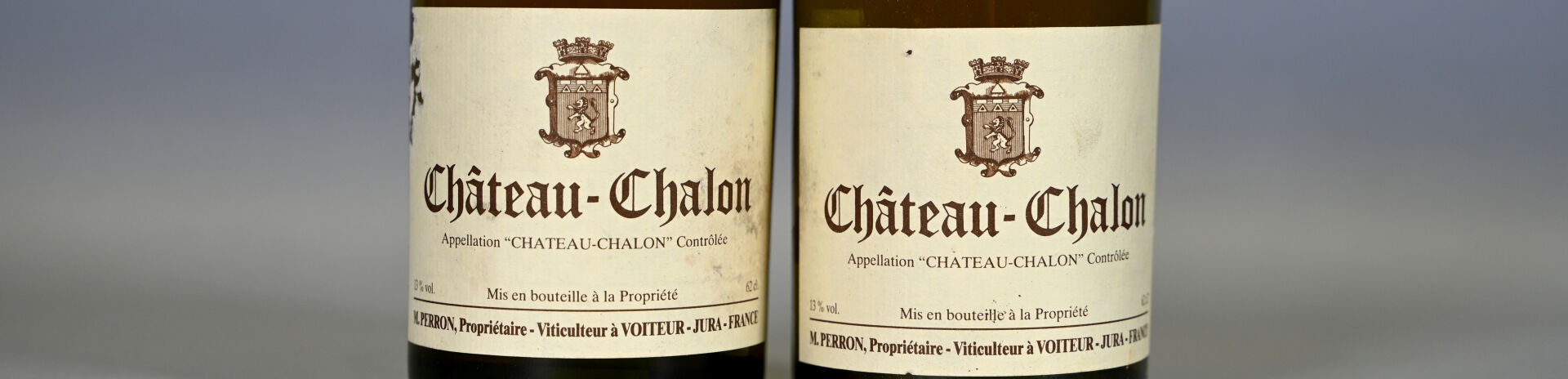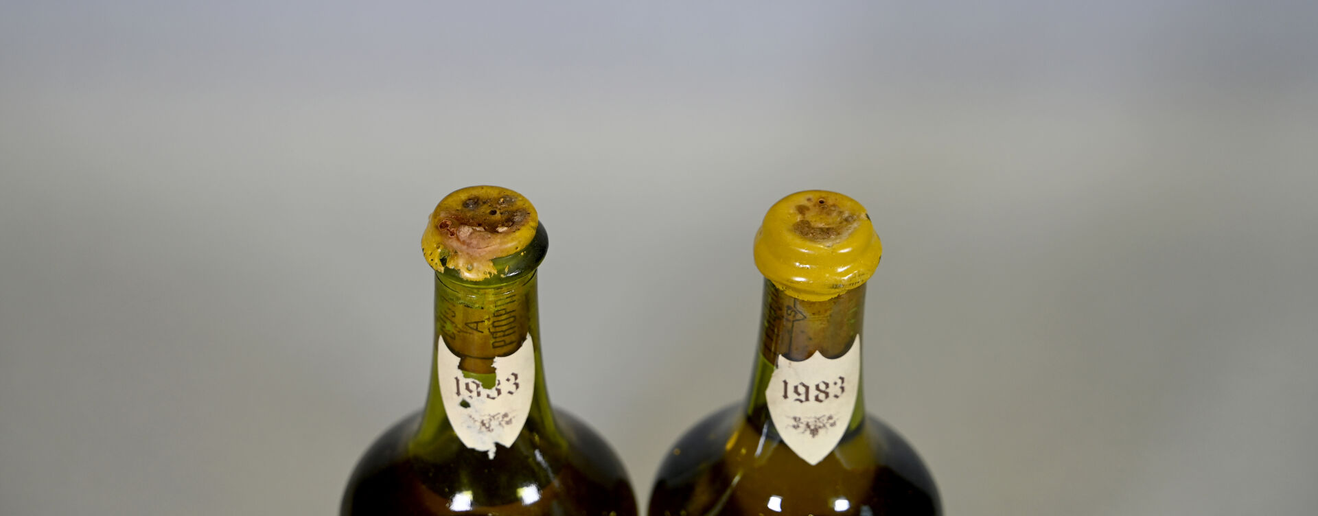 JURA – 2 clavelins, Château-Chalon, Marius Perron, 1983. Un niveau très légèrement bas et un niveau légèrement bas (7 cm sous la bague). Capsules en cires sales à très sales et légèrement dégradées à dégradées. Etiquettes légèrement sales dont une présente un petite égratignure et l’autre est abimée au niveau de son angle gauche supérieur.