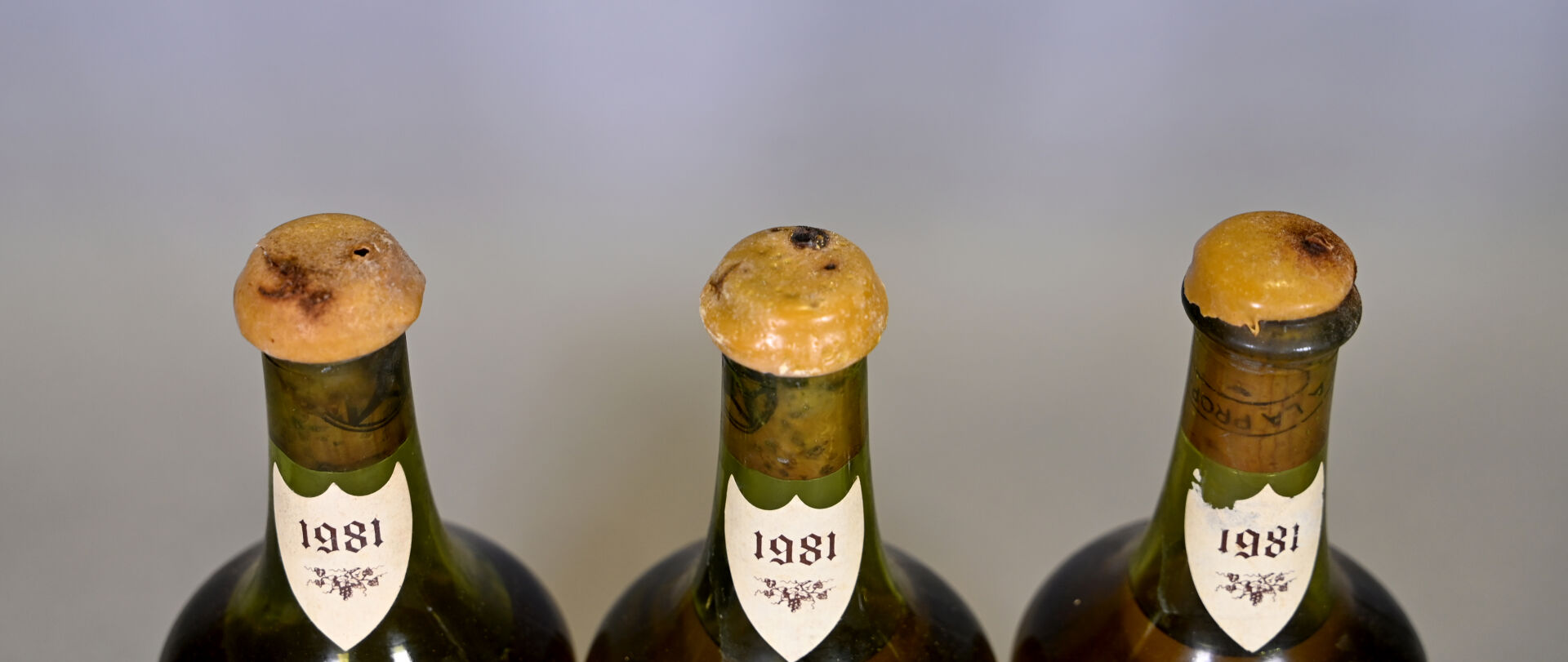 JURA – 3 clavelins, Château-Chalon, Georges Bury, 1981. Deux niveaux légèrement bas et un niveau bas (8 cm sous la bague). Capsules en cire sales et abimées. Un écusson est légèrement abimé. Etiquettes légèrement sales à sales dont deux sont très légèrement abimées à abimées.