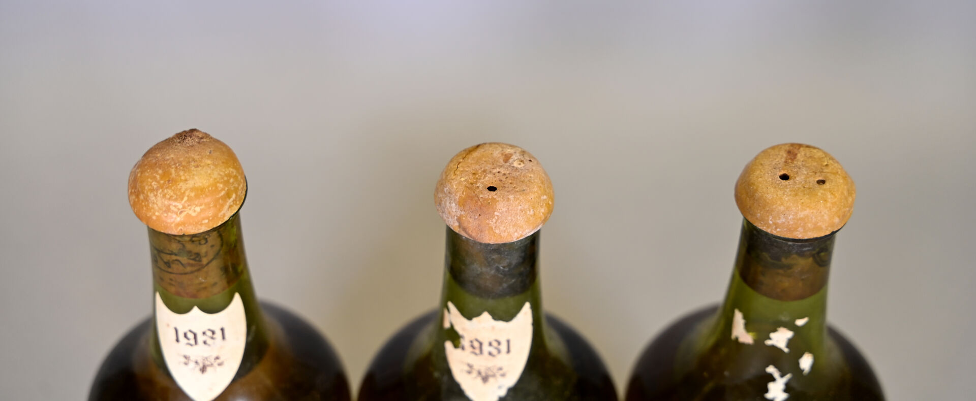 JURA – 3 clavelins, Château-Chalon, Georges Bury, 1981 (dont une bouteille peut-être également de ce millésime). Un niveau légèrement bas et deux niveaux bas (8 cm sous la bague). Capsules en cire sales et abimées. Ecussons légèrement sales dont deux sont abimés et un très dégradé et presque entièrement manquant. Etiquettes légèrement sales à sales dont deux sont légèrement abimées à abimées.