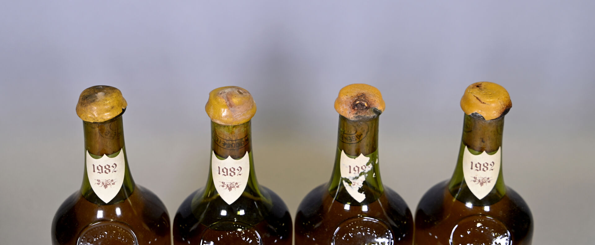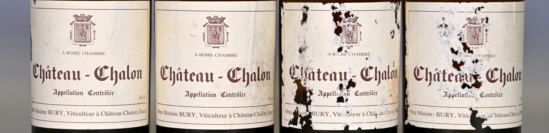JURA – 4 clavelins, Château-Chalon, Maxime Bury, 1982 (dont une bouteille peut-être également de ce millésime). Trois niveaux légèrement bas et un niveau bas (8 cm sous la bague). Capsules en cire sales et abimées. Ecussons avec des traces dont un est dégradé. Etiquettes sales dont trois sont abimées.