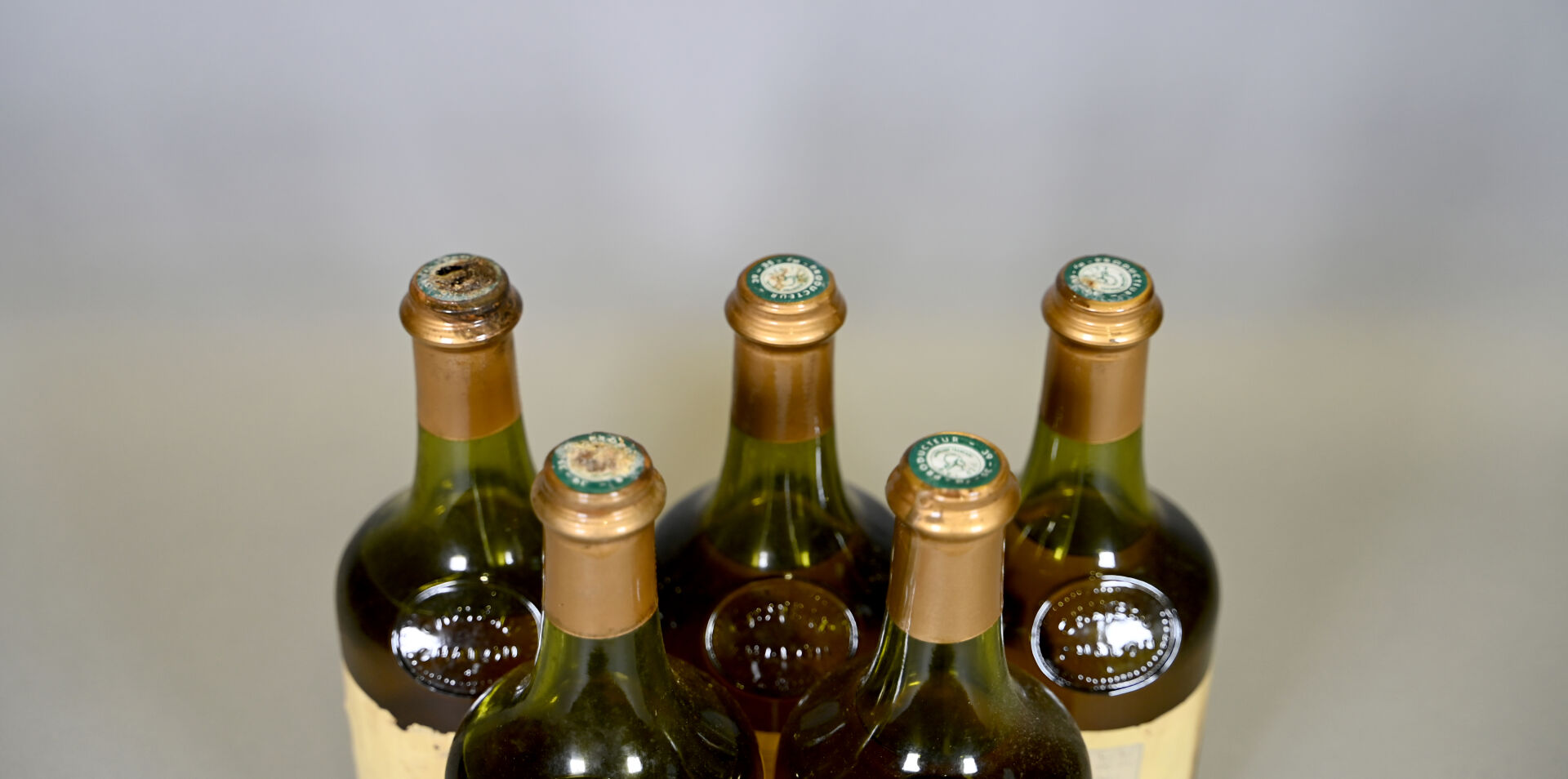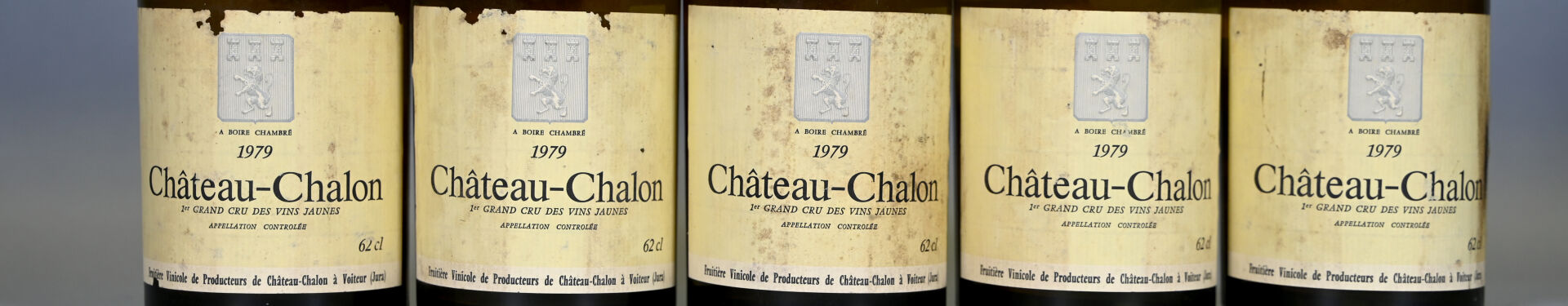 JURA – 5 clavelins, Château-Chalon, Fruitière Vinicole de Producteurs de Château-Chalon, 1979. Une bouteille avec des traces de coulure ancienne. 3 niveaux bas et 2 niveaux mi-épaule (-). Capsules légèrement sales à sales dont une présente une déchirure en son sommet et une autre est légèrement abimée. Etiquettes sales et légèrement abimées. Contre-étiquettes sales, légèrement dégradées à dégradées et partiellement décollées.