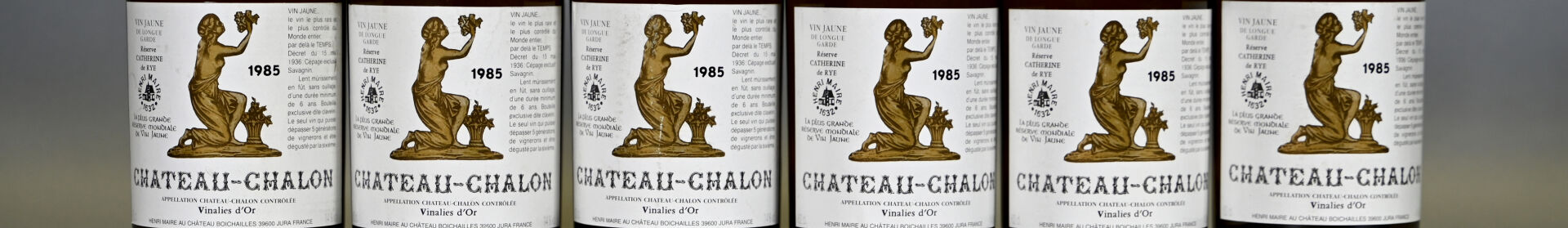 JURA – 6 clavelins, Château-Chalon, Henri Maire, Réserve Catherine de Rye, 1985. 3 niveaux légèrement bas. Capsules dont le bas de jupe est sale. Etiquettes avec de légères traces.