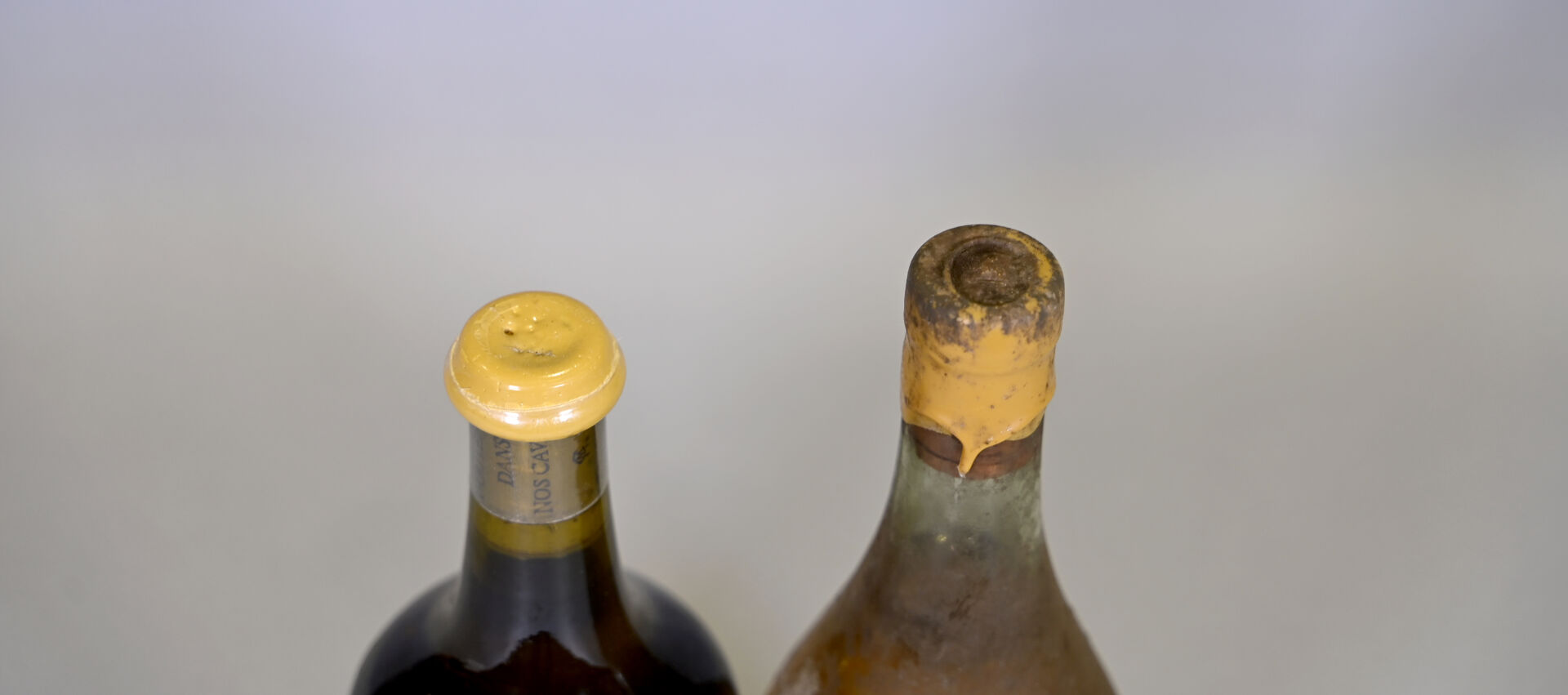 1 bouteille, Eau-de-Vie de Marc, Château d’Arlay. Capsule en cire sale et légèrement abimée. Etiquette sale et abimée. Contre-étiquette sale.