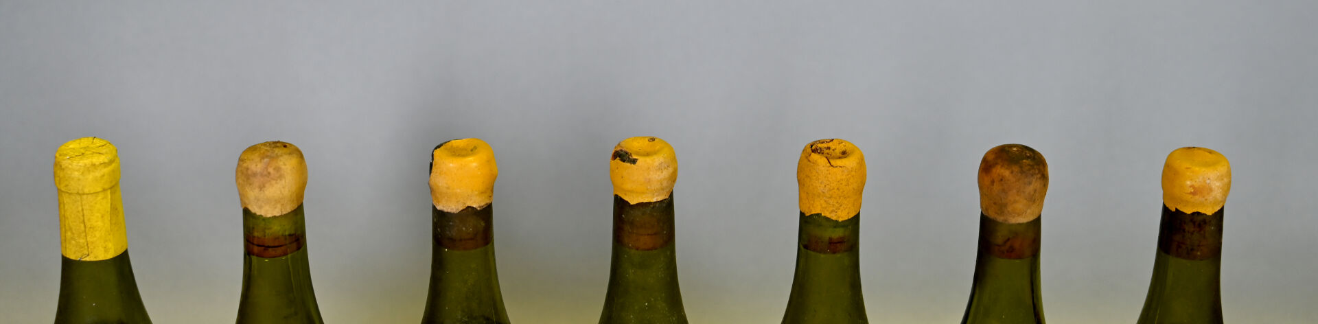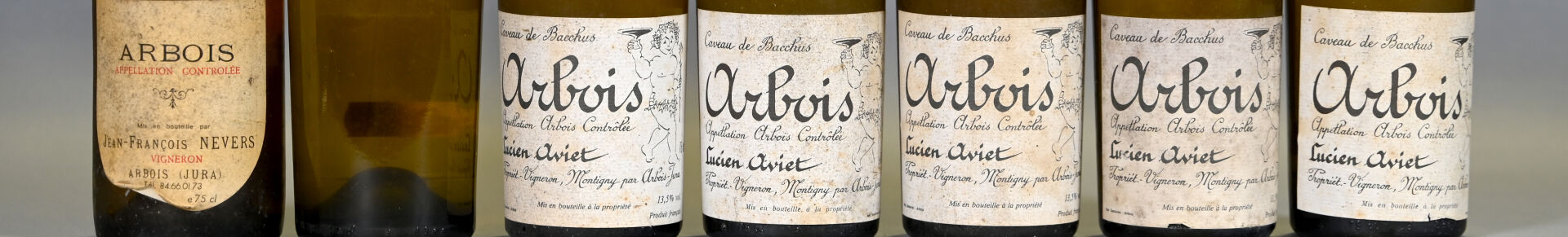 6 bouteilles, Arbois, Lucien Aviet, Réserve du Caveau, 1985 (2), 1986 (2), un millésime ? et une bouteille supposée de cette référence (millésime ?). Niveaux à 7 cm sous le bouchon ou mieux. Capsules en cire sales, dégradées et avec des éclats. Collerettes sales dont deux sont manquantes. Etiquettes sales dont une est manquante.
