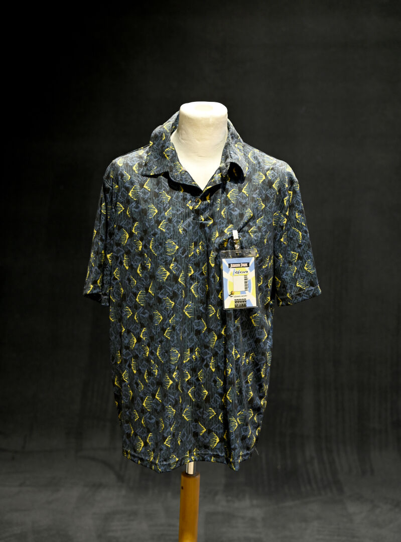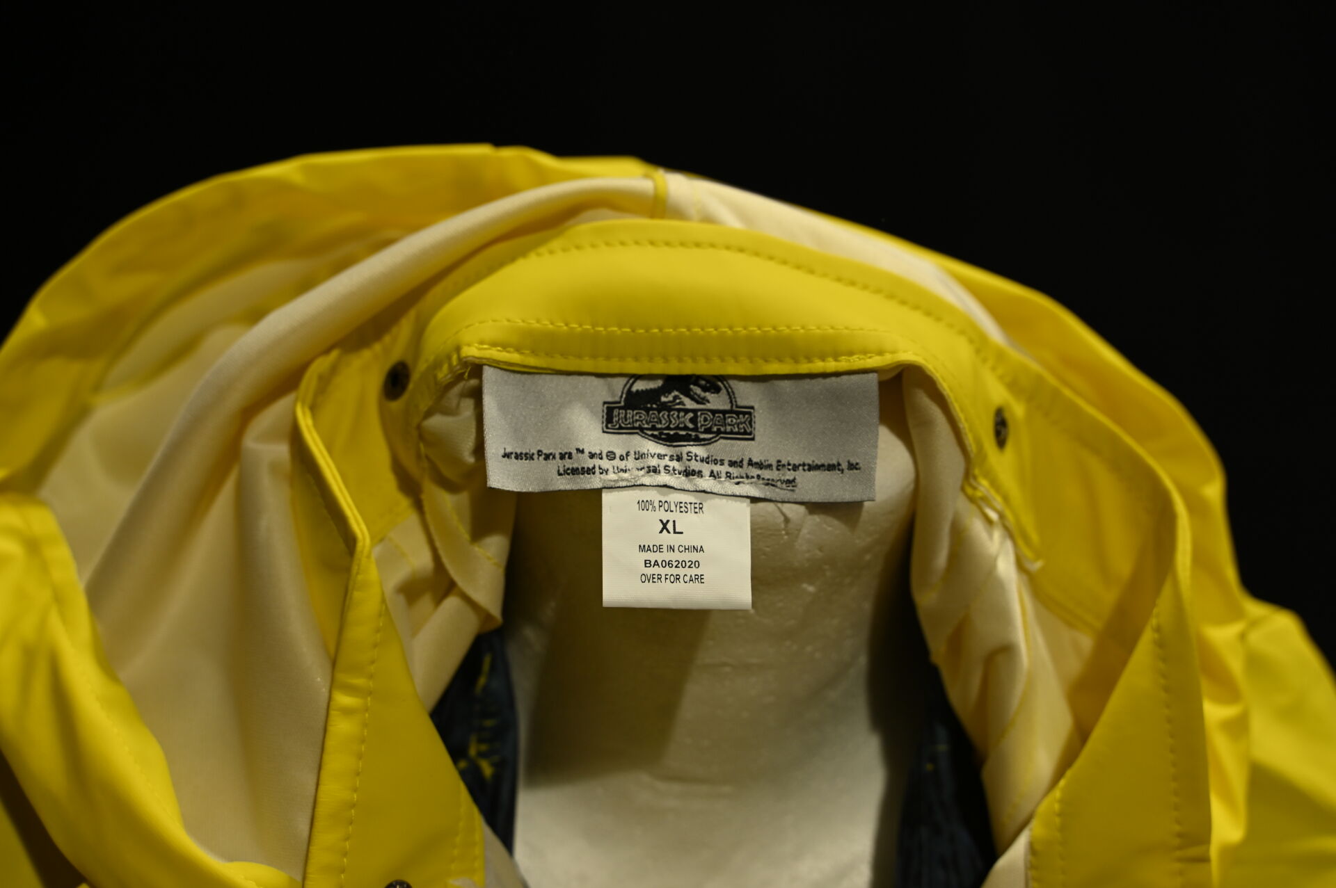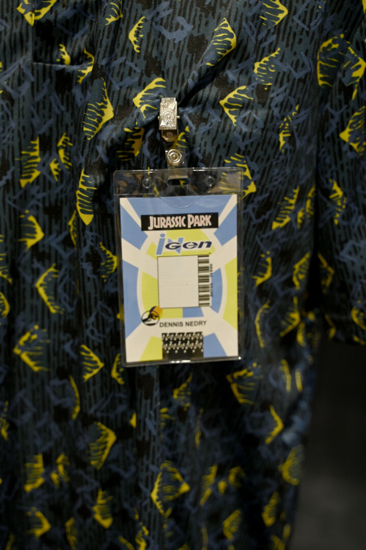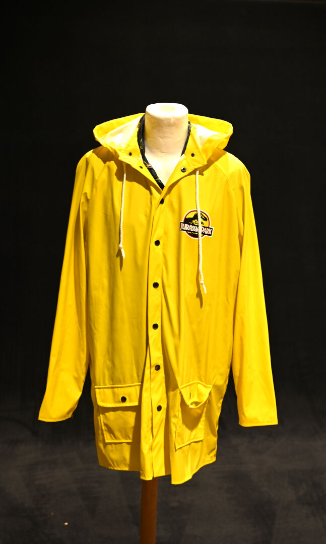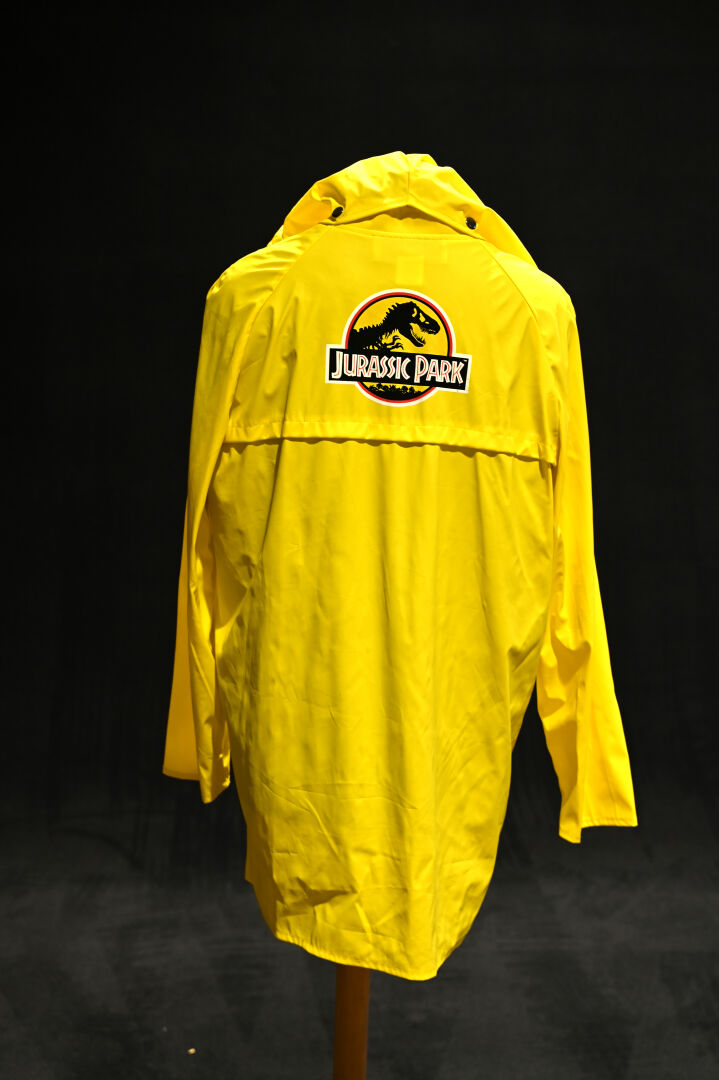 JURASSIC PARK. Costume du personnage Dennis Nedry, comprenant un imperméable jaune, une chemise à fleurs, des lunettes et un badge. Taille XL. Long. de l’imperméable : 95 cm.