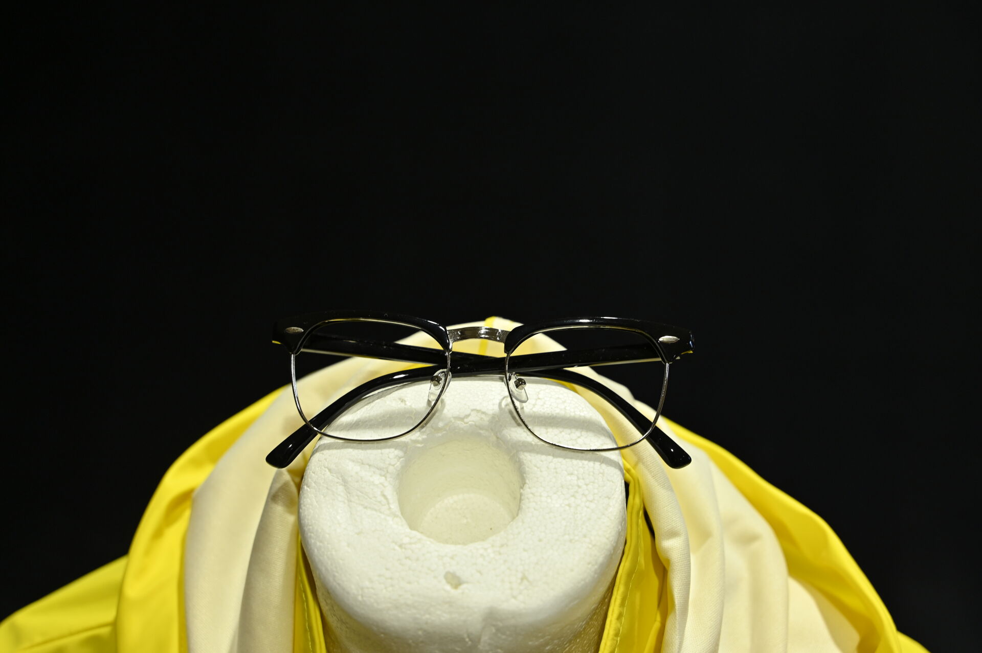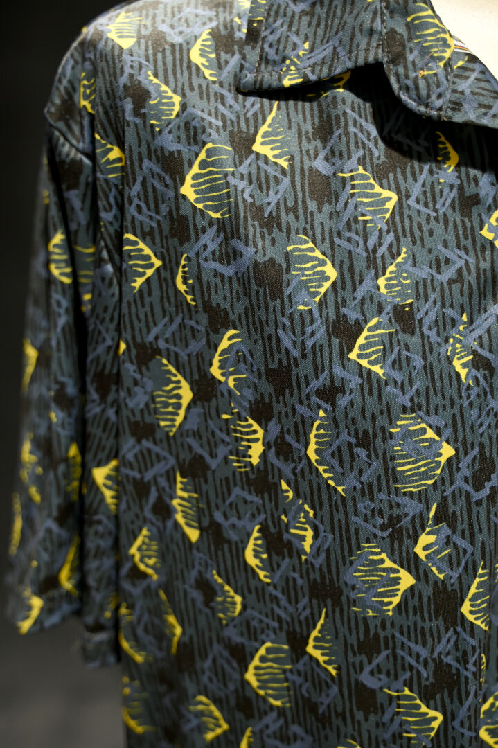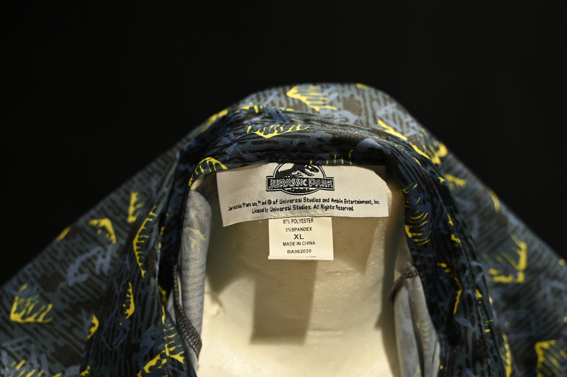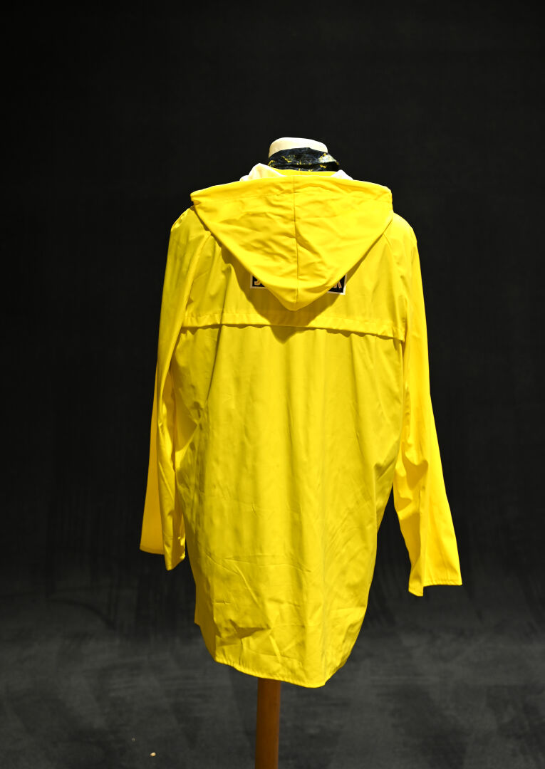 JURASSIC PARK. Costume du personnage Dennis Nedry, comprenant un imperméable jaune, une chemise à fleurs, des lunettes et un badge. Taille XL. Long. de l’imperméable : 95 cm.