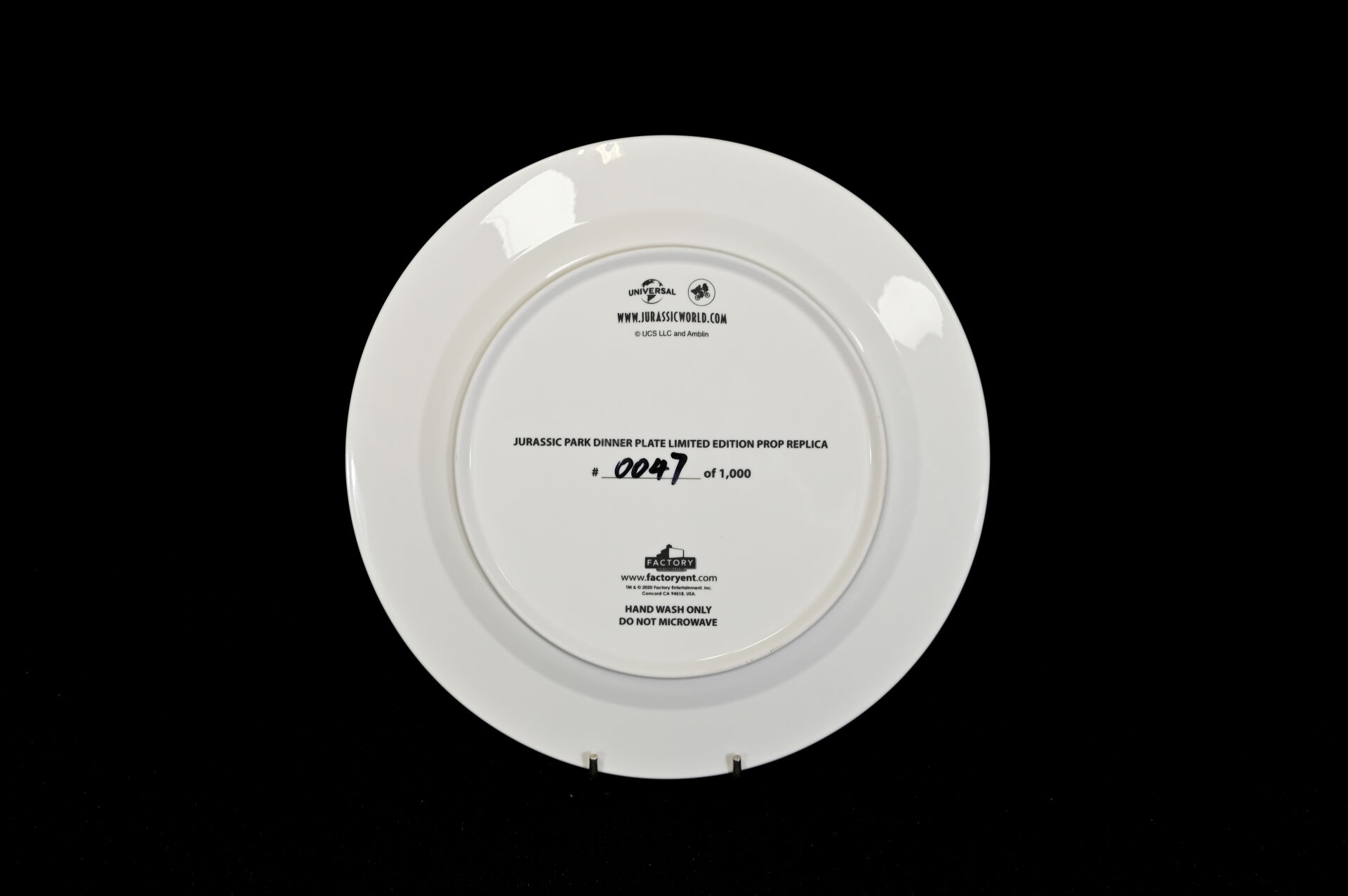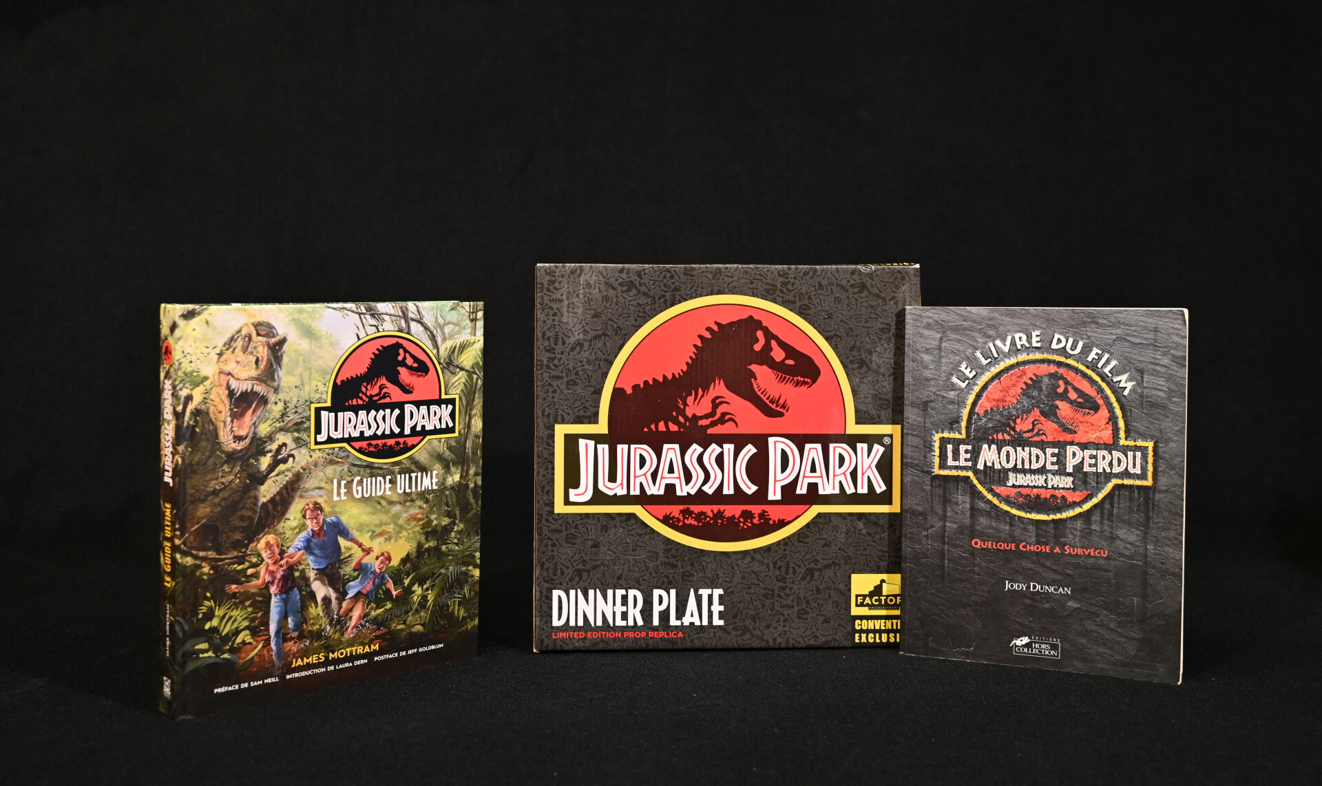 JURASSIC PARK – FACTORY ENTERTAINMENT. Une assiette édition limitée avec liseré doré (boite abîmée). Numérotée 0047/1000. Diam. : 27 cm. On joint le livre « Jurassic Park – Le Guide Ultime » de James Mottram Insight Éditions 2023, et le livre « Le Monde Perdu Jurassic Park – Quelque chose a survécu » de Jody Duncan Éditions Hors Collection.