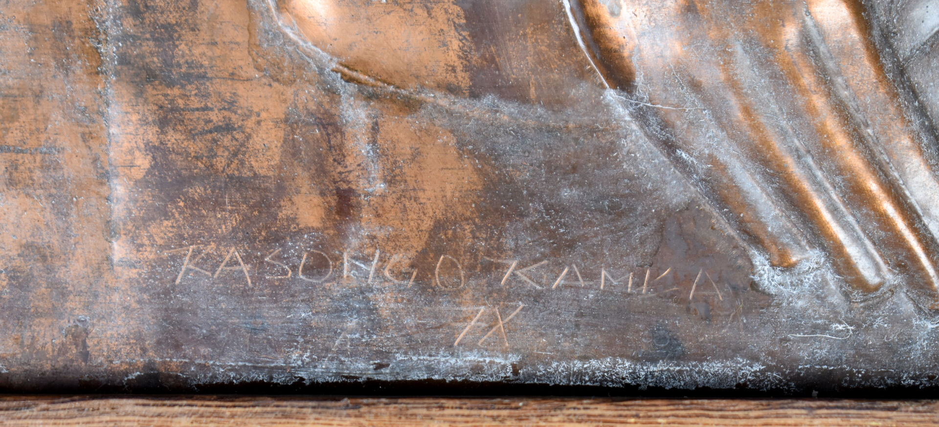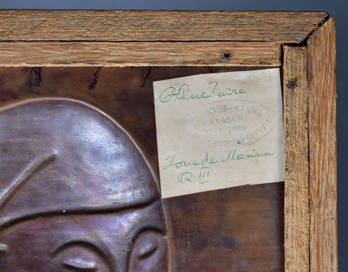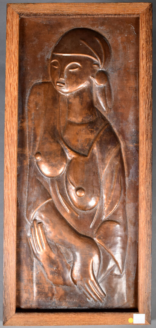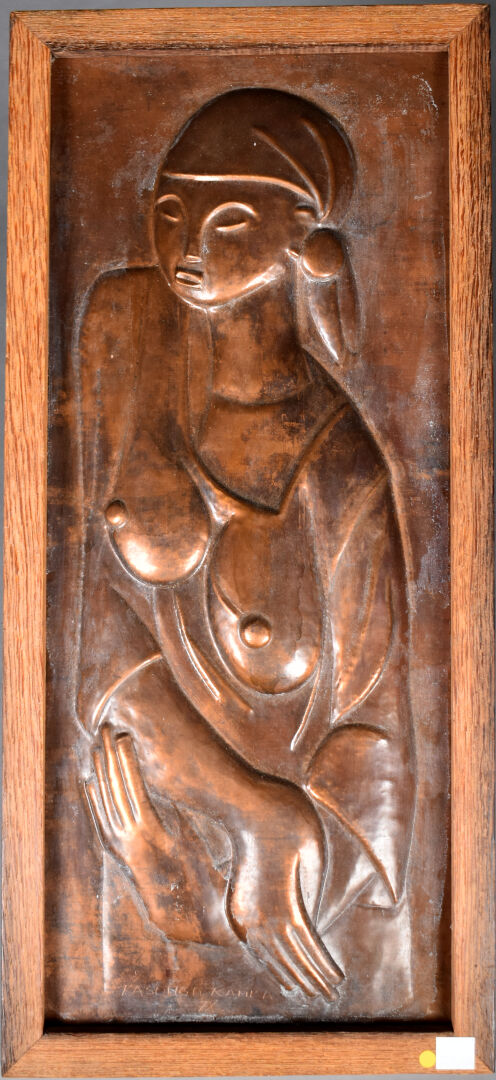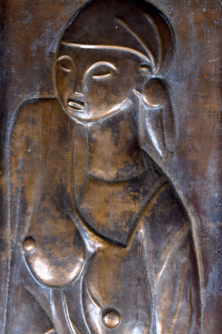 KASONGO KAMBA (XXe siècle). Panneau de cuivre à décor d’une femme travaillé au repoussé. Signé et daté 1978 en bas. République du Zaïre. 53 x 23 cm.