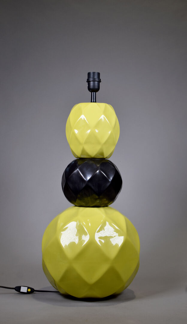 KERIA Lampe à poser en céramique à trois sphères facettées émaillée jaune citron et noir métallisé. Haut. : 72 cm.