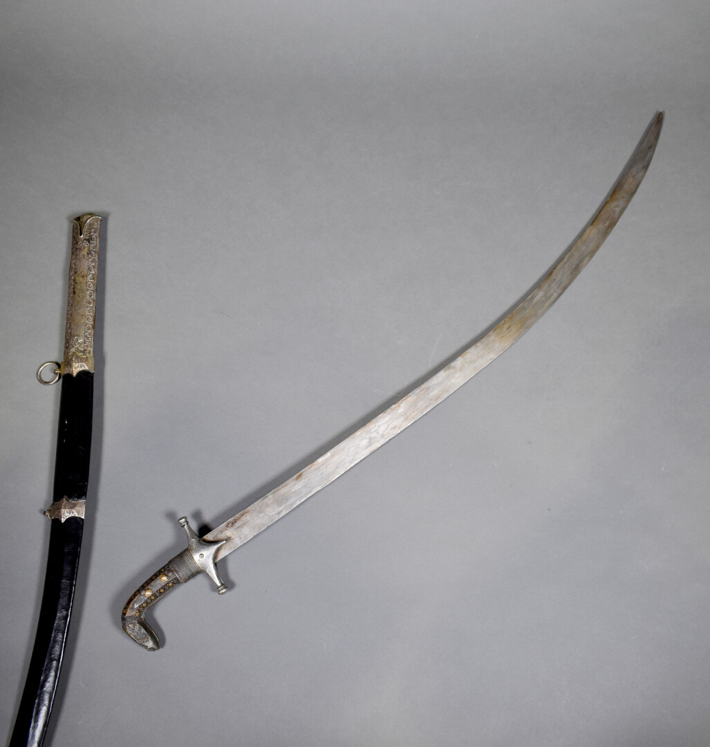 Kilij ottoman, forte lame de 830 mm de long. Poignée en crosse en corne (?) incrustée de décors en laiton. Virole basale constituée d’un enroulement de filigrane, garde symétrique à oreillons en métal blanc dans un fourreau à garniture d’argent. Âme bois et cuir noir. XIXeme siècle. État 2