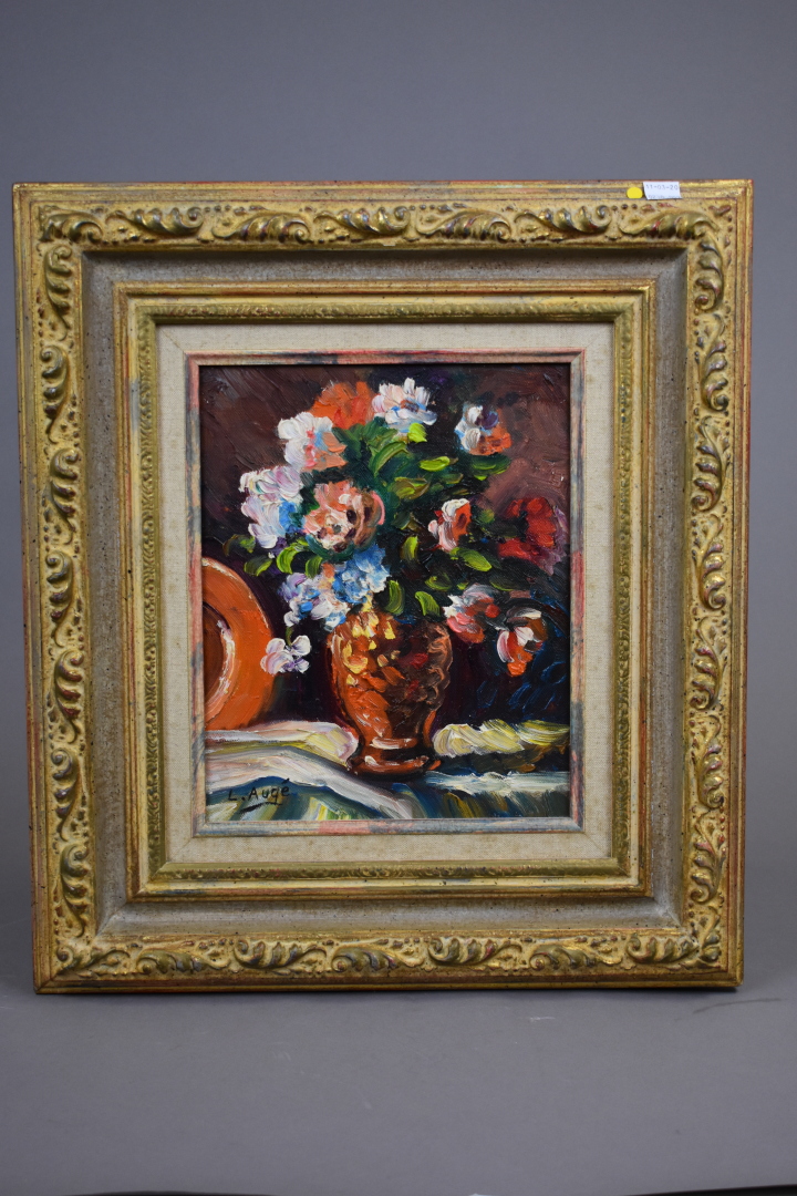 L. AUGE (XXe siècle). Deux bouquets de fleurs. Deux huiles, une signée en bas à droite l’autre en bas à gauche. 27,5 x 22,5 cm.