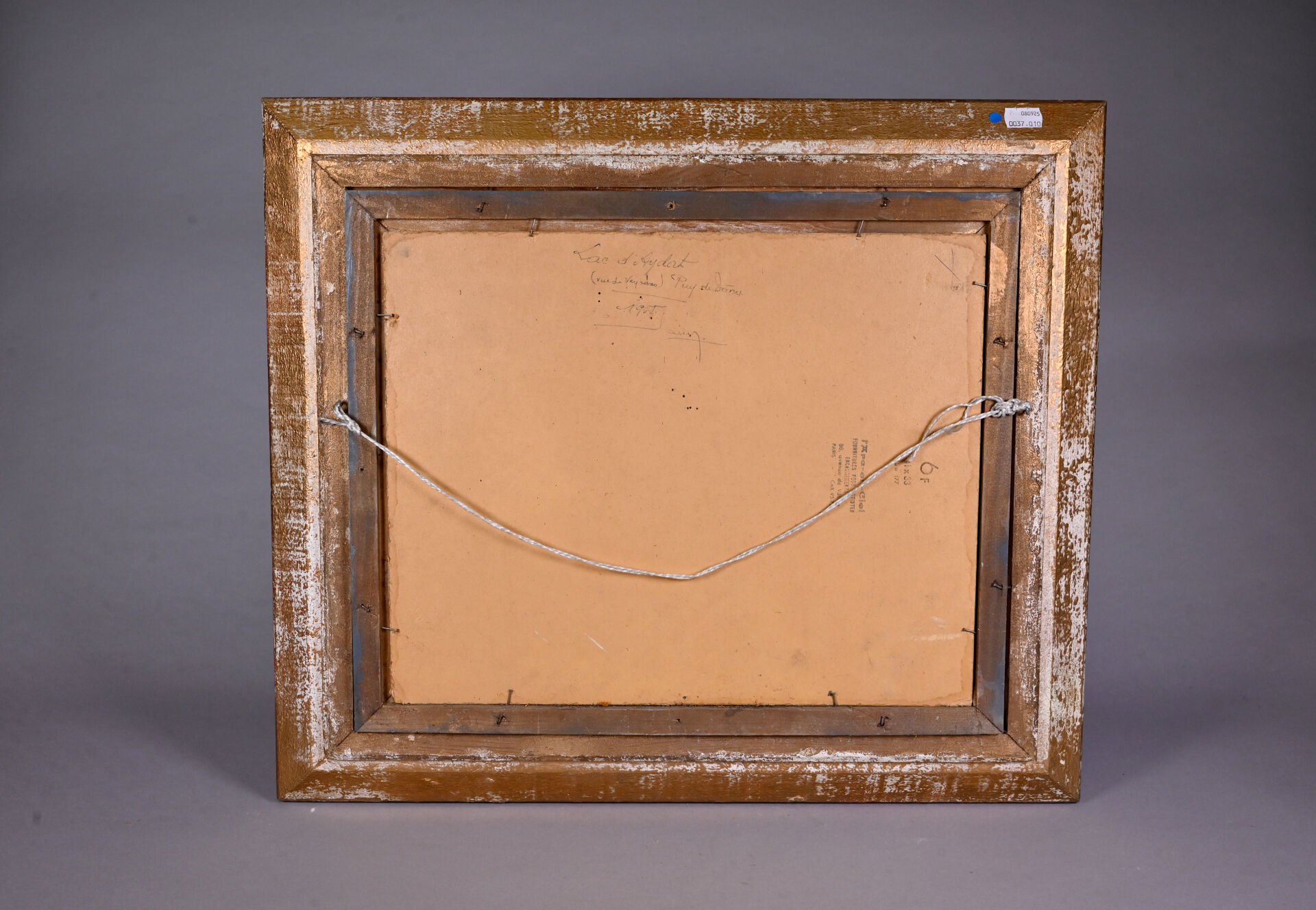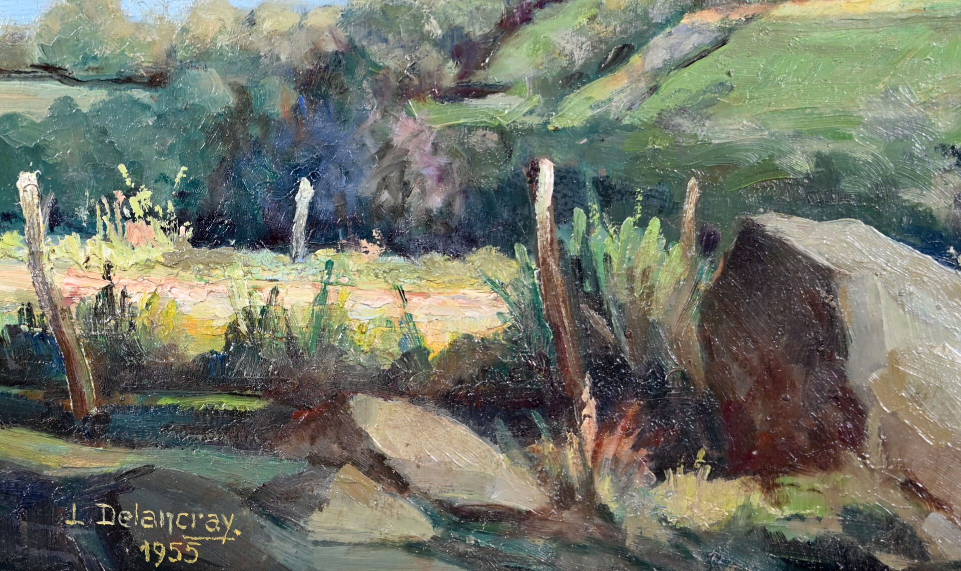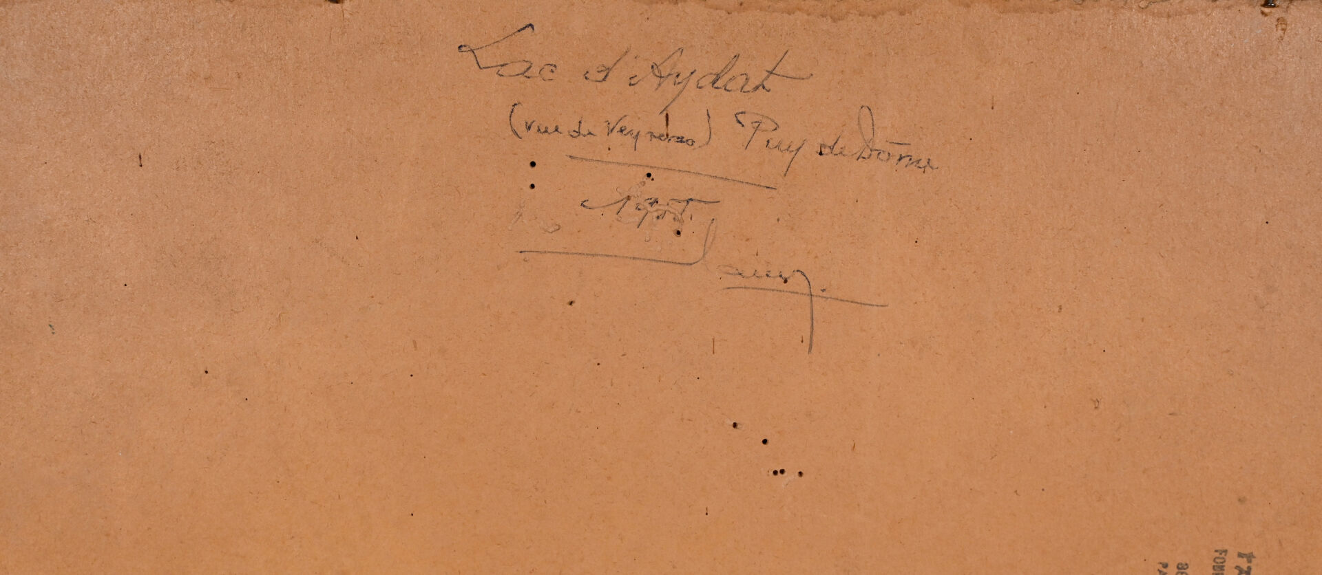L. DELANCRAY (XXe siècle). Lac d’Aydzt (Puy de Dôme). Huile sur carton signée et datée 1955 en bas à gauche, contre signée et datée au dos. 33 x 41 cm.