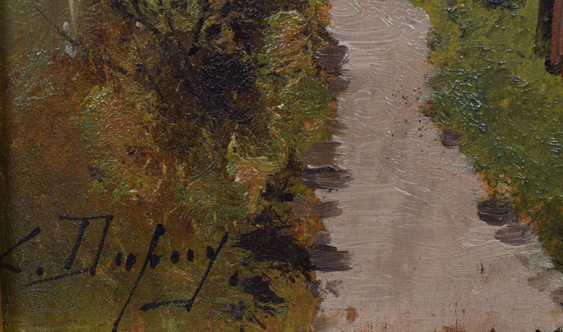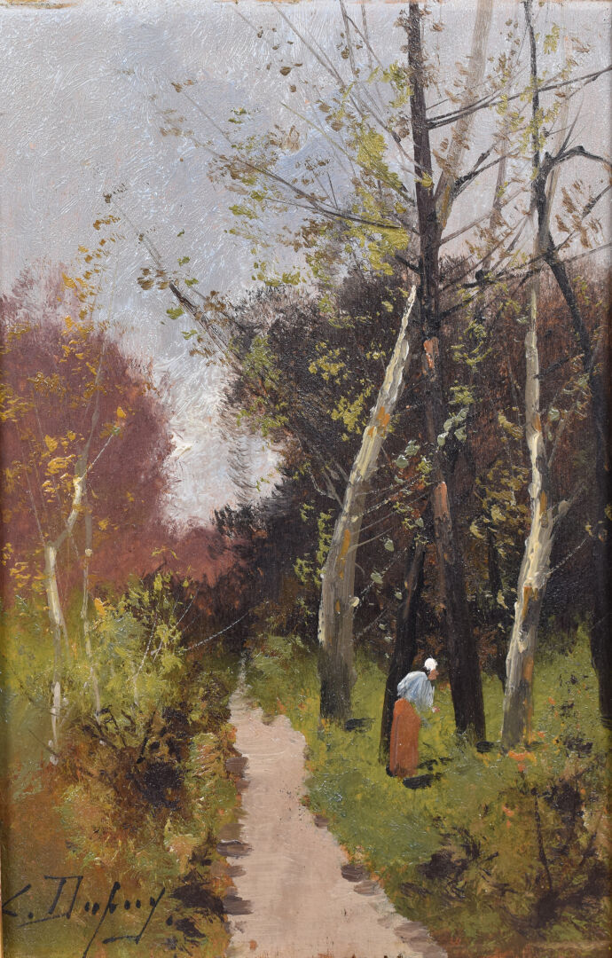 L. DUPUY – Eugène GALIEN-LALOUE (1854-1941) ? Clairière au chemin. Huile sur panneau signée en bas à gauche. 24 x 16 cm.