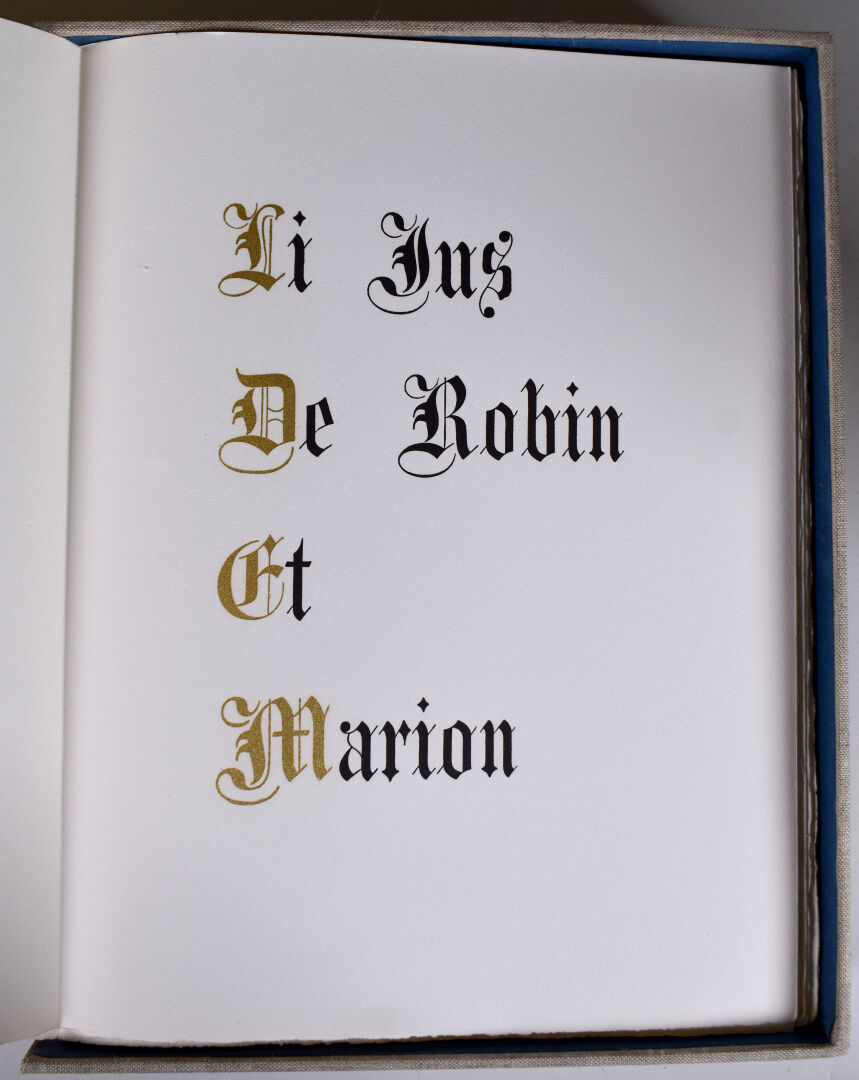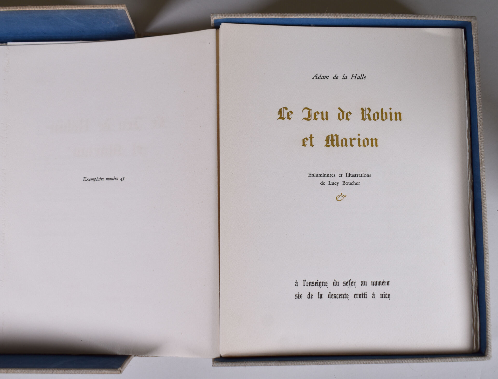 LA HALLE (Adam de). LE JEU DE ROBIN ET MARION. Nice, À l’enseigne du Sefer, 1962. In-folio en ff., boîte-écrin illustrée de l’éditeur. ÉDITION ILLUSTRÉE de compositions en couleurs (enluminures, miniatures, illustrations) par Lucy BOUCHER. Tirage limité à 140 EXEMPLAIRES imprimés sur vélin Docelles à la cuve réservés aux « Bibliophiles de la Librairie Anavoizard ». UN des 100 numérotés de 41 à 140 contenant un DESSIN ORIGINAL couleurs à pleine page signé de l’artiste. Déposé chez l’expert le 22/07.