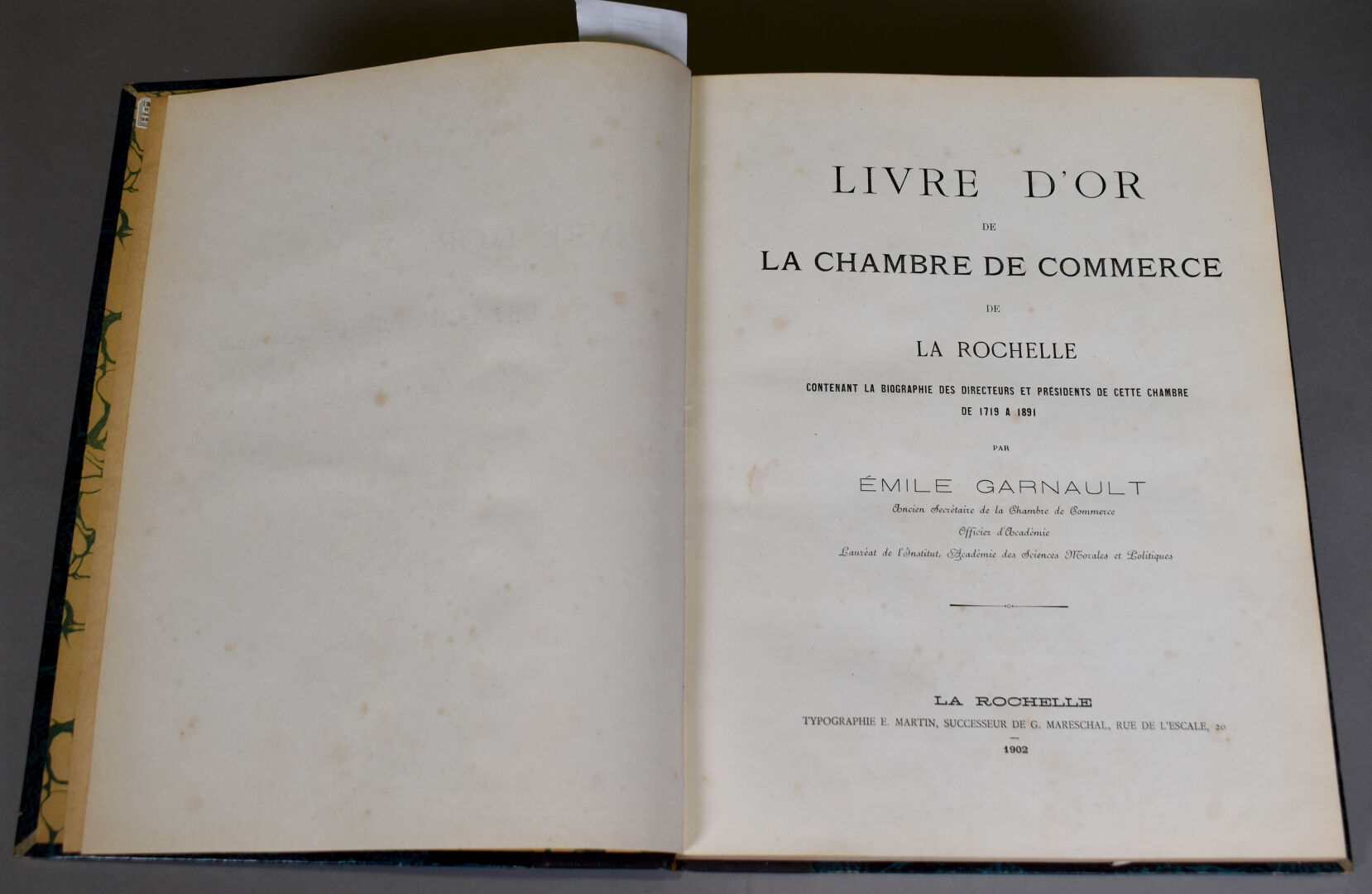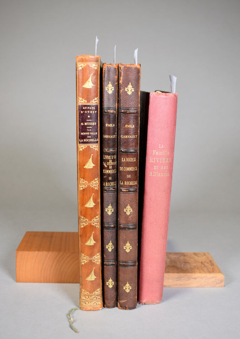 LA ROCHELLE. Suite de 3 ouvrage soit : La bonne ville de la Rochelle du présent au passé – Georges MUSSET – FOUCHER Editeur 1912 – Livre d’Or de la chambre de commerce de la Rochelle – Emile Garnault – 1902 – La juridiction consulaire et la Bourse de commerce de la Rochelle – Emile Garnault – La Rochelle 1896. On joint La famille Rivière – de Mauzé et La Rochelle et ses alliances Par Louis Rivière – Paris juin 1921.
