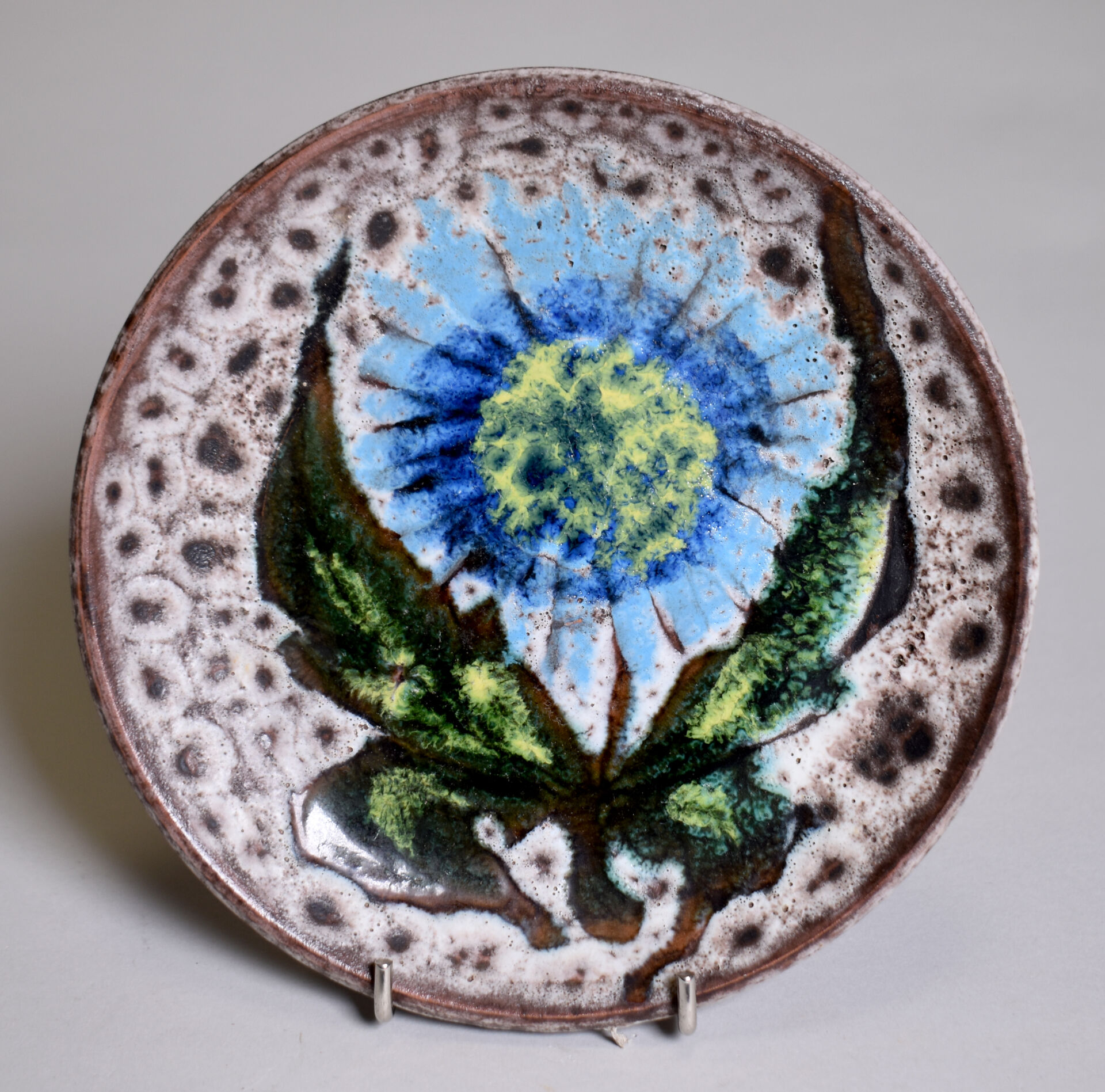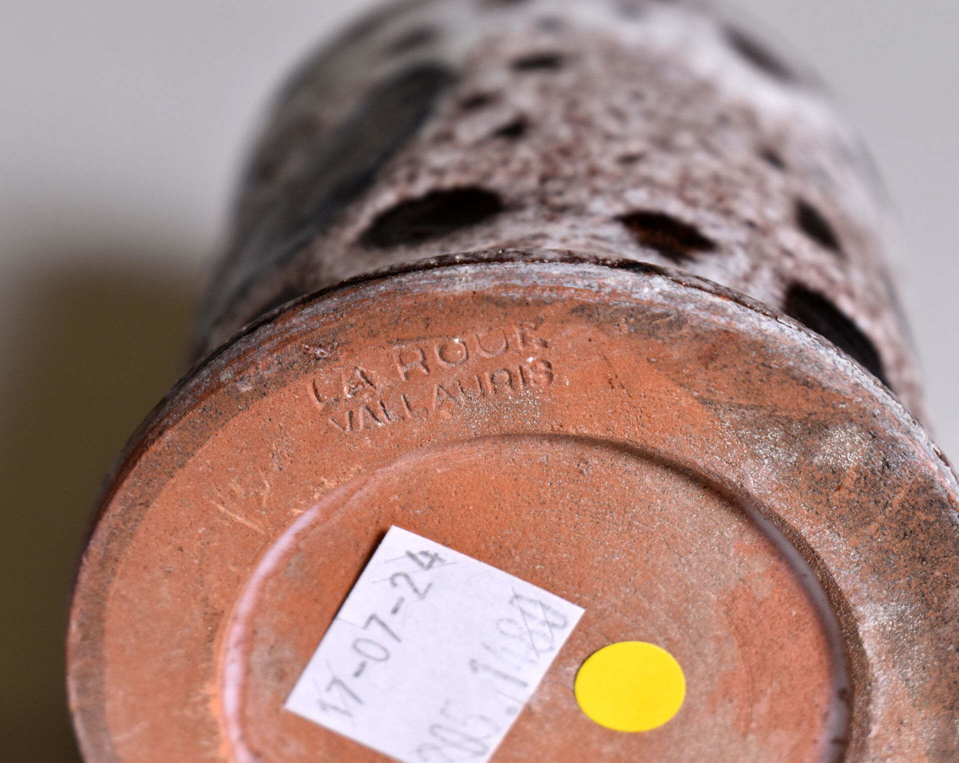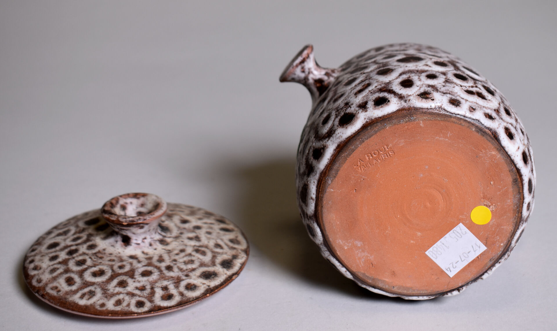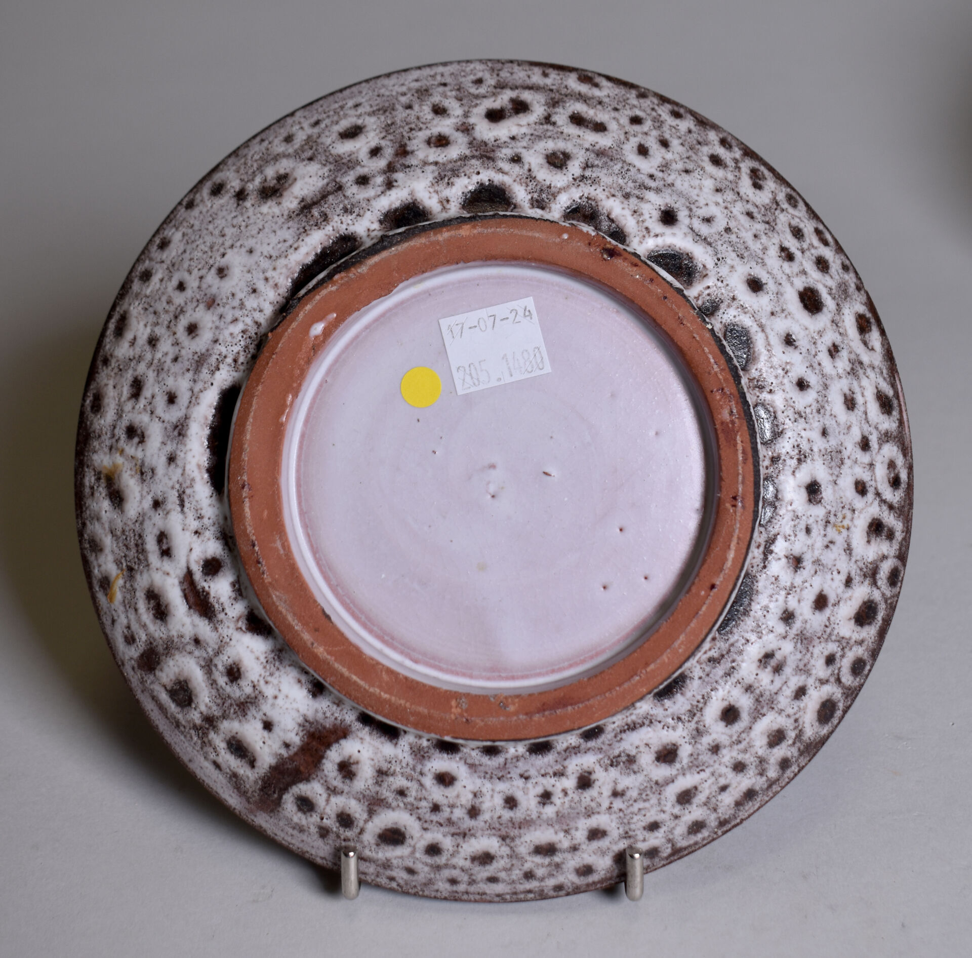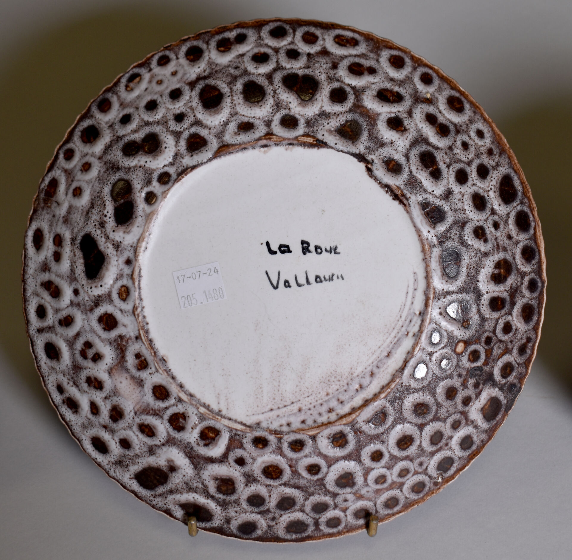 LA ROUE à VALLAURIS. Partie de service de table en céramique émaillée en polychromie de fleurs sur fond moucheté crème et brun comprenant une assiette plate, deux petites assiettes, et deux pots couverts (un avec un éclat à l’intérieur du col). Certaines marquées. Diam. de l’assiette : 24 cm.