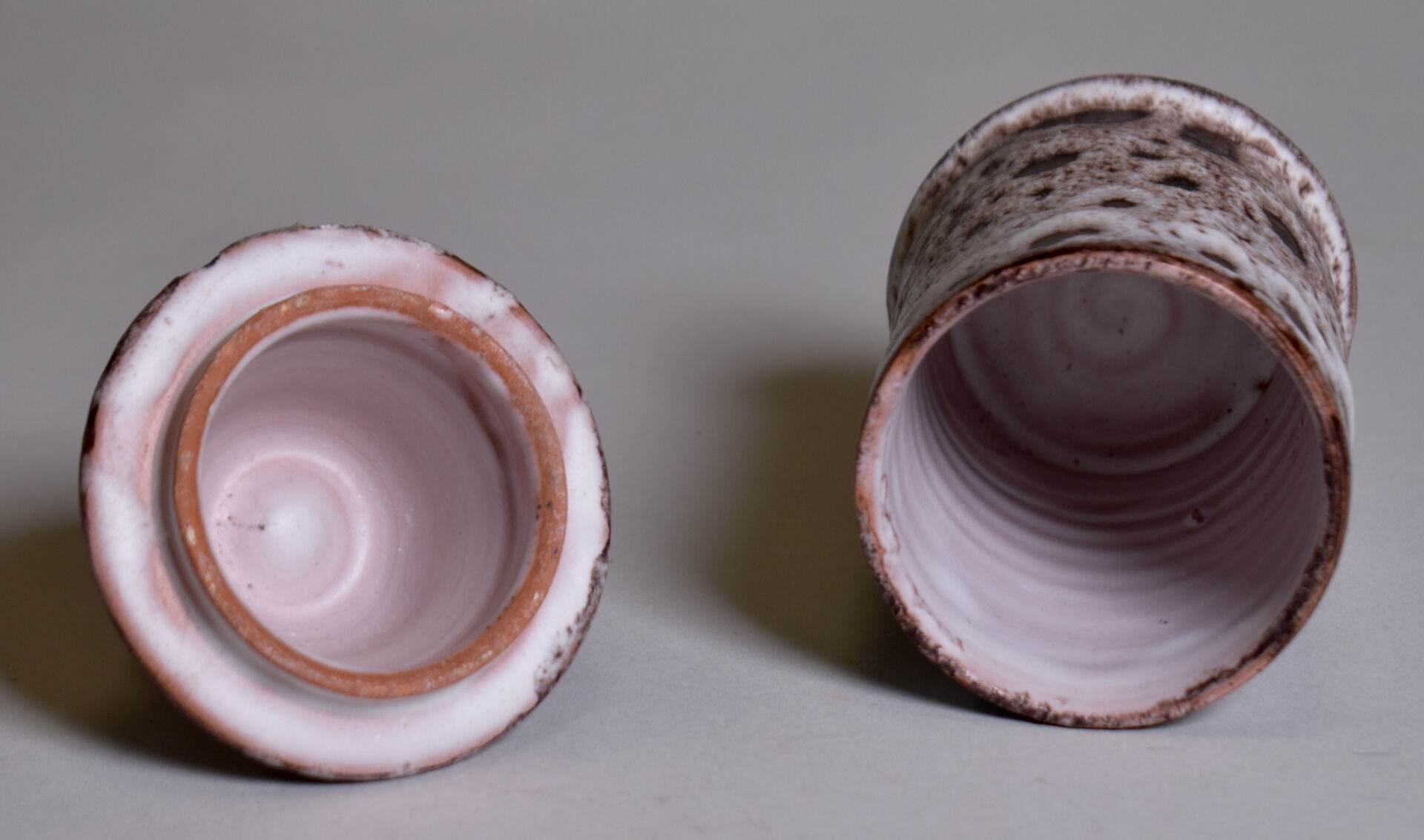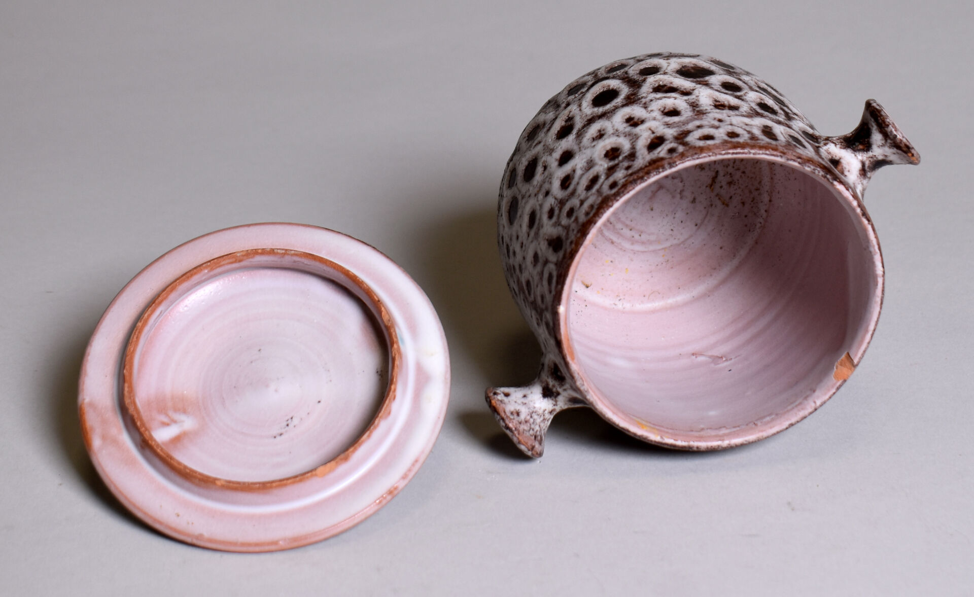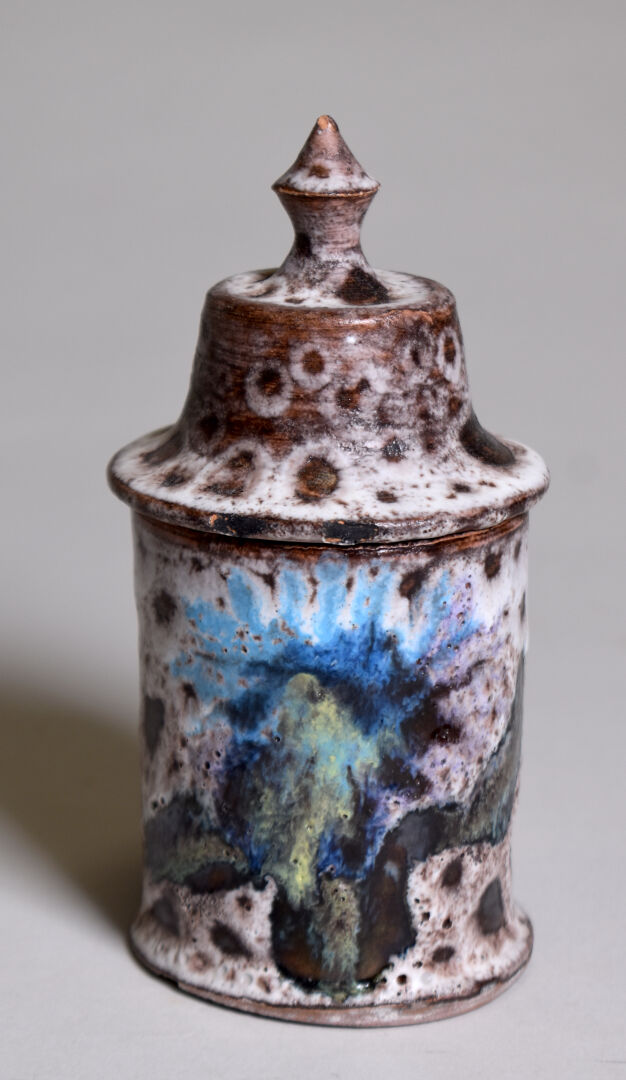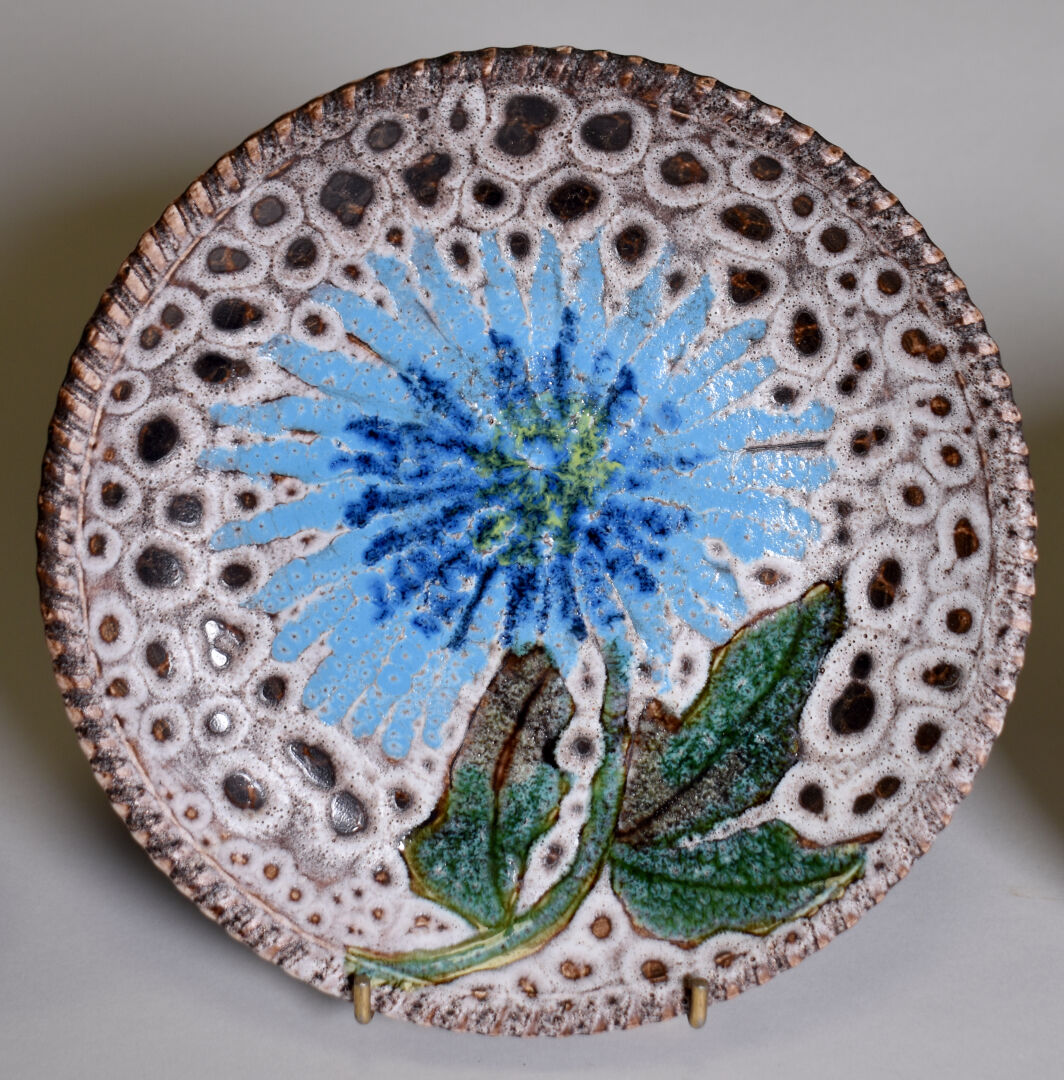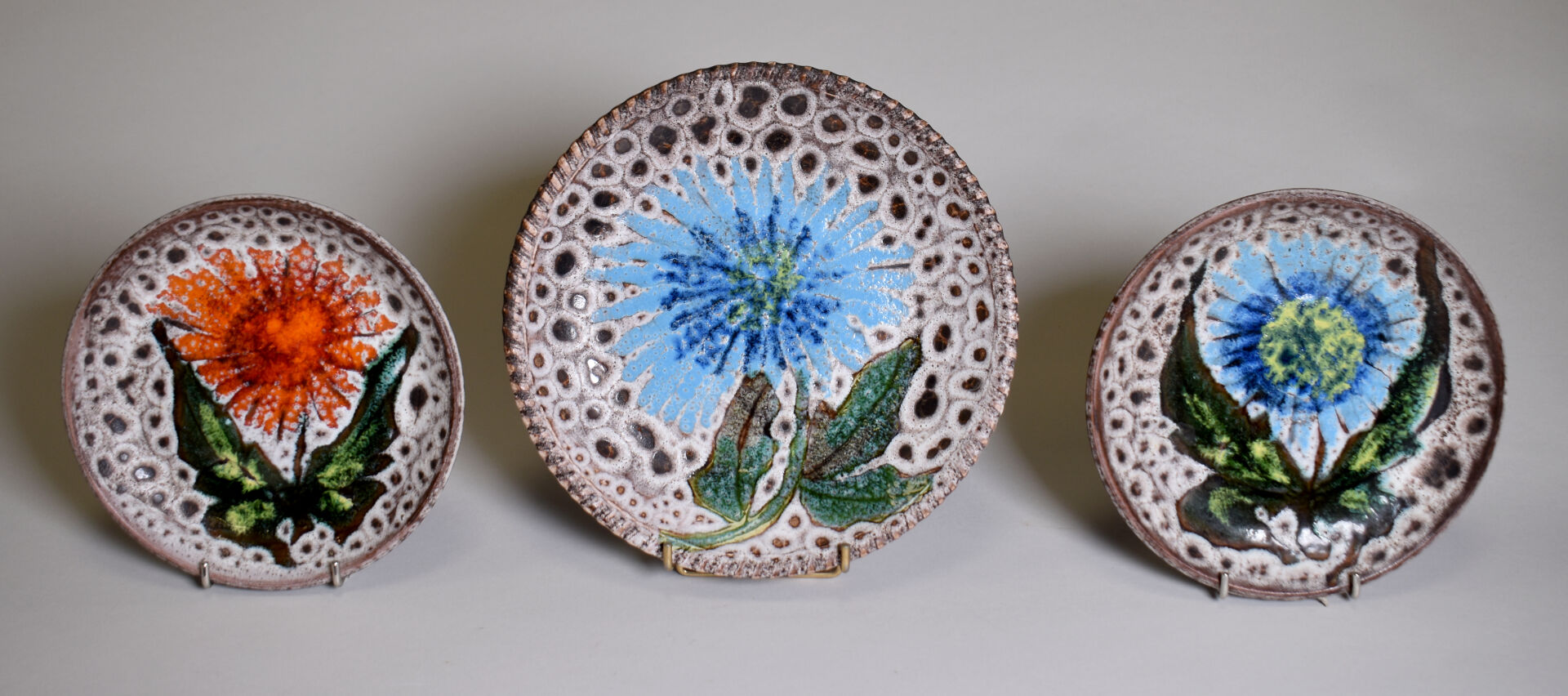 LA ROUE à VALLAURIS. Partie de service de table en céramique émaillée en polychromie de fleurs sur fond moucheté crème et brun comprenant une assiette plate, deux petites assiettes, et deux pots couverts (un avec un éclat à l’intérieur du col). Certaines marquées. Diam. de l’assiette : 24 cm.