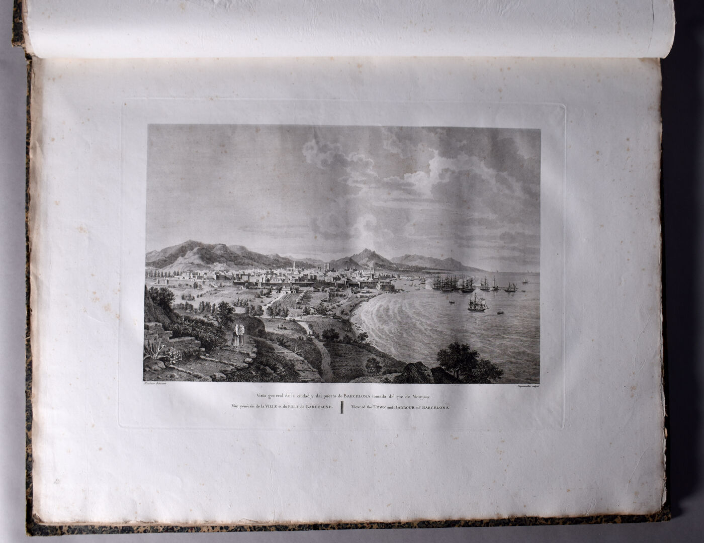 LABORDE (Alexandre de). VOYAGE PITTORESQUE ET HISTORIQUE DE L’ESPAGNE. P., Pierre Didot l’aîné, 1806-1820. Deux tomes en quatre volumes in-plano (480 X 645 mm) reliure cartonnée de papier marbré, dos lisse, pièce de titre papier (Reliure de l’époque). Tome I, 1ère partie : Un titre illustré, XLVI pages (dont faux-titre et titre illustré de 2 petites vignettes gravées), 72 pages, 61 planches hors-texte, (1) f. de table des matières – Tome I, 2nde partie : (2) ff. de faux-titre et titre illustré d’une vignette gravée, 73-132 pages (table des matières comprise), 76 planches hors-texte – Tome II, 1ère partie : (2) ff. de faux-titre et titre illustré d’une grande vignette gravée, XLV pages, 33 pages, 79 planches hors-texte, (1) f. de table des matières – Tome II, 2nde partie : (2) ff. de faux-titre et titre illustré de deux petites vignettes gravées, XCI pages, 38 pages dont table des matières, 55 planches hors-texte. Cerne de mouillure en tête d’une partie des feuillets de la 2nde partie du tome I, rousseurs éparses, manque en tête du dos de 3 volumes, un mors entièrement fendu, fentes à quelques mors. ÉDITION ORIGINALE de ce « magnifique ouvrage » (Brunet), le plus important publié au XIXe siècle sur l’Espagne. Il contient en FRONTISPICE du tome I un titre général illustré, 271/272 PLANCHES hors-texte de gravures dessinées et gravées sur acier par les plus grands artistes de l’époque et 2 CARTES doubles de l’Espagne et du Portugal. [MANQUENT le portrait et 1 planche hors-texte]. Publié en 48 livraisons pendant 14 ans, cet ouvrage est souvent incomplet d’une partie des planches. SÉDUISANT EXEMPLAIRE en modeste reliure d’attente de l’époque mais au corps d’ouvrage non rogné, tel que paru, avec ses belles marges conservées, CONDITION RARE. ¶ Brunet III, 713 – Palau, 128975 : « Magnífica publicación » – Vicaire, IV, 742.