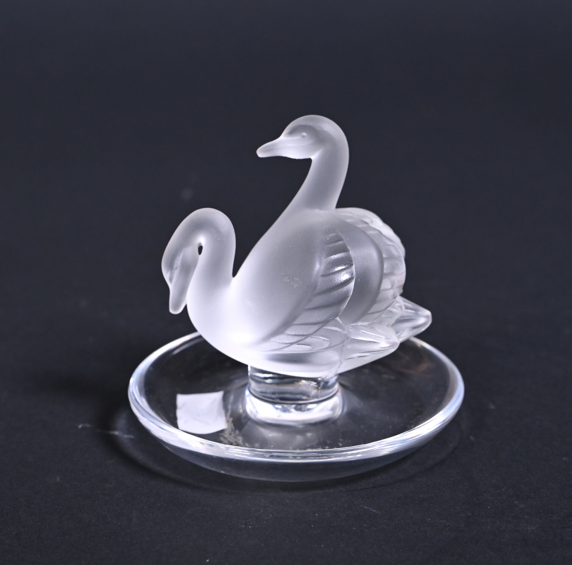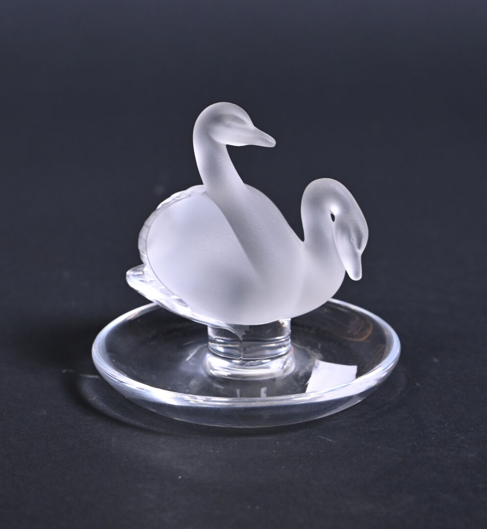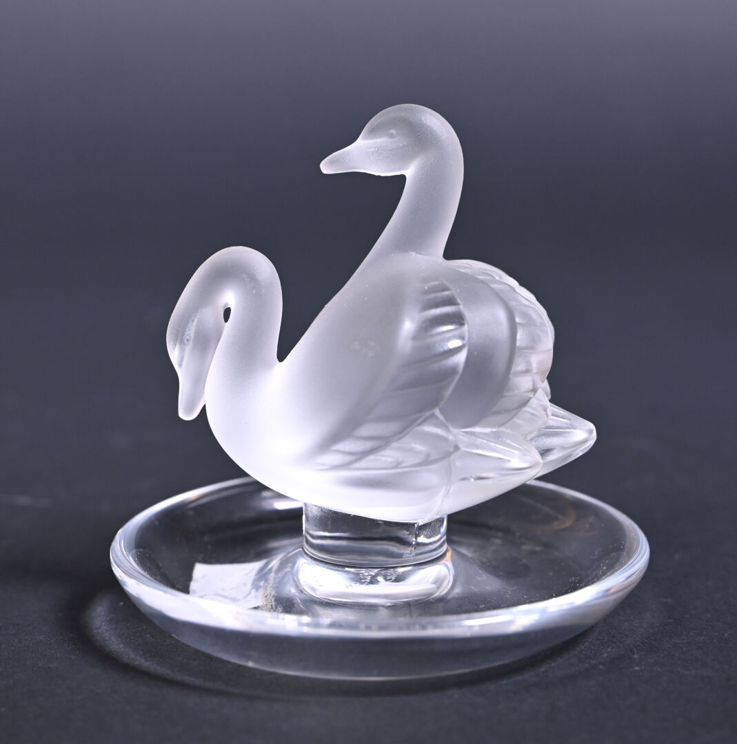 LALIQUE FRANCE. Baguier en cristal partiellement dépoli modèle « cygnes », signé au dessous. Haut. : 10 cm.