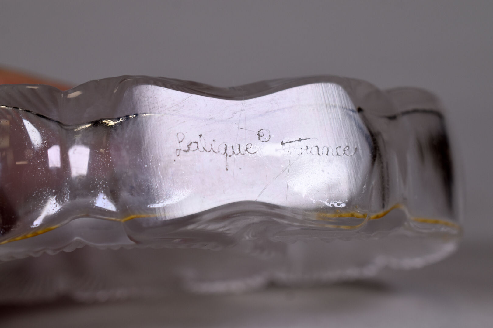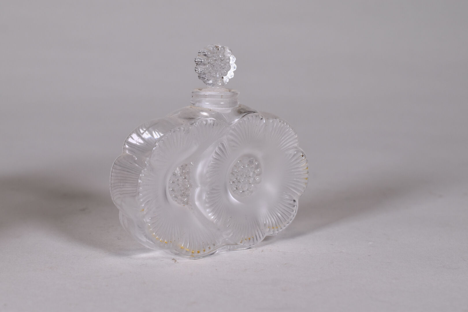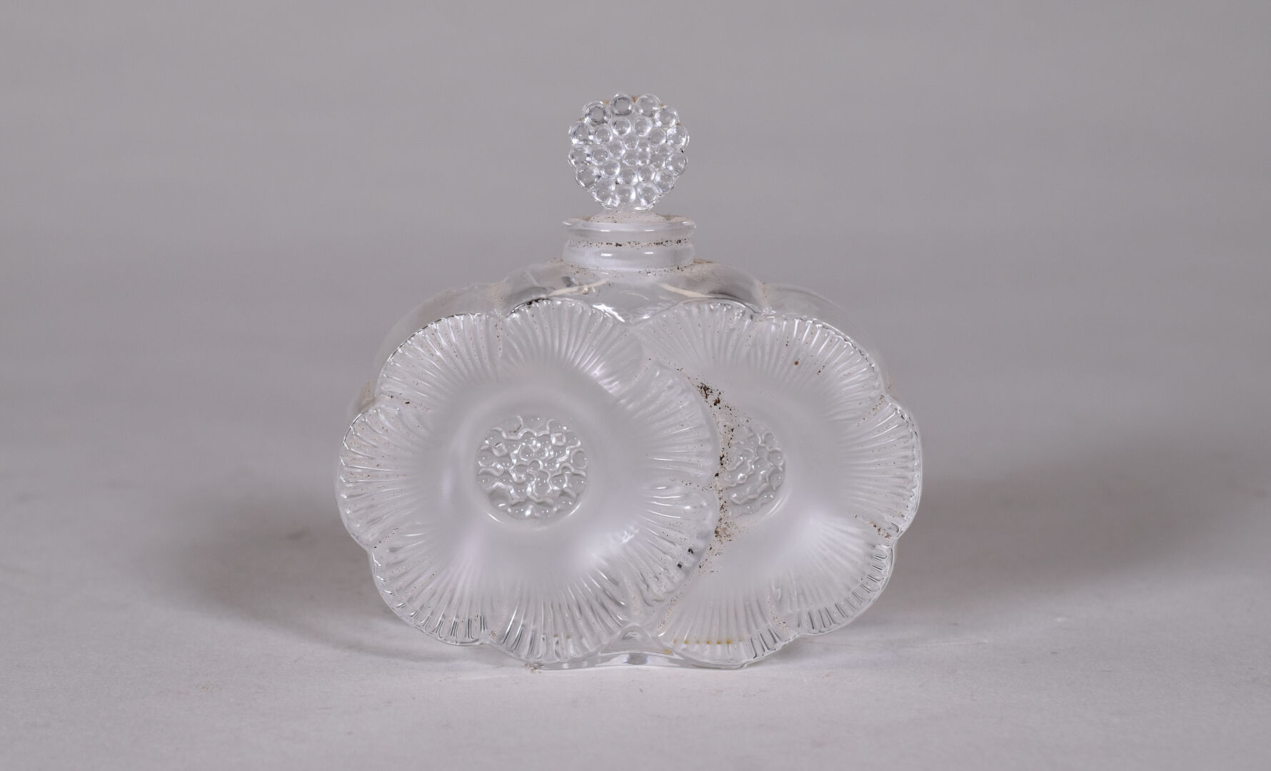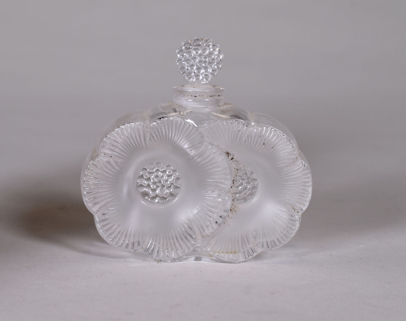 LALIQUE France. Flacon et bouchon modèle « Anémones », en cristal moulé pressé satiné. Signature à la pointe au dessous. Haut. : 9,5 cm.